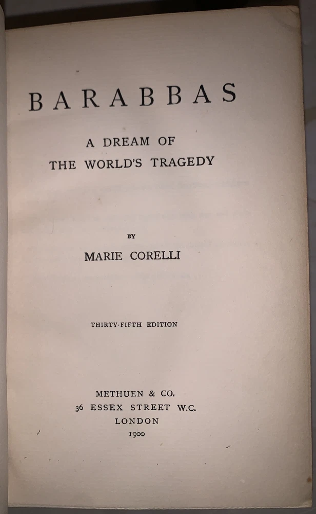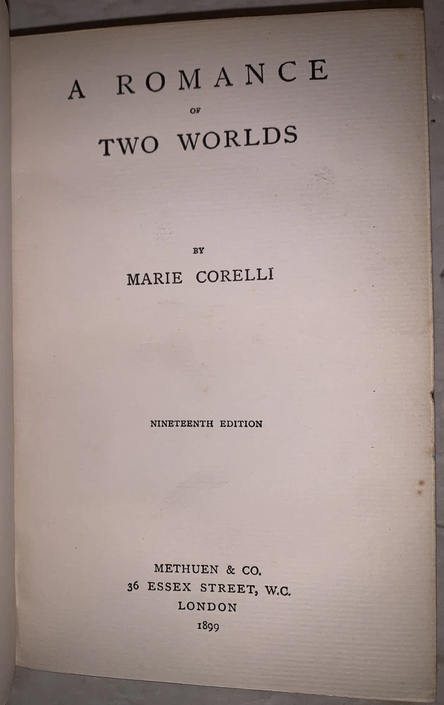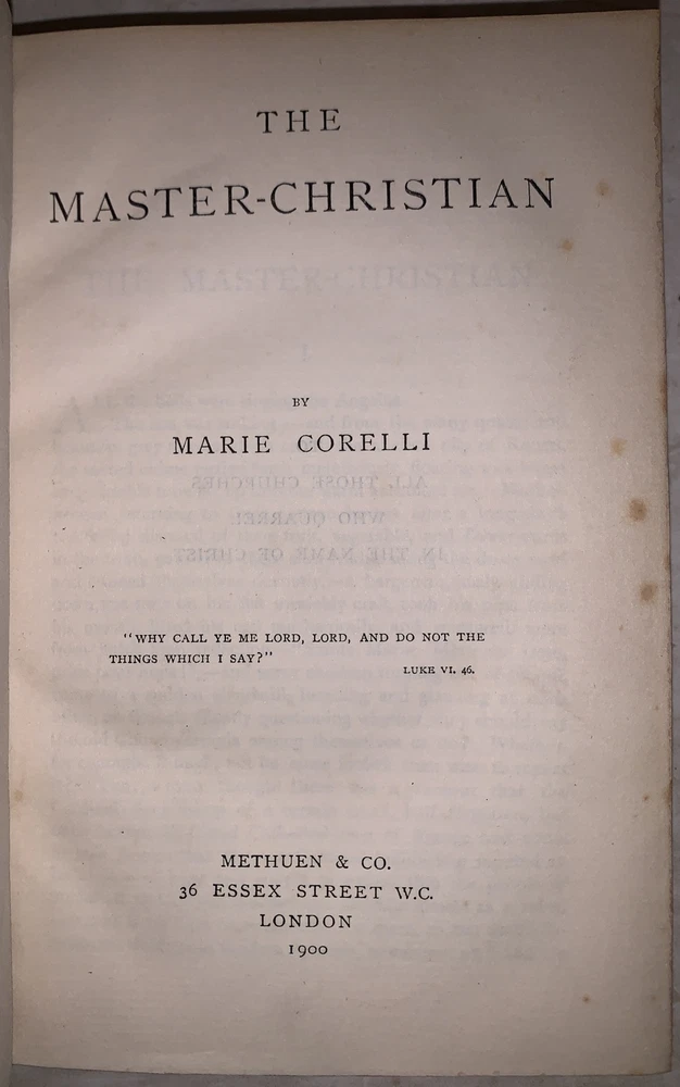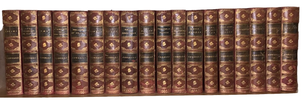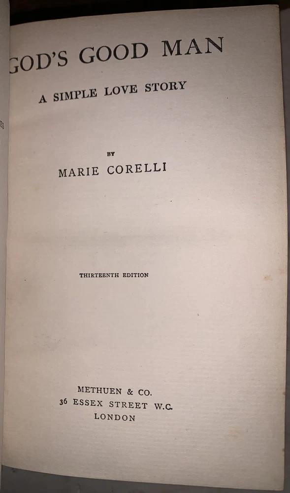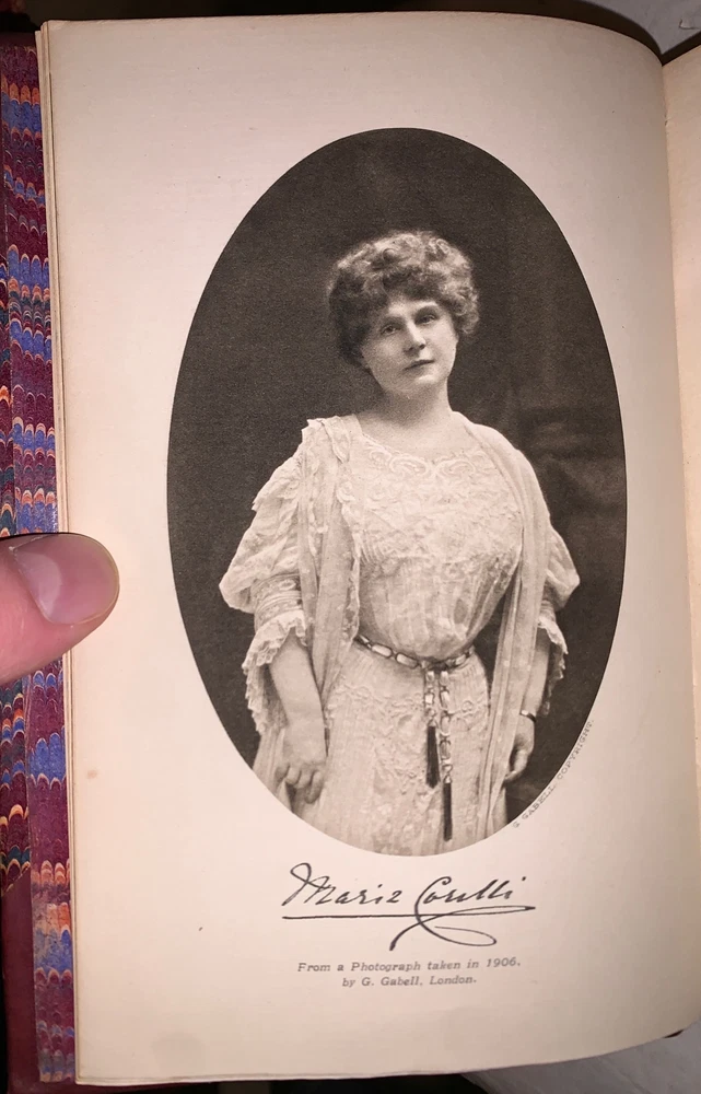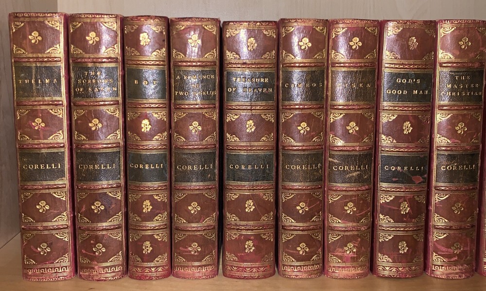 Finely bound set of 18 Marie Corelli books from the late 19th century, early 20th century. Including: 1: Thelma - A Norwegian Princess - 1900 - Twenty-Third Edition 2: The Sorrows of Satan, or The Strange Experience of One Geoffrey Tempest, Millionare, A Romance - 1899 - Fortieth Edition 3: Boy, A Sketch - Tenth Edition 4: A Romance of Two Worlds - 1899 - Nineteenth Edition 5: The Treasure of Heaven, A Romance of Riches - 1907 - Fourth Impression 6: Cameos, Short Stories 7: Ziska, The Problem of a Wicked Soul - 1897 8: God's Good Man, A Simple Love Story - Thirteenth Edition 9: The Master - Christian - 1900 10: "Temporal Power" A Study in Supremacy - 1902 11: The Murder of Delica - 1899 - New and Cheaper Edition (Fifty-eighth Thousand) 12: Holy Orders, The Tragedy of a Quiet Life 13: The Mighty Atom - Ninety-Fifth Thousand 14: The Soul of Lilith - 1897 - Ninth Edition 15: Wormwood, A Romance of Paris - 1900 - Tenth Edition 16: Barabbas, A Dream of the World's Tragedy - 1900 - Thirty-Fifth Edition 17: Vendetta!, or The Story of One Forgotten - 1900 - Sixteenth Edition 18: 'Ardath' The Story of a Dead Self - 1900 - Twelfth Edition All 18 are by Marie Corelli. Most are published in London by Methuen & Co. See photos. Each volume is beautifully bound in quarter red leather over marbled boards. Raised bands, gilt lettering and decoration to spines. Marbled endpapers and edges. Each with the previous owner's neat bookplate "Prospice Respice / Houndswood / St. Albans." Some slight rubbing and wear, spines slightly sunned, some slight damage to the spines of a couple volumes, some occasional foxing and discoloration, else in good + condition. If you have any questions, feel free to ask and don't forget to check out my other listings.