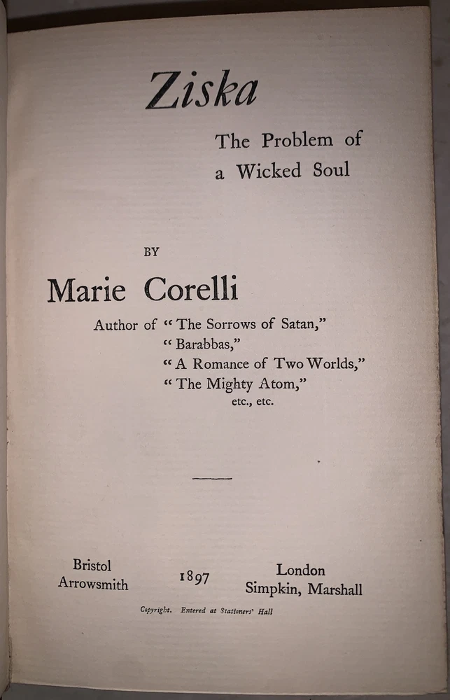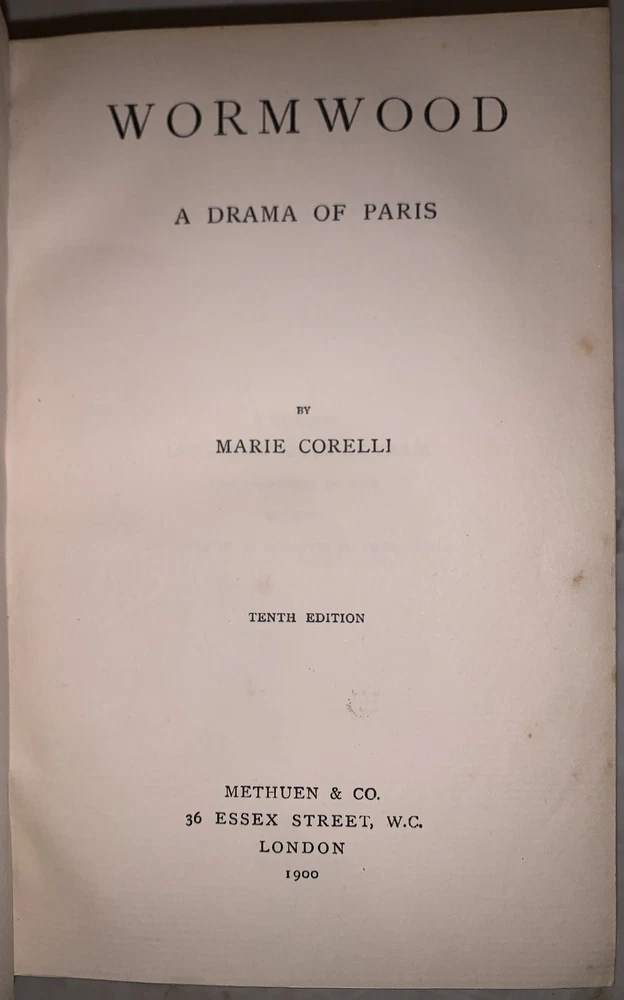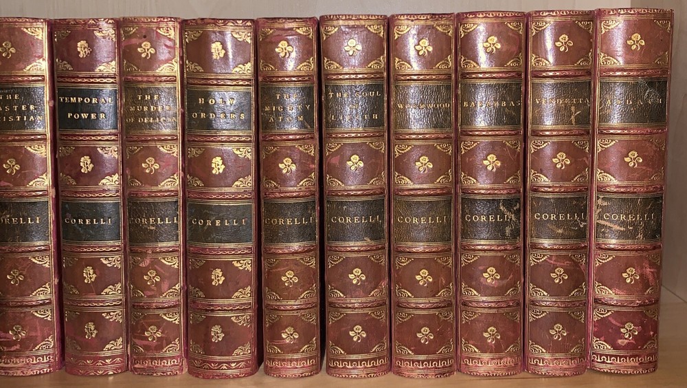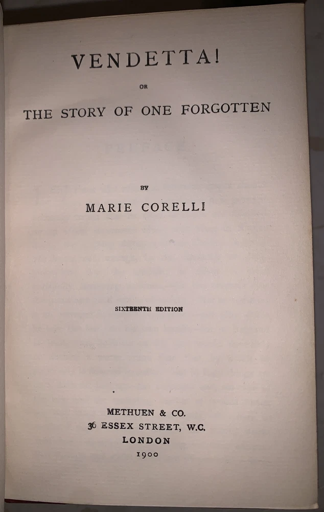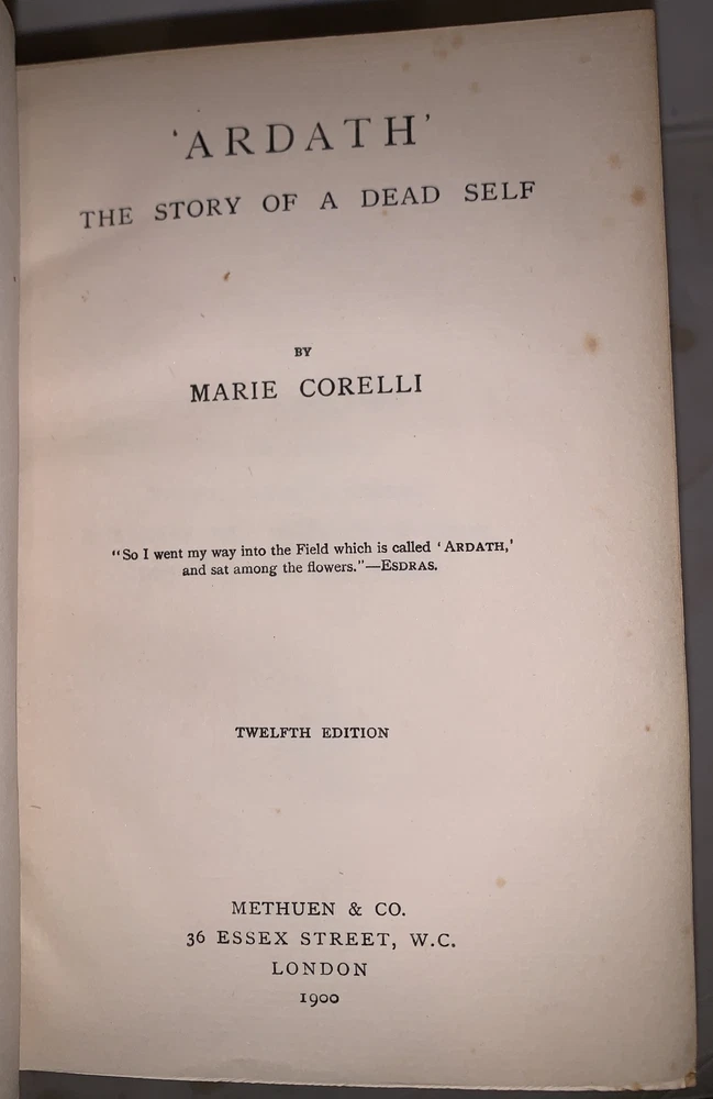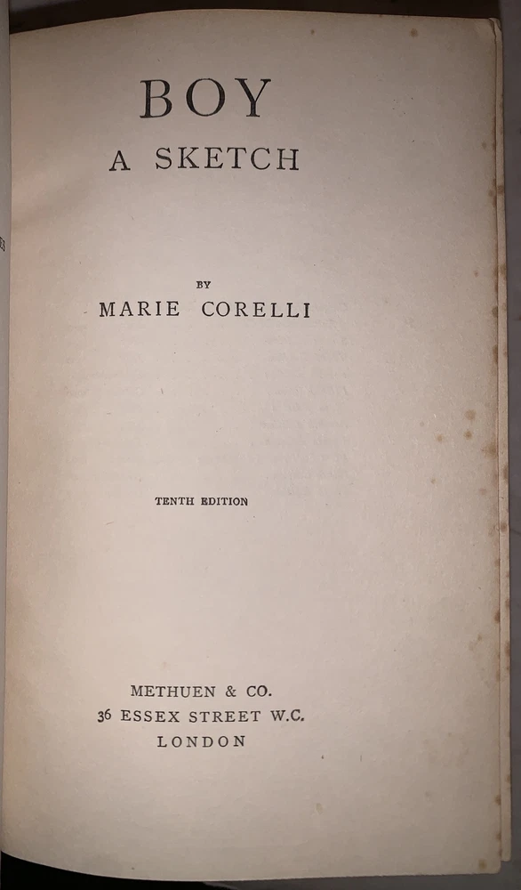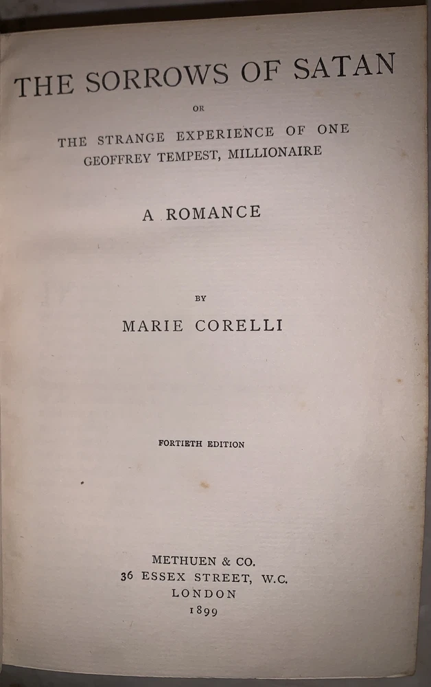 Finely bound set of 18 Marie Corelli books from the late 19th century, early 20th century. Including: 1: Thelma - A Norwegian Princess - 1900 - Twenty-Third Edition 2: The Sorrows of Satan, or The Strange Experience of One Geoffrey Tempest, Millionare, A Romance - 1899 - Fortieth Edition 3: Boy, A Sketch - Tenth Edition 4: A Romance of Two Worlds - 1899 - Nineteenth Edition 5: The Treasure of Heaven, A Romance of Riches - 1907 - Fourth Impression 6: Cameos, Short Stories 7: Ziska, The Problem of a Wicked Soul - 1897 8: God's Good Man, A Simple Love Story - Thirteenth Edition 9: The Master - Christian - 1900 10: "Temporal Power" A Study in Supremacy - 1902 11: The Murder of Delica - 1899 - New and Cheaper Edition (Fifty-eighth Thousand) 12: Holy Orders, The Tragedy of a Quiet Life 13: The Mighty Atom - Ninety-Fifth Thousand 14: The Soul of Lilith - 1897 - Ninth Edition 15: Wormwood, A Romance of Paris - 1900 - Tenth Edition 16: Barabbas, A Dream of the World's Tragedy - 1900 - Thirty-Fifth Edition 17: Vendetta!, or The Story of One Forgotten - 1900 - Sixteenth Edition 18: 'Ardath' The Story of a Dead Self - 1900 - Twelfth Edition All 18 are by Marie Corelli. Most are published in London by Methuen & Co. See photos. Each volume is beautifully bound in quarter red leather over marbled boards. Raised bands, gilt lettering and decoration to spines. Marbled endpapers and edges. Each with the previous owner's neat bookplate "Prospice Respice / Houndswood / St. Albans." Some slight rubbing and wear, spines slightly sunned, some slight damage to the spines of a couple volumes, some occasional foxing and discoloration, else in good + condition. If you have any questions, feel free to ask and don't forget to check out my other listings.