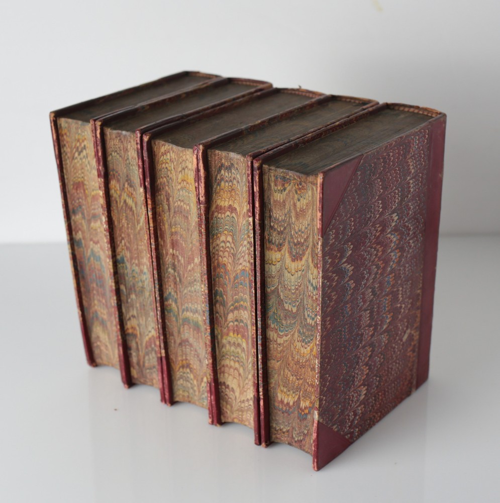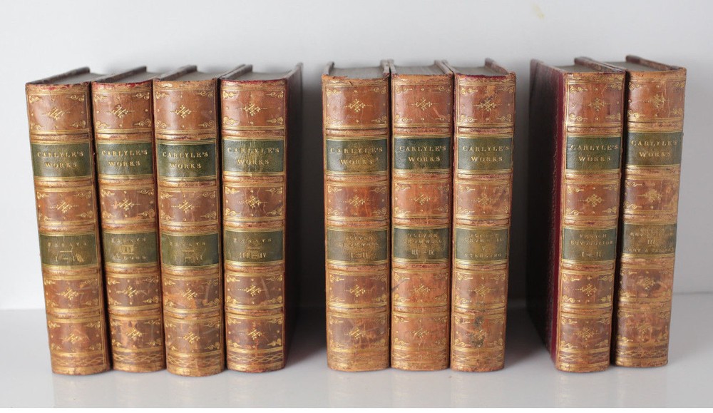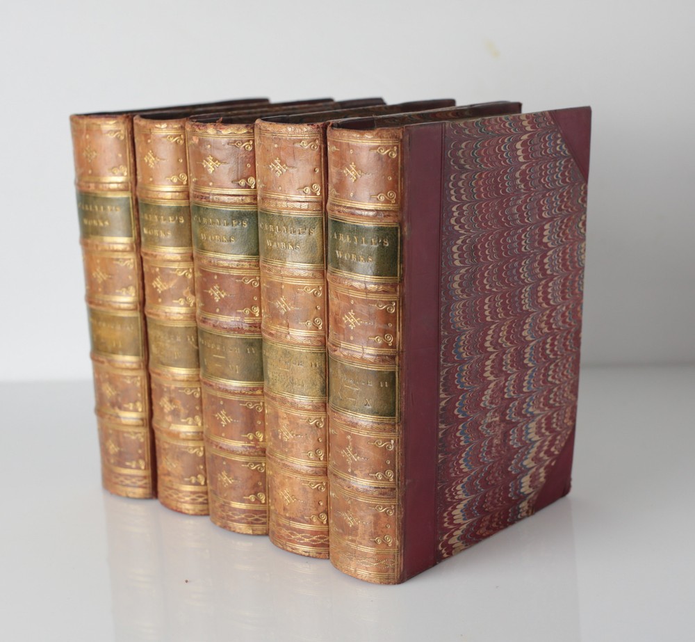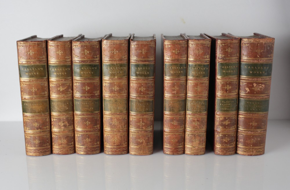 Item Description: 18 volume set, Thomas Carlyle, published London: Chapman and Hall, c1837-1874. 'Essays' (7 volumes in four); "Oliver Cromwell" (5 volumes in three); "Friedrich II" (10 volumes in five); Wilhelm Meister, (3 volumes in two); "French Revolution: (3 volumes in two); "Sartor Resartus" (1vol); "Tales by Musaeus, Tieck, Richter" and general index (1vol). Red half calf on marbled boards, gilt titles on labels and embellishments on the spine with raised bands. marbled end papers and edges. 18.5lbs phb865 Approx. Measurements: 4.875" x 6.75" Condition: Very good condition overall, sunned spines, some shelf wear, scattered edgewear, scratches and scuffs. Small tears to two pages of index volume, overall tight and clean. Scattered pencil notations, no bookplates. We have a fine selection of quality items for sale at Amphora Art & Antiques. International as well as domestic customers are welcome - please contact us with questions regarding shipping or listings, and we will assist you quickly. All items can be inspected in-person or are available for pickup from our large Wilmington, CA warehouse with no additional fee or charge. The authenticity of all items listed are guaranteed to be as represented - all efforts are taken to ensure accurate and descriptive condition reports and photographs. We reserve the right to use another shipping carrier other than what is listed to ensure your purchase arrives safely. Fedex cannot ship to a P.O. Box. Please contact us before or upon purchase if you have a preferred shipping carrier.