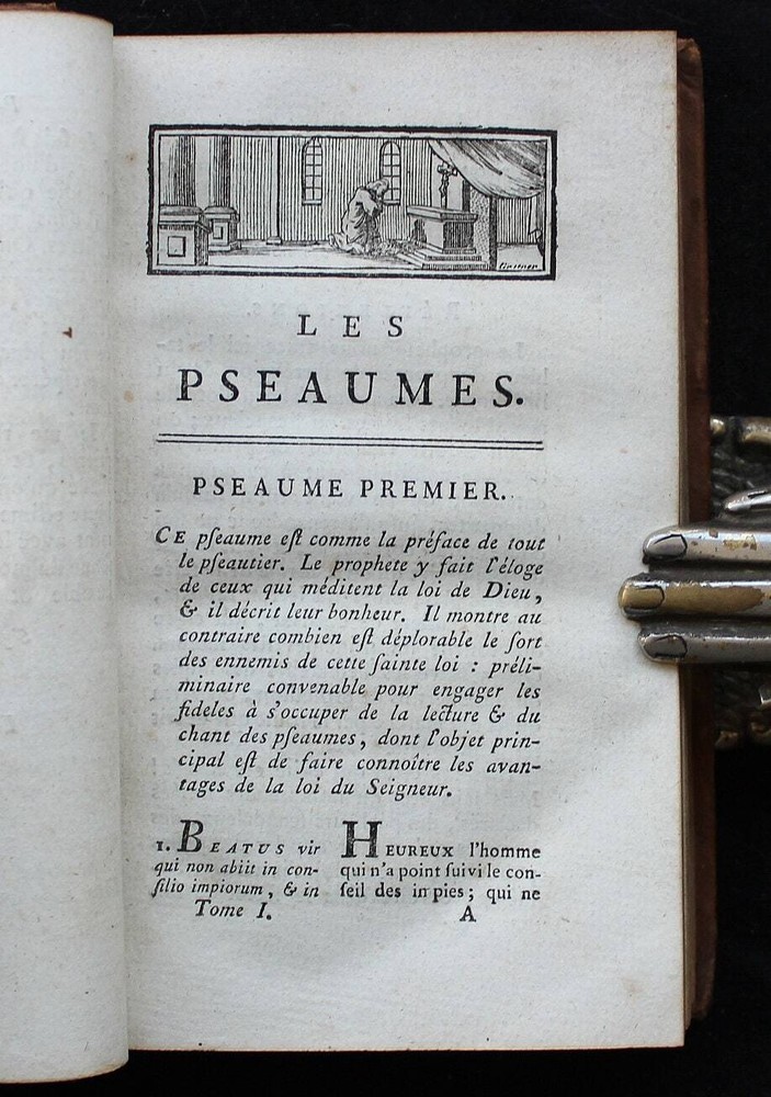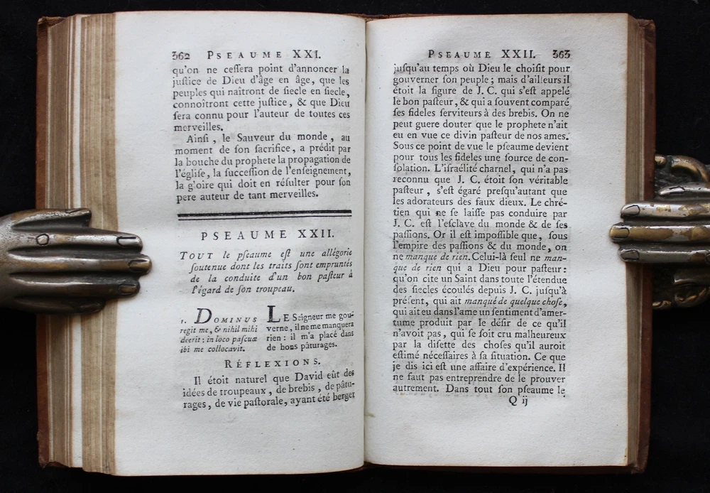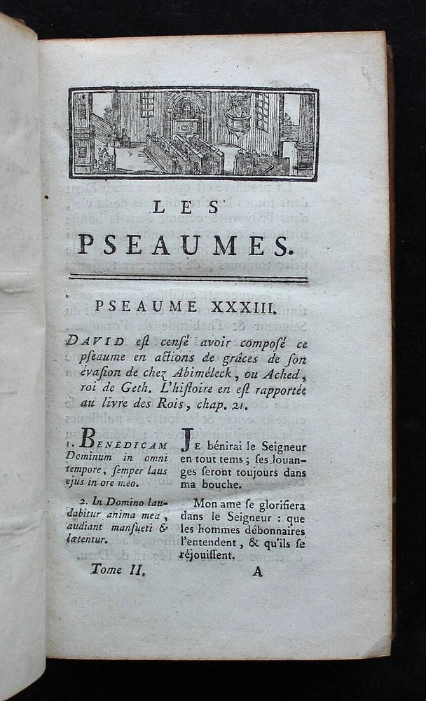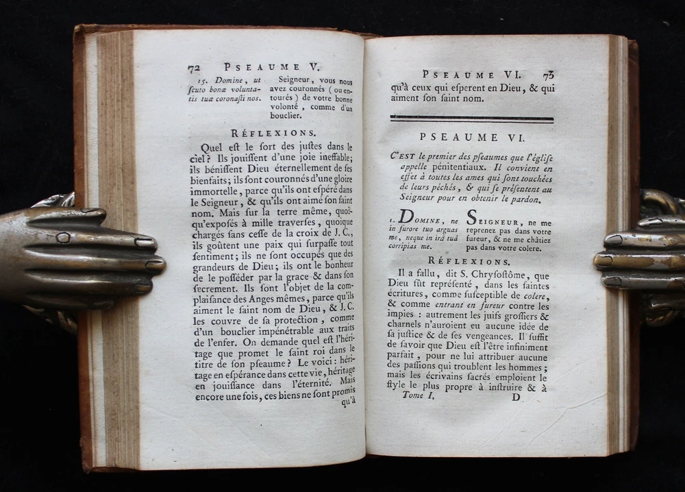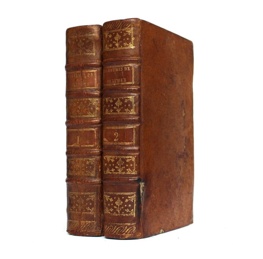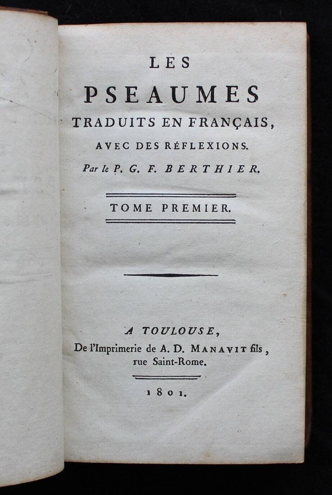 Antique French book set from 1801. "Les Pseaumes Traduits en Français, avec des Réflexions par le P. G. F. Berthier. Tome Premier - Tome Second". Volumes 1 and 2 encompassing Psalms 1-67 presented in both Latin and French, complemented by extensive commentaries in French. Original leather binding. 17 x 10 cm. LIX + 520 + 536 pp. Text in Latin & French. Very good condition. Please examine the images carefully as they are part of the description!