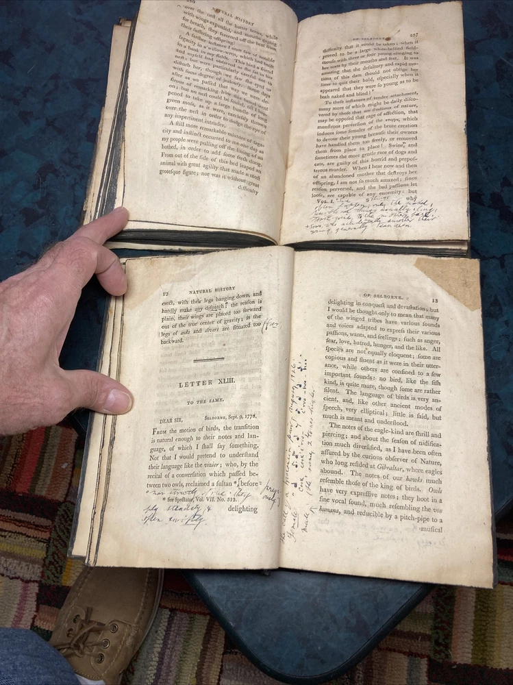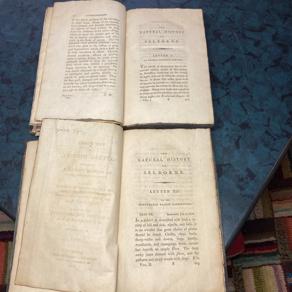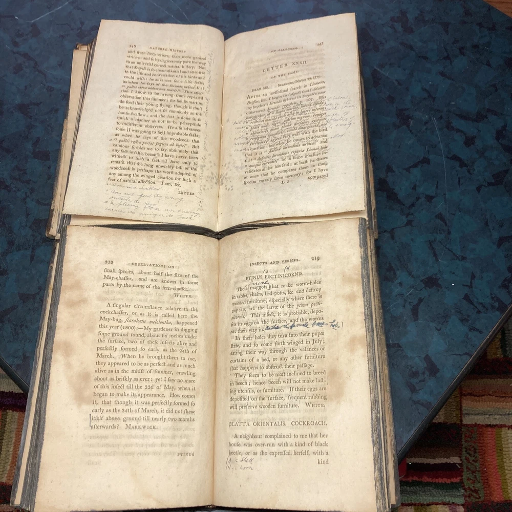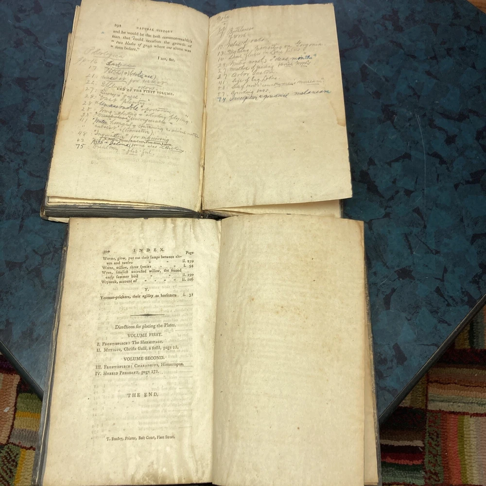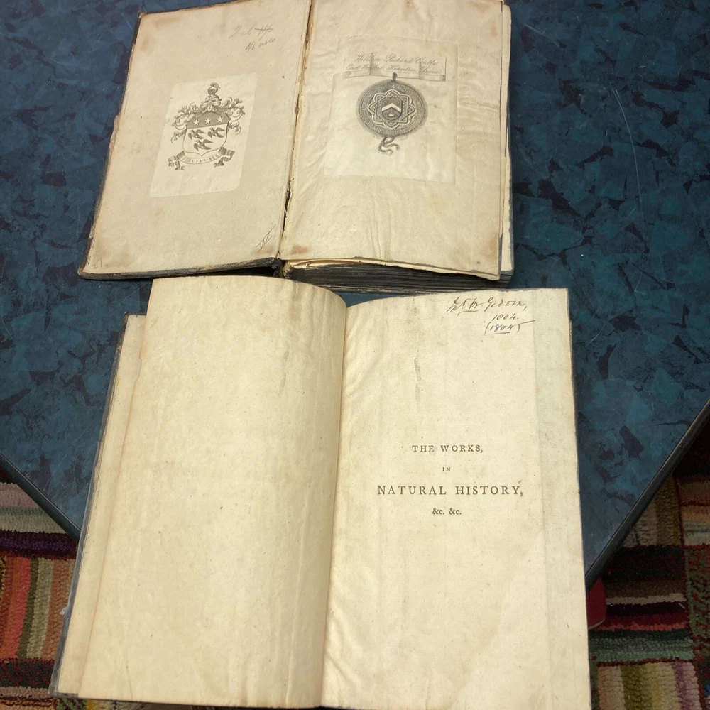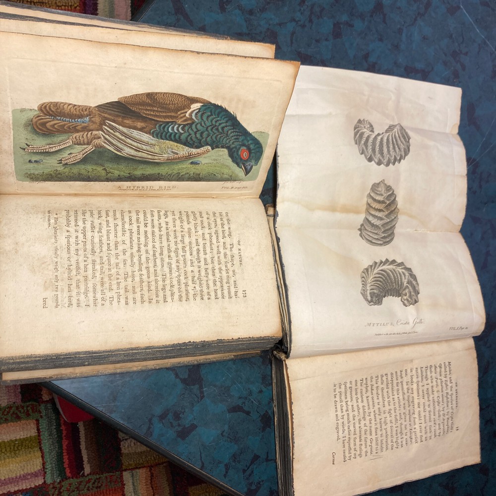 1802 2vols The Works of Natural History Gilbert White Illus Hand-Colour Plates. Excellent two book set, of this rare work. All plates are present, as shown in photos. There are notations, added to numerous pages, included in both books. Many of these are done in light pencil. Some are in ink. Vol. 1 has 2 old library plates. One says William Richard Crabbe, with his seal/ coat of arms. The other says YUIMUS, at the base of the coat of arms. Other owners names, written in ink within. I’ll take as many photos as I can. I’m excited to be able to offer this rare, desirable set of books. If you have questions or need more information contact me.