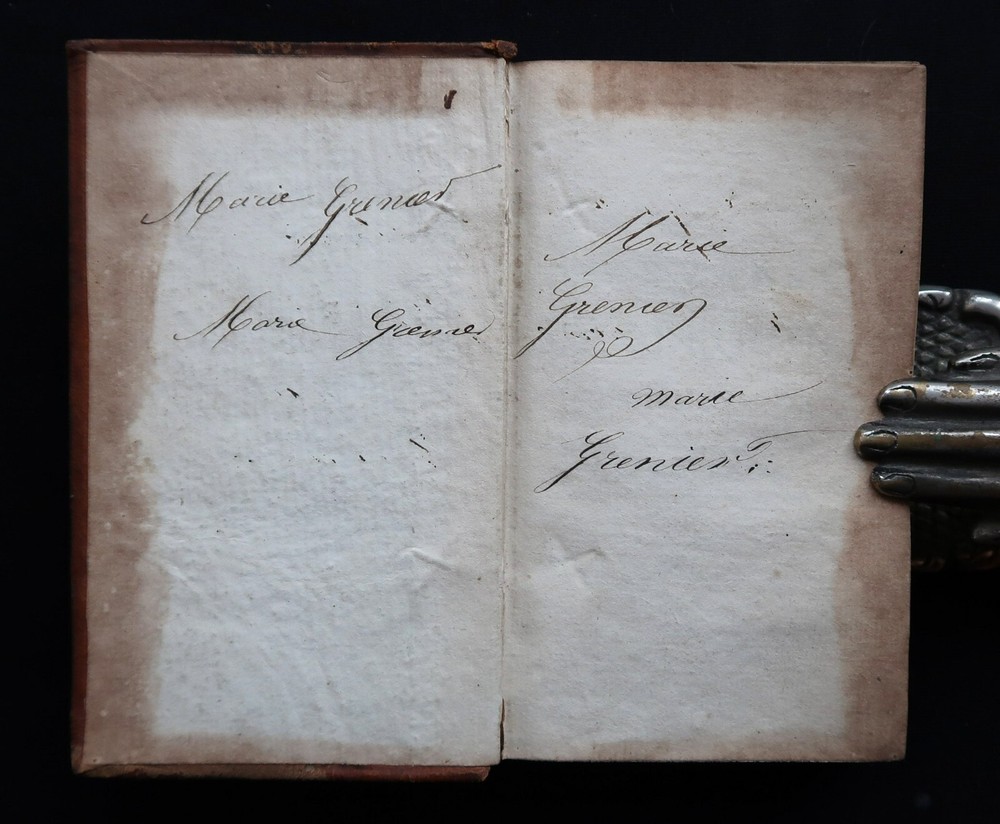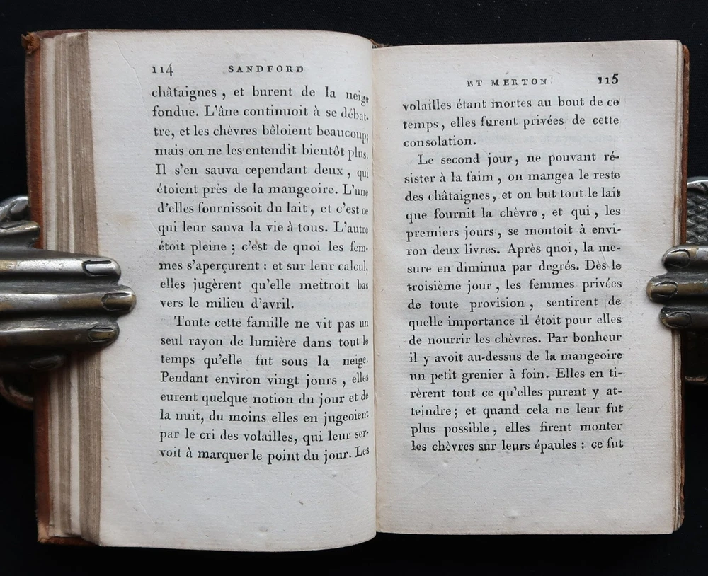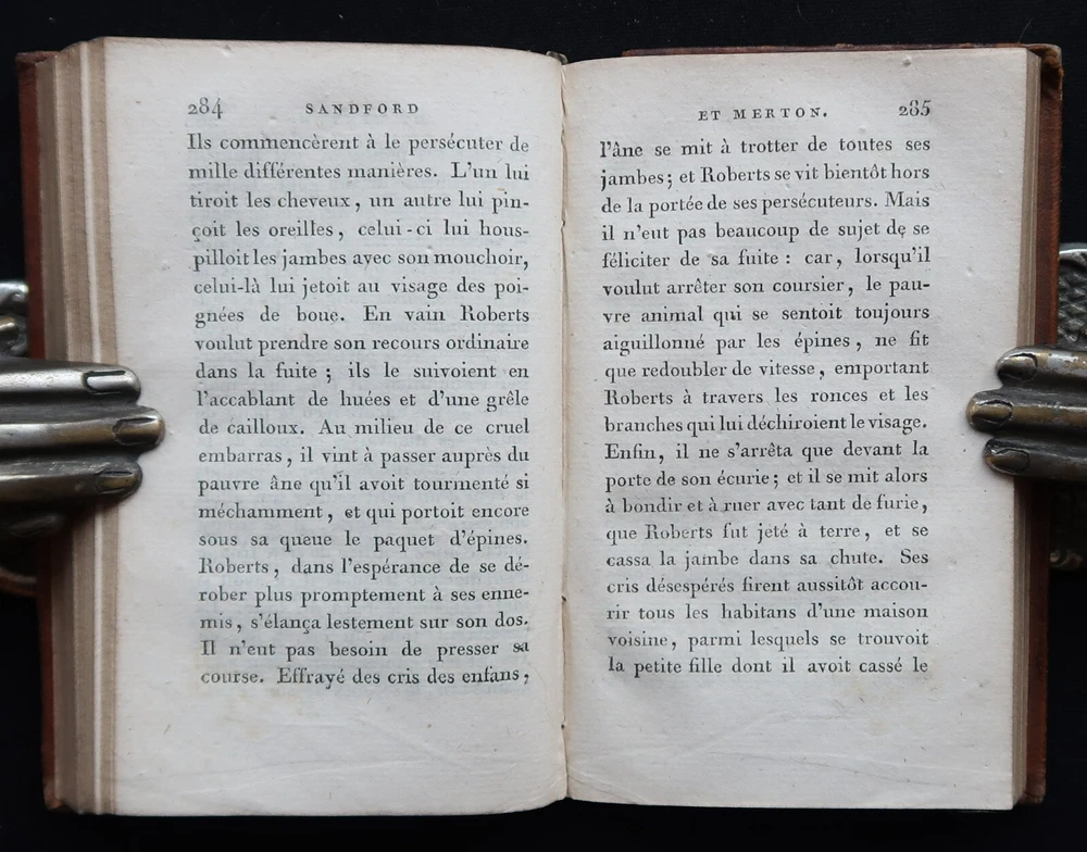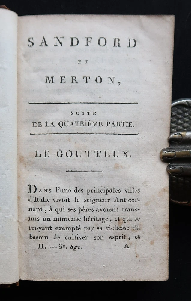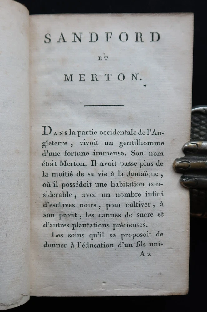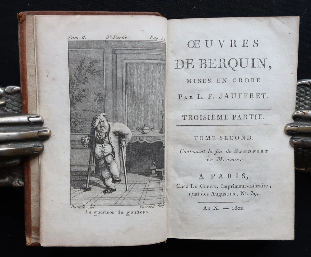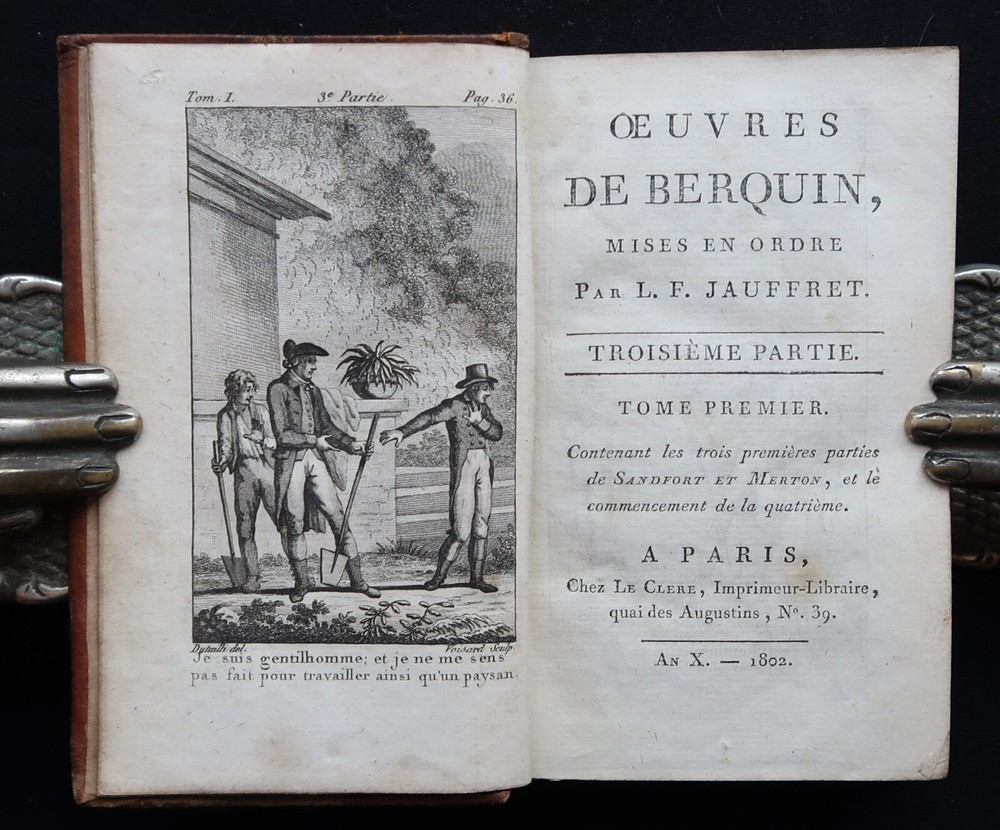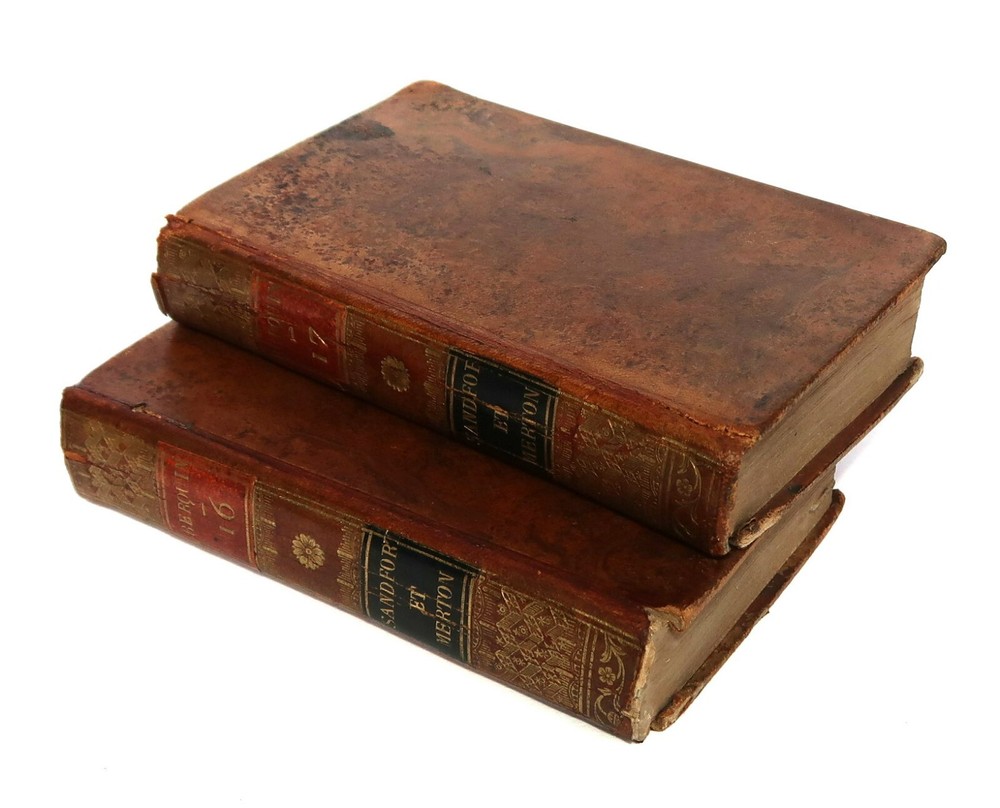 Berquin: Sandford et Merton. Complete work in 2 volumes (vols. 16 & 17 of the Complete Works of Berquin). Illustrated with engraved frontipieces. Paris, Chez Le Clere, 1802. 14 x 9 cm., 456 + 405 pages. Text in French. Bound in period full leather, gilt on spines. Wear to spines and boards, 2 joints cracked, signatures on endpapers else in good condition. Arnaud Berquin (September 1747 in Bordeaux – 21 December 1791) was a French children's author. His most famous work was L'Ami des Enfants (1782-1783) which was first translated into English, albeit bowdlerised, by Mary Stockdale and published in London The Looking-glass for the Mind, Or, Intellectual Mirror: Being an Elegant Collection of the Most Delightful Little Stories and Interesting Tales in 1783-1784 by Mary's father John Stockdale. The work remained popular until the middle of the nineteenth century. Berquin's stories consisted of events that might happen to children in their everyday lives—they did not contain fairy tales or other imaginative literature. His books envision childhood reading as a familial exercise; for example, some of his "stories" are actually plays with parts for every member of the family. Berquin's books helped solidify the creation of the nuclear family, for "if Berquin's work has a theme, it is that parents and children live in a perfect symbiosis, the parents looking after their children's interests and the children, if behaving properly, filling their parents with joy."