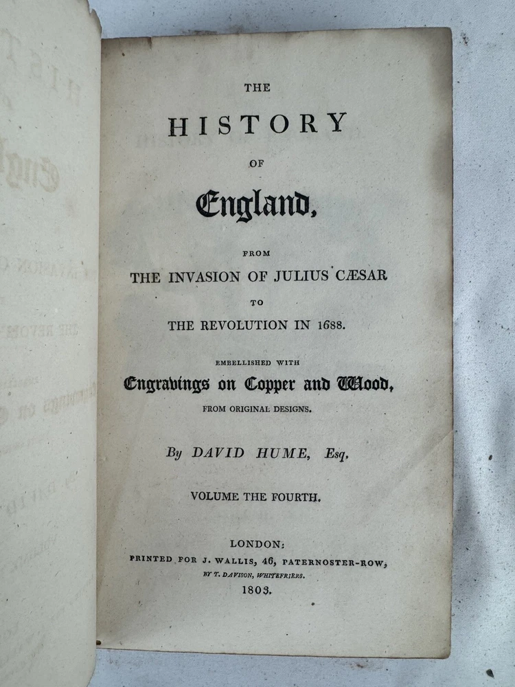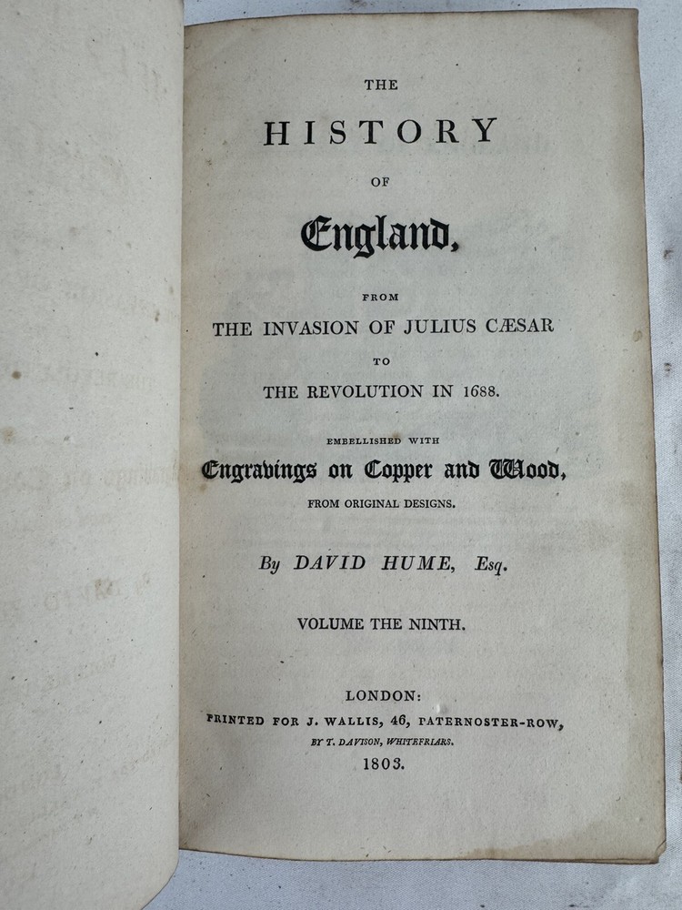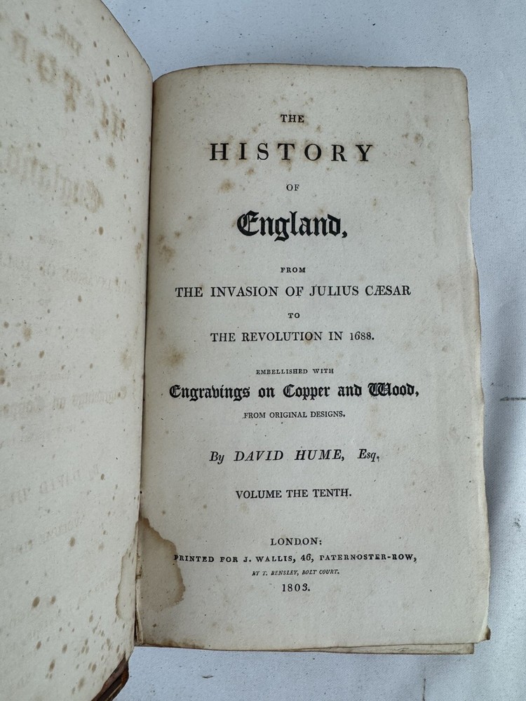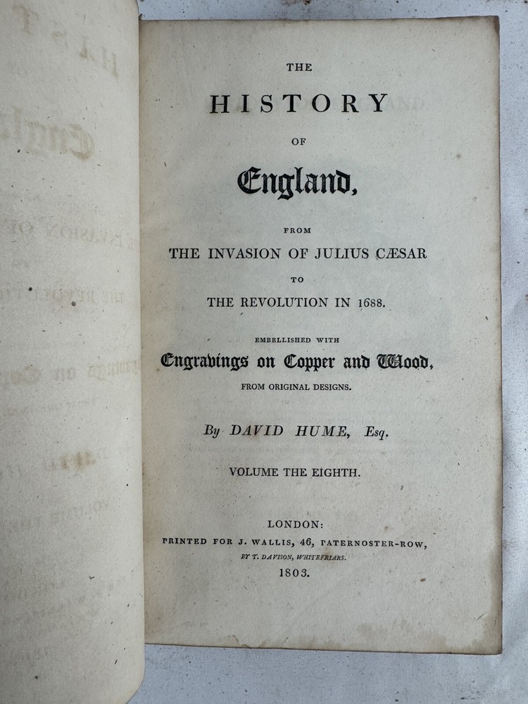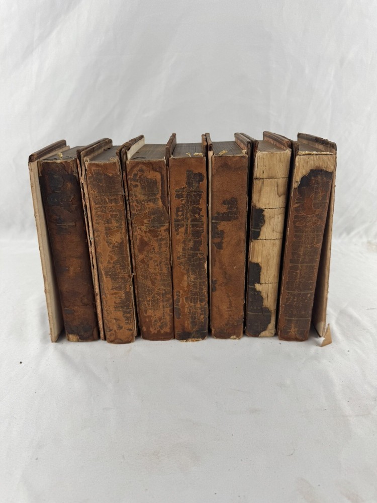 ARE 1803 EDITION OF DAVID HUME'S HISTORY OF ENGLAND - PUBLISHED BY J. WALLIS, LONDON VOLUMES INCLUDED: • Volume III • Volume IV • Volume VI • Volume VII • Volume VIII • Volume IX • Volume X (Note: Volumes I, II, and V are not included in this set) PUBLICATION DETAILS: • Published: London, 1803 • Publisher: J. Wallis, 46 Paternoster Row • Printer: W. Bulmer and Co. Cleveland Row • Features copper and wood engravings from original designs CONDITION (PLEASE READ CAREFULLY): - All volumes are in fragile condition requiring careful handling - All books have both front and back covers detached - One front or back cover is completely missing - Text blocks remain intact - Pages show expected age toning and foxing - Some wear and rubbing to leather bindings - Some Spine labels present but very worn - Interior pages generally complete but may have occasional spots or stains - Books need restoration/rebinding for proper preservation DIMENSIONS (approximate): • Each volume: 8.5" x 5.5" • Total weight of set: 13 lbs approx. This set is being sold AS-IS for research, collecting, or restoration purposes. These volumes represent an opportunity for book collectors, historians, or restoration specialists to acquire a portion of this important historical work. Please examine all photos carefully and message with any questions before purchasing. This is a genuine 19th century set requiring special care and handling. Keywords: antiquarian books, David Hume, History of England, 1803, rare books, Wallis edition, Georgian era books, English history, copper engravings ***Note: These books are over 200 years old and are being sold as collectible antiquarian items in as-is condition. They require careful handling and are not intended for regular reading use without proper restoration.***