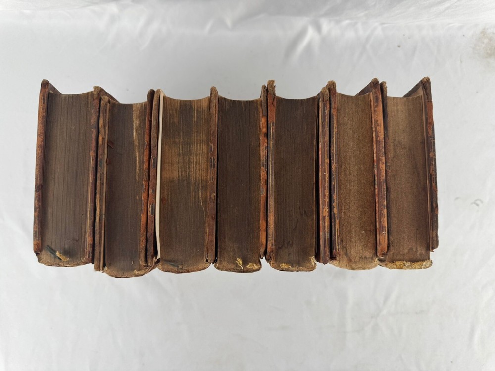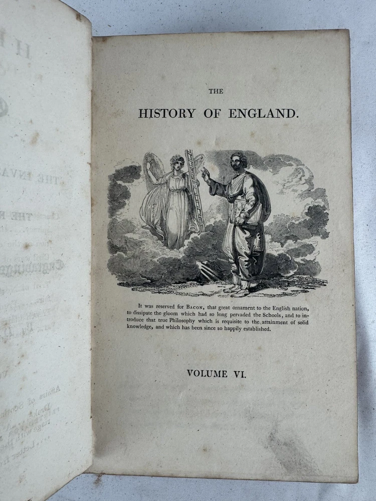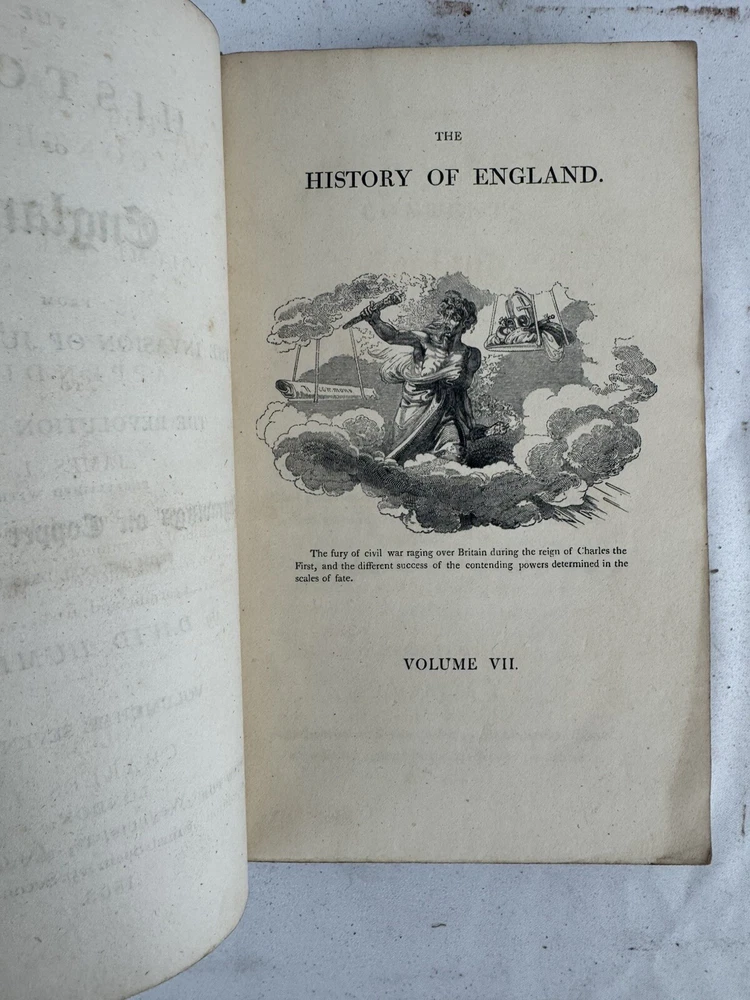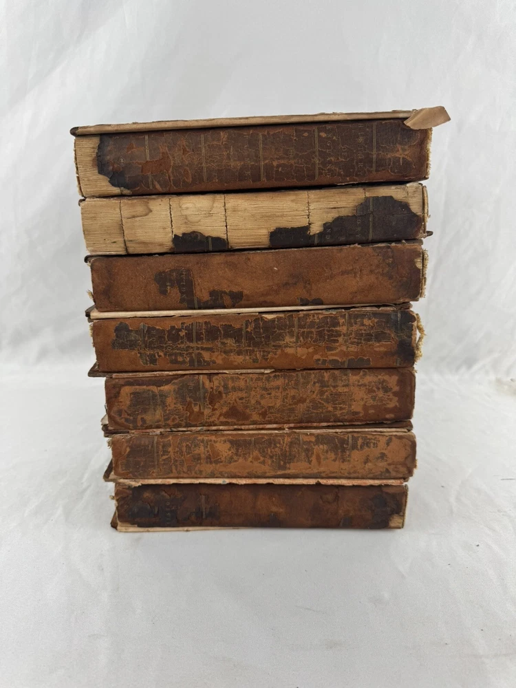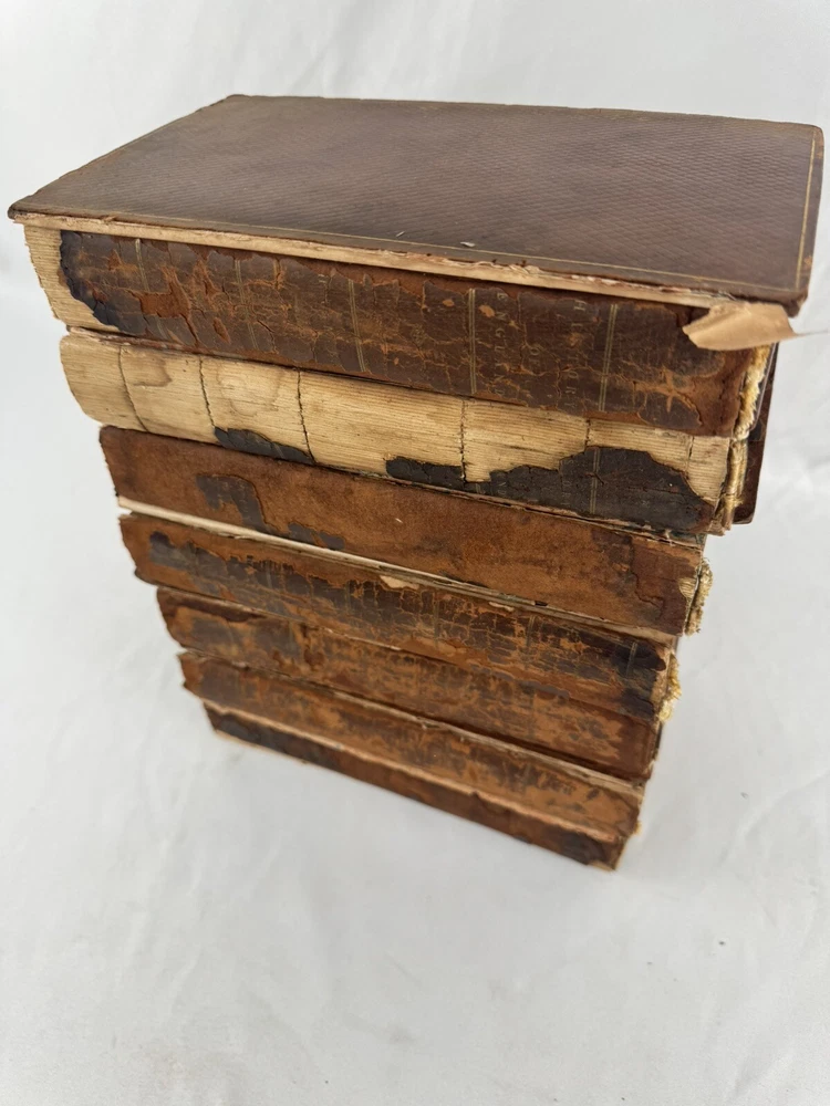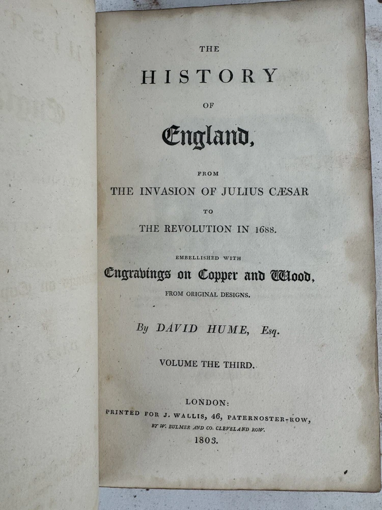 ARE 1803 EDITION OF DAVID HUME'S HISTORY OF ENGLAND - PUBLISHED BY J. WALLIS, LONDON VOLUMES INCLUDED: • Volume III • Volume IV • Volume VI • Volume VII • Volume VIII • Volume IX • Volume X (Note: Volumes I, II, and V are not included in this set) PUBLICATION DETAILS: • Published: London, 1803 • Publisher: J. Wallis, 46 Paternoster Row • Printer: W. Bulmer and Co. Cleveland Row • Features copper and wood engravings from original designs CONDITION (PLEASE READ CAREFULLY): - All volumes are in fragile condition requiring careful handling - All books have both front and back covers detached - One front or back cover is completely missing - Text blocks remain intact - Pages show expected age toning and foxing - Some wear and rubbing to leather bindings - Some Spine labels present but very worn - Interior pages generally complete but may have occasional spots or stains - Books need restoration/rebinding for proper preservation DIMENSIONS (approximate): • Each volume: 8.5" x 5.5" • Total weight of set: 13 lbs approx. This set is being sold AS-IS for research, collecting, or restoration purposes. These volumes represent an opportunity for book collectors, historians, or restoration specialists to acquire a portion of this important historical work. Please examine all photos carefully and message with any questions before purchasing. This is a genuine 19th century set requiring special care and handling. Keywords: antiquarian books, David Hume, History of England, 1803, rare books, Wallis edition, Georgian era books, English history, copper engravings ***Note: These books are over 200 years old and are being sold as collectible antiquarian items in as-is condition. They require careful handling and are not intended for regular reading use without proper restoration.***