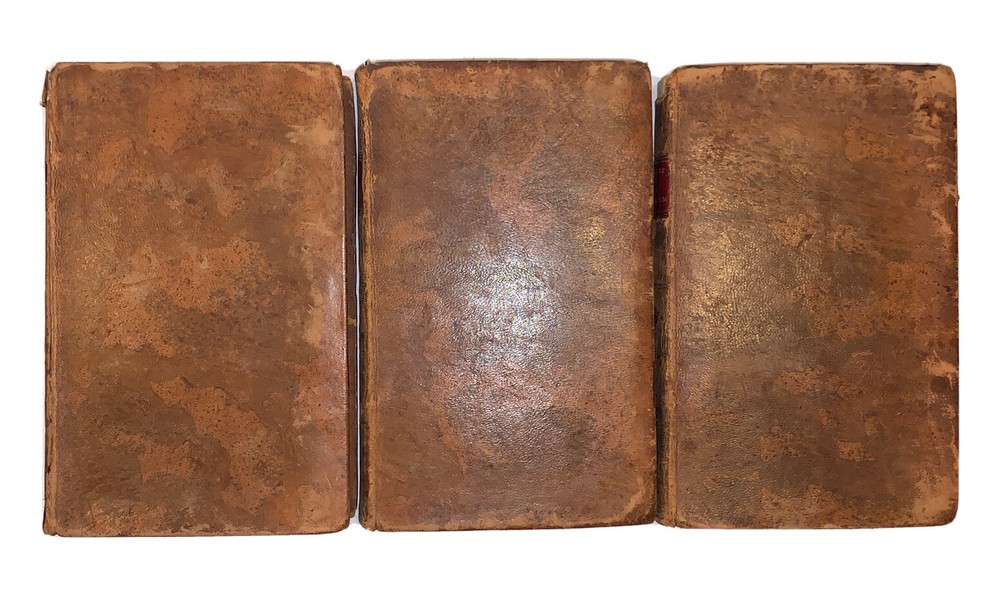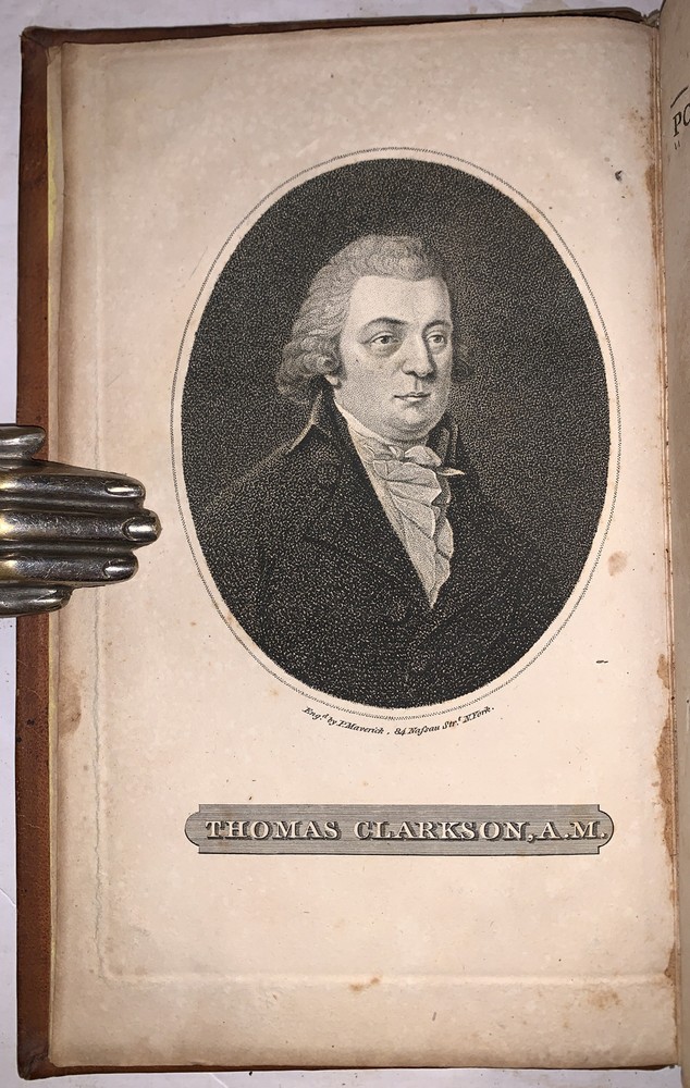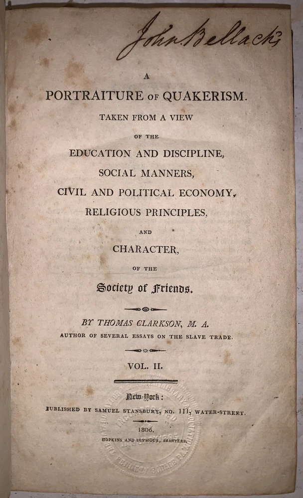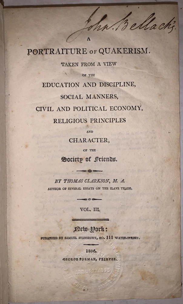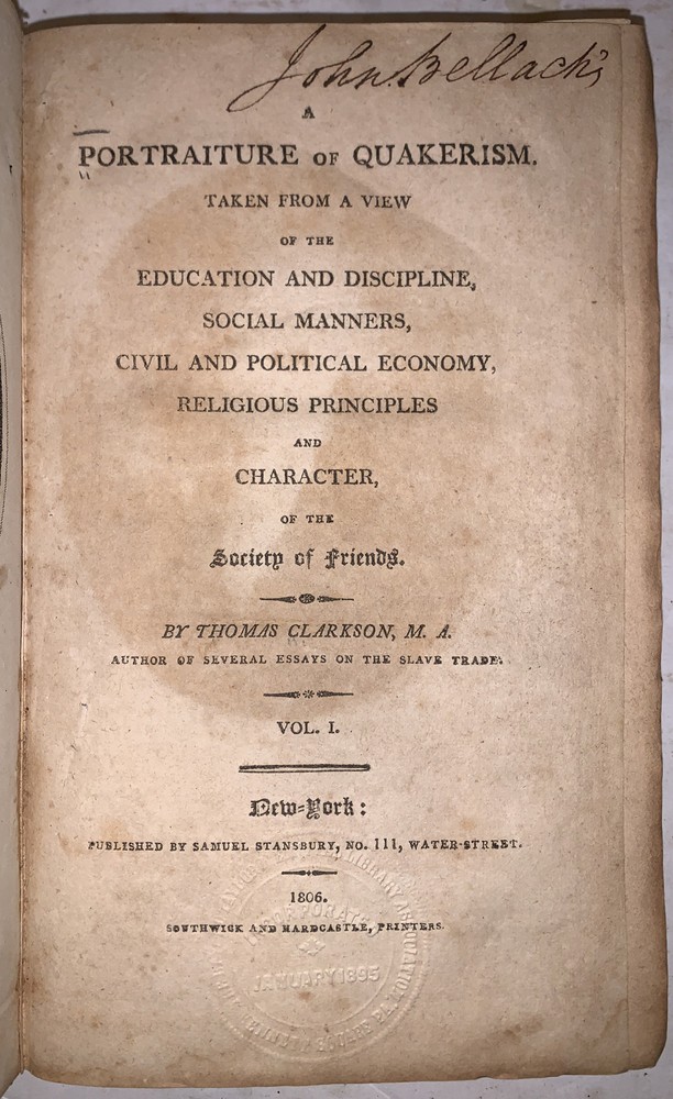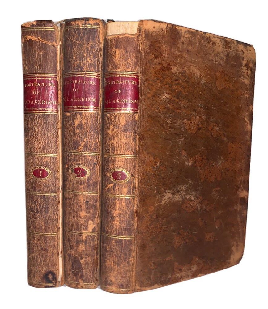 A Portraiture of Quakerism. Taken From A View of the Education and Discipline, Social Manners, Civil and Political Economy, Religious Principles and Character, of the Society of Friends. by Thomas Clarkson, M. A. In Three Volumes New York: Samuel Stansbury 1806 First American Edition Three octavos, bound in period full leather with gilt lettered spines. Frontispiece portrait in volume one. Front hinge of volume one cracked. Damage to the top of the spine of volume three. Some rubbing and wear, scuffs, ex-library with some of the typical markings, prior owner's inscription, some foxing and discoloration, else in good + condition. If you have any questions feel free to ask and don't forget to check out my other listings.