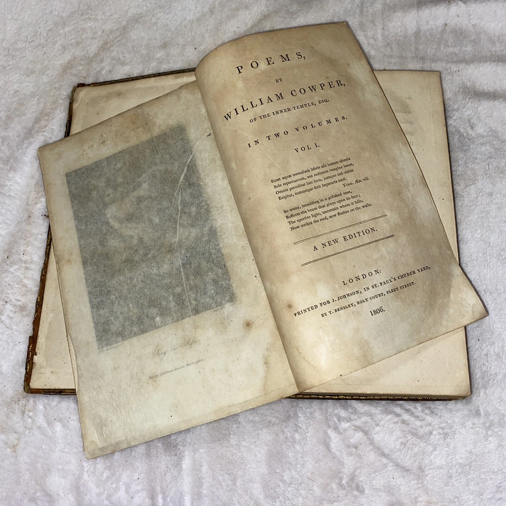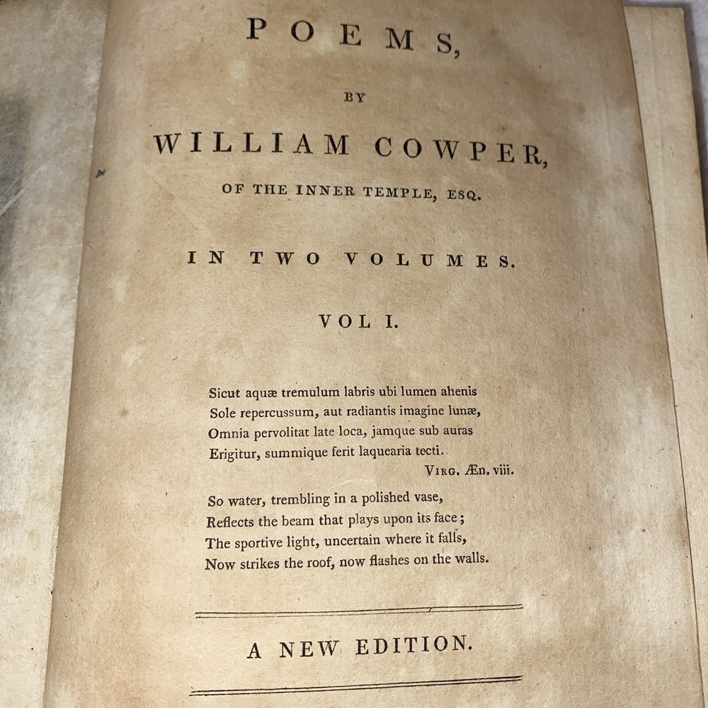 Papers are ripped out, but not missing. This is a rare and collectible 2 volume set of 1798 poems by William Cowper, of the Inner Temple. The books are bound in leather/hardcover and were printed for J. Johnson in London. The poems are written in English and cover various topics including poetry. The books are a great addition to any antiquarian book collection and are sure to impress.