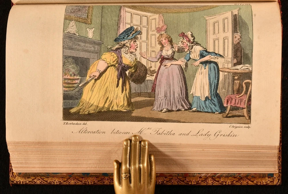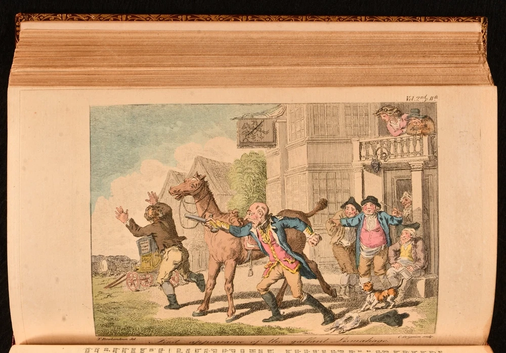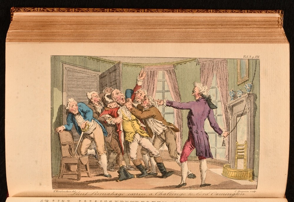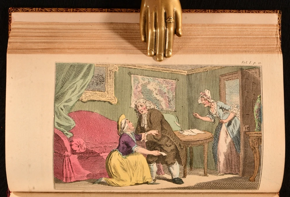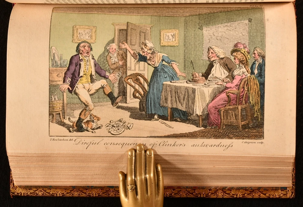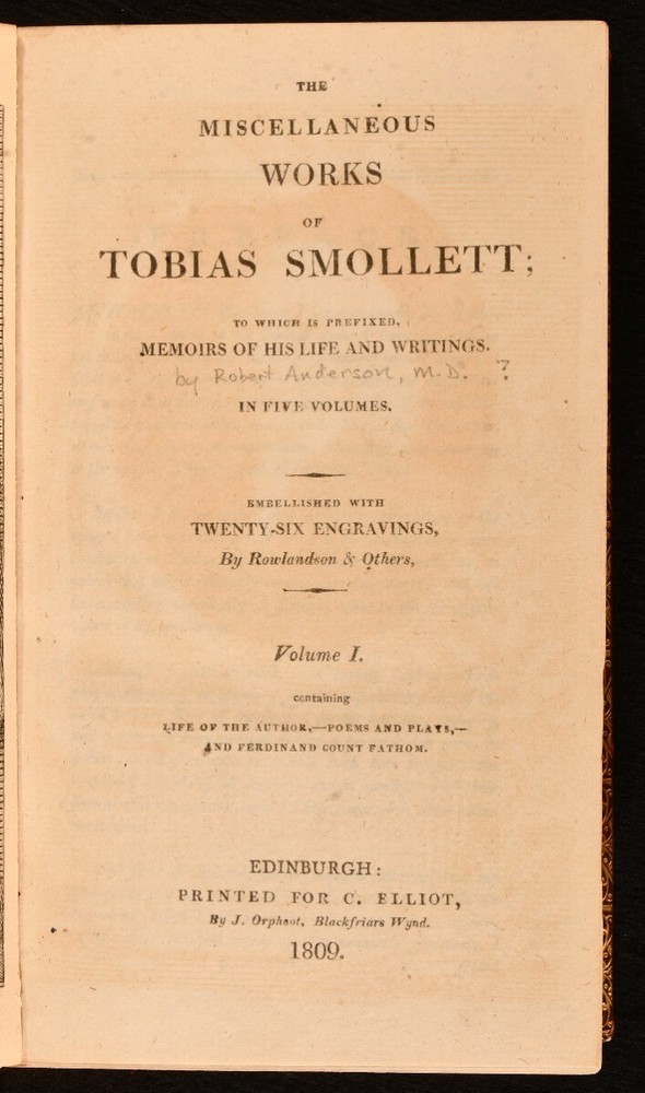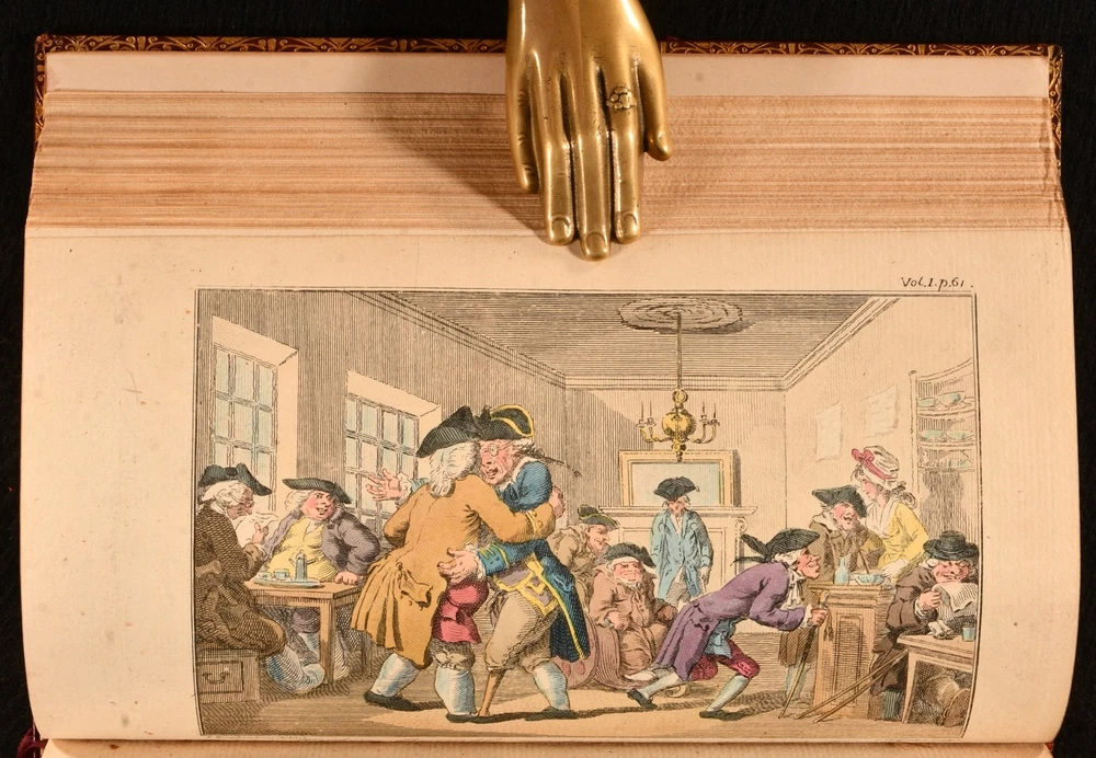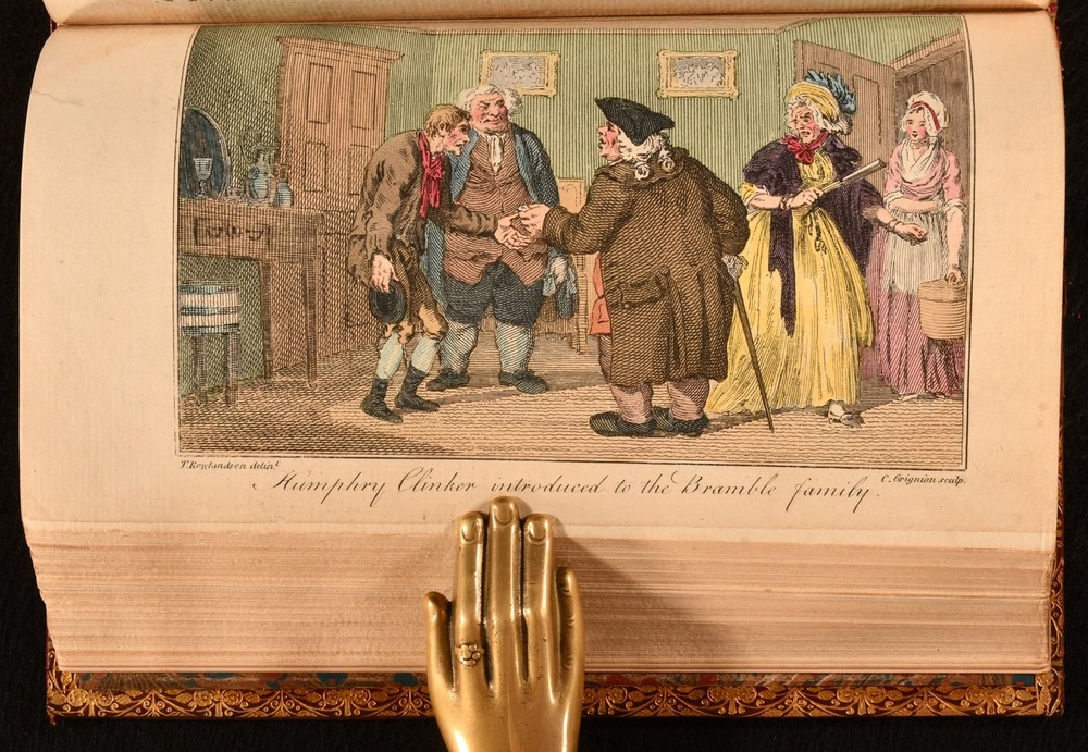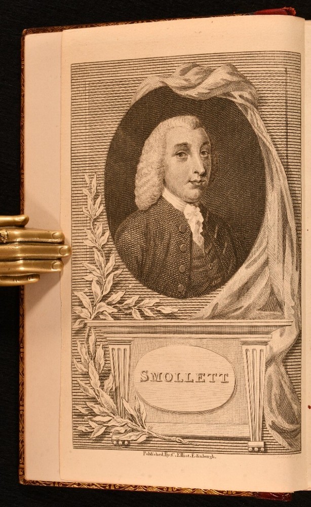 Click here to see our other books! The Miscellaneous Works of Tobias Smollett Tobias Smollett 1809 C. Elliot; J. Orphoot : Edinburgh 8" by 5" [2], viii, 5-34, 196, [2], iv, vi, 7-234, [2], iii, [1], 205; [4], vii, [1], 202, [2], iv, 222; [4], v, [1], iii, [1], 7-213, [3], iii, [1], 228; [4], xv, [1], 237, [3], viii, 266; [6], 238, ix, [1], 209, [3], 206pp SUMMARY A Zaehnsdorf bound set of the collected works of Tobias Smollett, a smart set of his works illustrated with striking hand-coloured plates by Rowlandson. Illustrated,Leather Binding,Signed Binding Overall Condition: Very Good This book weighs 8 KG when packed UK Postage: £ 4.49 US Postage: £ 57.99 EU Postage : £ 33.99 European Postage: £ 59.99 Asia Postage: £ 99.99 Worldwide Postage: £ 199.99 DESCRIPTION Complete in five volumes. Bound by Zaehnsdorf. A collection of the works of the popular Scottish author Tobias Smollett. Volume I contains a life of Smollet, a selection of his poems and plays, and 'Ferdinand Count Fathom'. Illustrated with a monochrome frontispiece, and two hand-coloured plates. Volume II contains Parts I and II of 'Peregrine Pickle'. Illustrated with four hand-coloured plates. Volume III contains Parts III and IV of 'Peregrine Pickle'. Illustrated with two hand-coloured plates. Volume IV contains 'Roderick Random'. Illustrated with six hand-coloured plates. Volume V contains 'Sir Lancelot Greaves' and 'Humphrey Clinker'. Illustrated with eleven hand-coloured plates. Illustrated by Thomas Rowlandson. Bookplate of Frederick Prime Delafield to the front paste downs. Collated, complete. CONDITION In a rebacked calf binding, bound by Zaehnsdorf. Externally, smart, with some light rubbing. Minor bumping to the extremities. Evidence of former wear to the backstrips prior to rebacking, including a small amount of loss to the head of the original spines of Volumes II, III, and V, and tail of the original spines of Volume I, IV, and V. Marginal chipping to the spine labels. A few light marks to the boards. Hinges of Volume I and front hinge of Volume I are starting but firm. Bookplate to the front paste downs. Internally, firmly bound. Pages are lightly age-toned and clean, with the occasional spot. Overall Condition: Very Good GLOSSARY OF TERMS Overall Condition (Dustwrapper condition rating is shown after that for the book itself, where a dustwrapper is present) Fine - Very well preserved copy showing very little wear Very Good Indeed - Only one or two minor faults, really a very attractive copy Very Good - Quite a wide term meaning no major faults but probably several smaller ones often expected given the age of the book, but still a respectable copy Good - Meaning not very good. Some more serious faults as will be described in the condition report under 'condition' Good Only - Meaning one or more faults that could really do with repair Fair - As with good only above but with other faults leaving a compromised copy even after repair Poor - Really bad and possibly seriously incomplete. We only sell books in this condition where their rarity or value makes them attractive none the less. Major defects will be described. GUARANTEE We offer a full money back guarantee on our descriptions. Please ask for details and conditions. We prefer PAYPAL. If you pay via PAYPAL we will post the item off the same or the next working day with the postage you have selected. Please note we cannot accept USD cheques