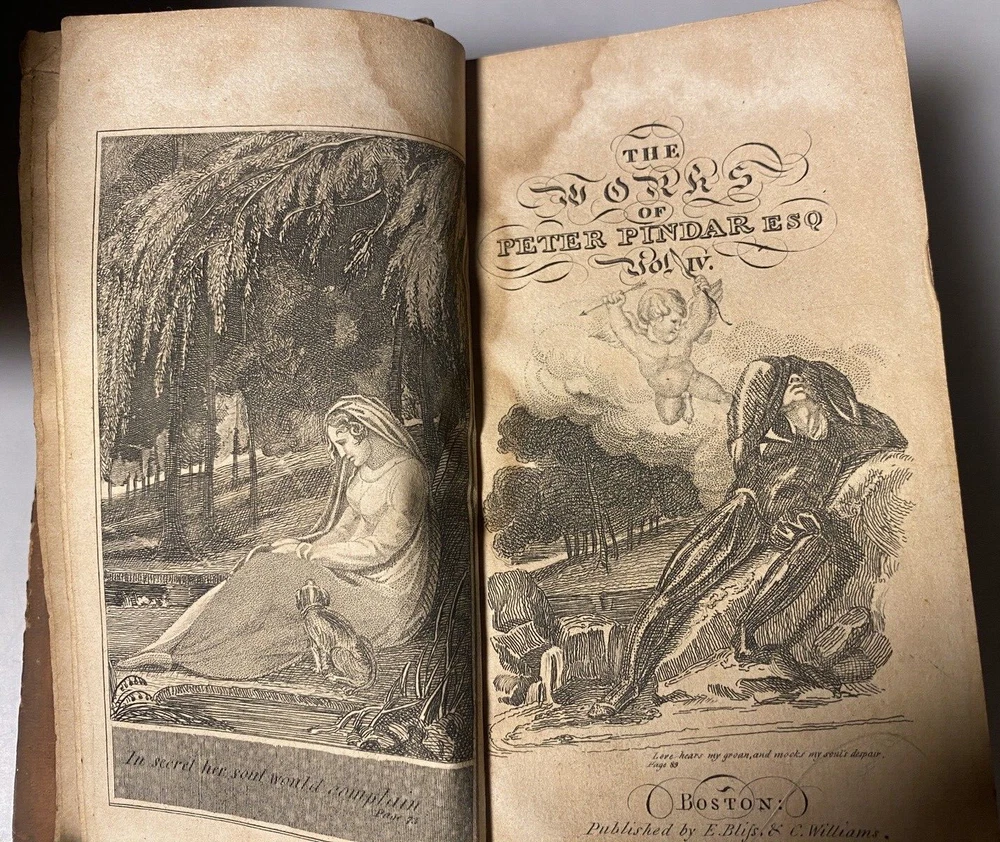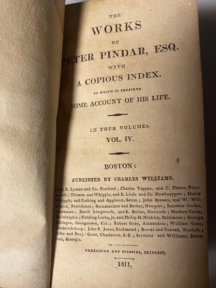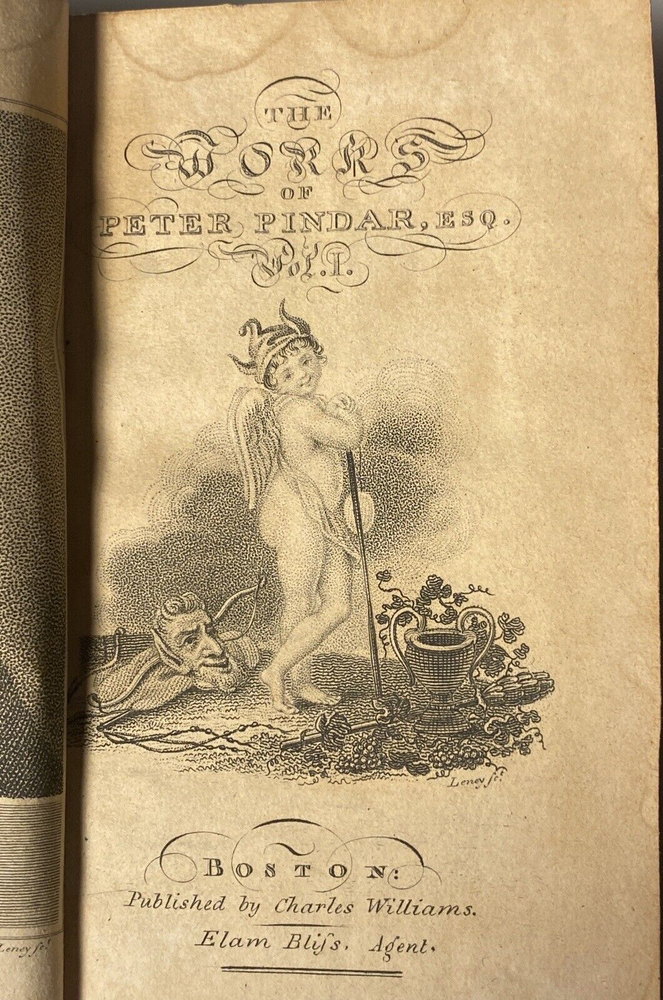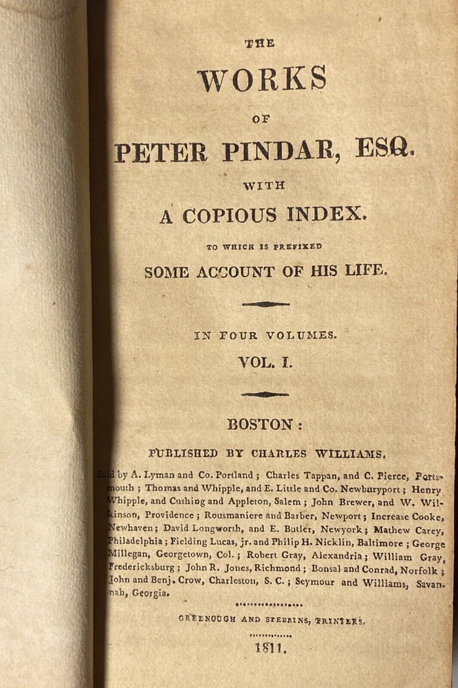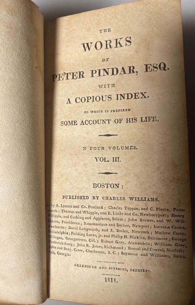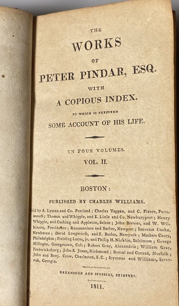 Offered: Early American Imprint** 1811 The Works of Peter Pindar, Esq. (IN FOUR VOLUMES) with copious Index To Which is Prefixed Some Account Of His Life BOSTON Published by Charles Williams** Greenough and Stebbins , Printers. *** Four volume set with ach volume having a half-title, frontispiece, engraved title page and regular title page with Peter Pindar being on Volume 1. Peter Pindar was the pen name of John Wolcot. His satires began with his fellow aristocrats and continued against the King and Queen. He further mocked James Boswell and Hannah More as well as pompous religious figures. ******Complete sets are uncommon******* Volume 1: 4v (5 1/4 x 3") full leather frontispiece Peter Pindar, title piece engraving, title page 1811, memoirs of the author vii,To the Reviewers (7) 501 pp. Cracked through center title label lacking only on this first volume, Otherwise Complete. Volume II: 4v ( 5 1/4 x 3") Full leather Black Leather Label (Pindar), frontispiece (first on a child) engraved title page, title page, subjects for painters, 456 pp.complete Volume III: 4v (5 1/4 x 3) black spine labelFull Leather frontispiece delighting heart , title engraving ,title page, academic procession 472 pp. complete Volume IV: 4v (5 1/4 x 3) Full Leather, black spine label frontispiece the secret her soul would complain, title engraving, title page 1811 odes to in and outs 495 pp. last page 1/4 present lacking little of printed page Index 449-495 substantially complete. All volumes full leather with expected page toning and occasional damp staining for these two century aged scarce complete set of Peter Pindar's Works. JOHN WOLCOT ('PETER PINDAR') was born in 1738 in Devon. He was educated in Devon, Cornwall and France and he also studied medicine in London. His medical degree was gained from Aberdeen University in 1767, by external examination in Plymouth. In the same year he travelled to Jamaica and became physician to the governor, Sir William Trelawney. Upon his return to England after Trelawney's death he practised medicine in Cornwall, where he befriended the artist John Opie, who became his protégé. In 1778 Wolcot abandoned medicine and went with Opie to London, where he began his career as a satirist under the pseudonym of Peter Pindar, publishing Lyric Odes to the Royal Academicians (1782–5). His verses were bestsellers and he became a well-known figure in the capital's literary and political circles, greatly admired for his biting wit and social commentary. His targets included William Pitt, James Boswell, Sir Joseph Banks and the moralist Hannah More. His most important target was the King himself. In 1786 he published the first canto of his most important poem, The Lousiad, the five volumes of which were not completed until 1795, and in 1787 Ode upon Ode, which ridiculed the official yearly odes to King George III. Wolcot’s verse was collected in 1812. He died in London in 1819 and was buried in the church of St Paul's, Covent Garden.