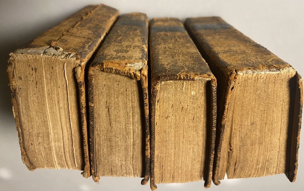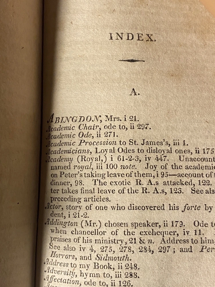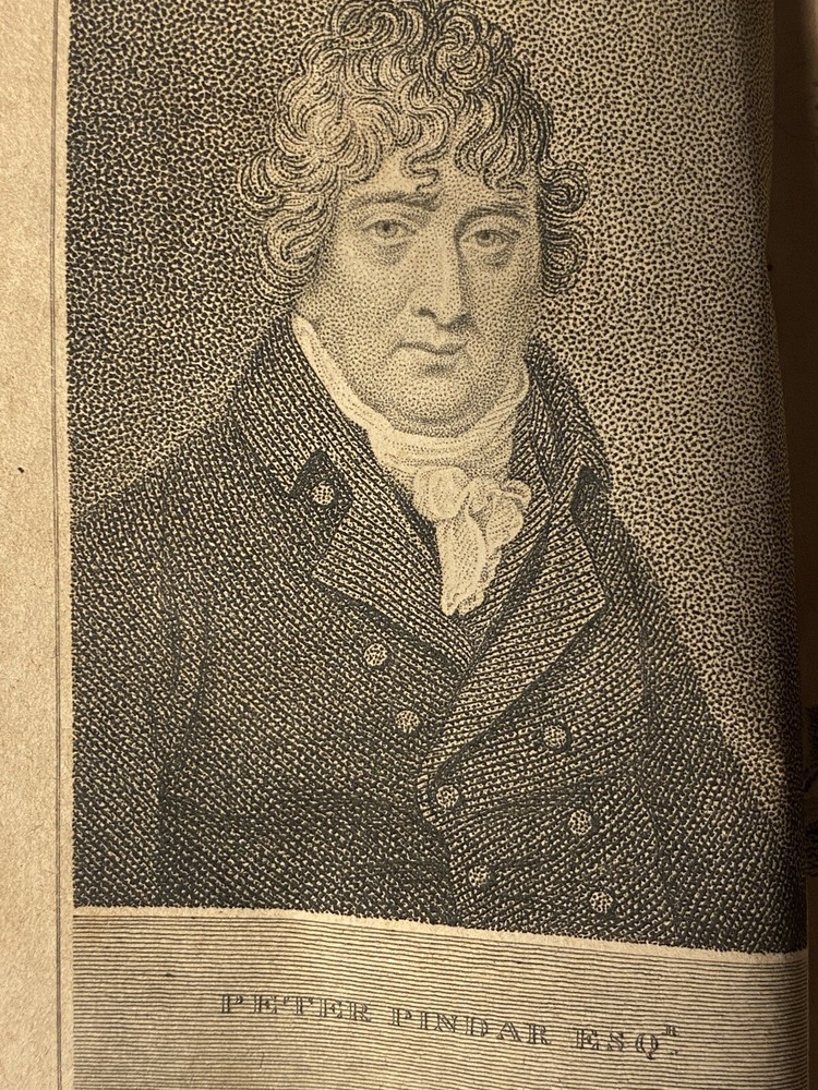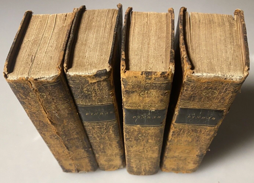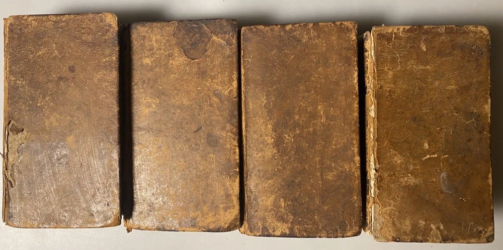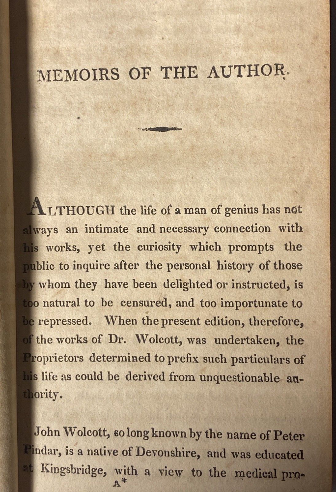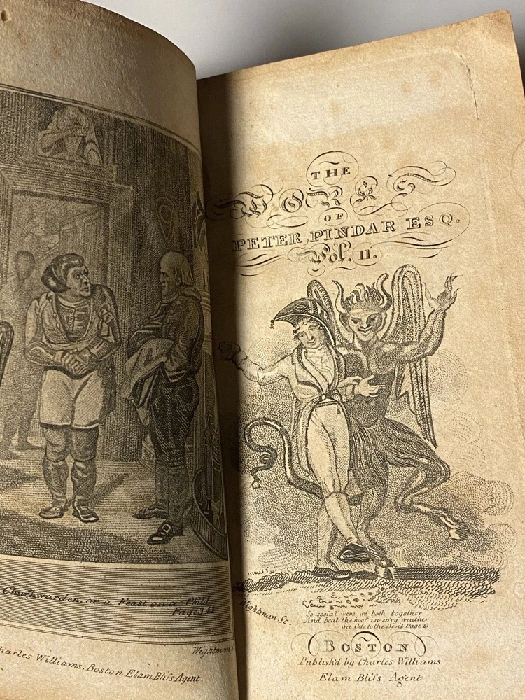 Offered: Early American Imprint** 1811 The Works of Peter Pindar, Esq. (IN FOUR VOLUMES) with copious Index To Which is Prefixed Some Account Of His Life BOSTON Published by Charles Williams** Greenough and Stebbins , Printers. *** Four volume set with ach volume having a half-title, frontispiece, engraved title page and regular title page with Peter Pindar being on Volume 1. Peter Pindar was the pen name of John Wolcot. His satires began with his fellow aristocrats and continued against the King and Queen. He further mocked James Boswell and Hannah More as well as pompous religious figures. ******Complete sets are uncommon******* Volume 1: 4v (5 1/4 x 3") full leather frontispiece Peter Pindar, title piece engraving, title page 1811, memoirs of the author vii,To the Reviewers (7) 501 pp. Cracked through center title label lacking only on this first volume, Otherwise Complete. Volume II: 4v ( 5 1/4 x 3") Full leather Black Leather Label (Pindar), frontispiece (first on a child) engraved title page, title page, subjects for painters, 456 pp.complete Volume III: 4v (5 1/4 x 3) black spine labelFull Leather frontispiece delighting heart , title engraving ,title page, academic procession 472 pp. complete Volume IV: 4v (5 1/4 x 3) Full Leather, black spine label frontispiece the secret her soul would complain, title engraving, title page 1811 odes to in and outs 495 pp. last page 1/4 present lacking little of printed page Index 449-495 substantially complete. All volumes full leather with expected page toning and occasional damp staining for these two century aged scarce complete set of Peter Pindar's Works. JOHN WOLCOT ('PETER PINDAR') was born in 1738 in Devon. He was educated in Devon, Cornwall and France and he also studied medicine in London. His medical degree was gained from Aberdeen University in 1767, by external examination in Plymouth. In the same year he travelled to Jamaica and became physician to the governor, Sir William Trelawney. Upon his return to England after Trelawney's death he practised medicine in Cornwall, where he befriended the artist John Opie, who became his protégé. In 1778 Wolcot abandoned medicine and went with Opie to London, where he began his career as a satirist under the pseudonym of Peter Pindar, publishing Lyric Odes to the Royal Academicians (1782–5). His verses were bestsellers and he became a well-known figure in the capital's literary and political circles, greatly admired for his biting wit and social commentary. His targets included William Pitt, James Boswell, Sir Joseph Banks and the moralist Hannah More. His most important target was the King himself. In 1786 he published the first canto of his most important poem, The Lousiad, the five volumes of which were not completed until 1795, and in 1787 Ode upon Ode, which ridiculed the official yearly odes to King George III. Wolcot’s verse was collected in 1812. He died in London in 1819 and was buried in the church of St Paul's, Covent Garden.