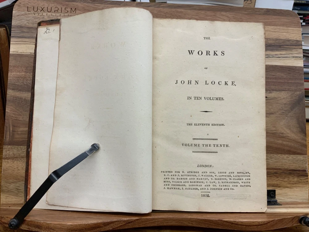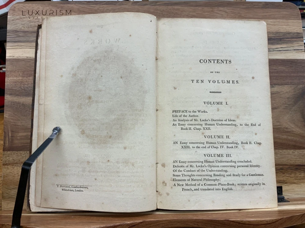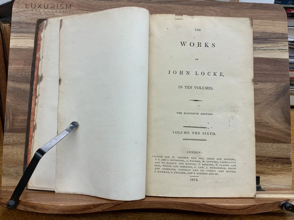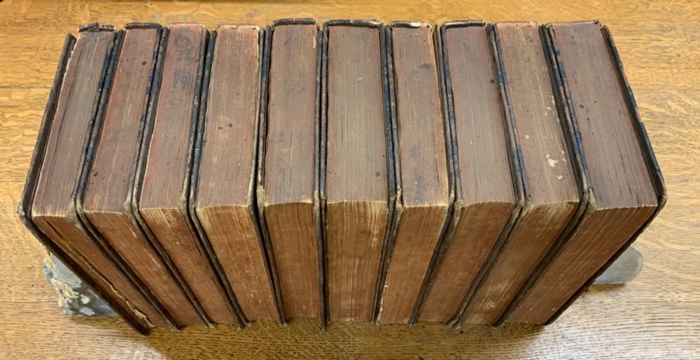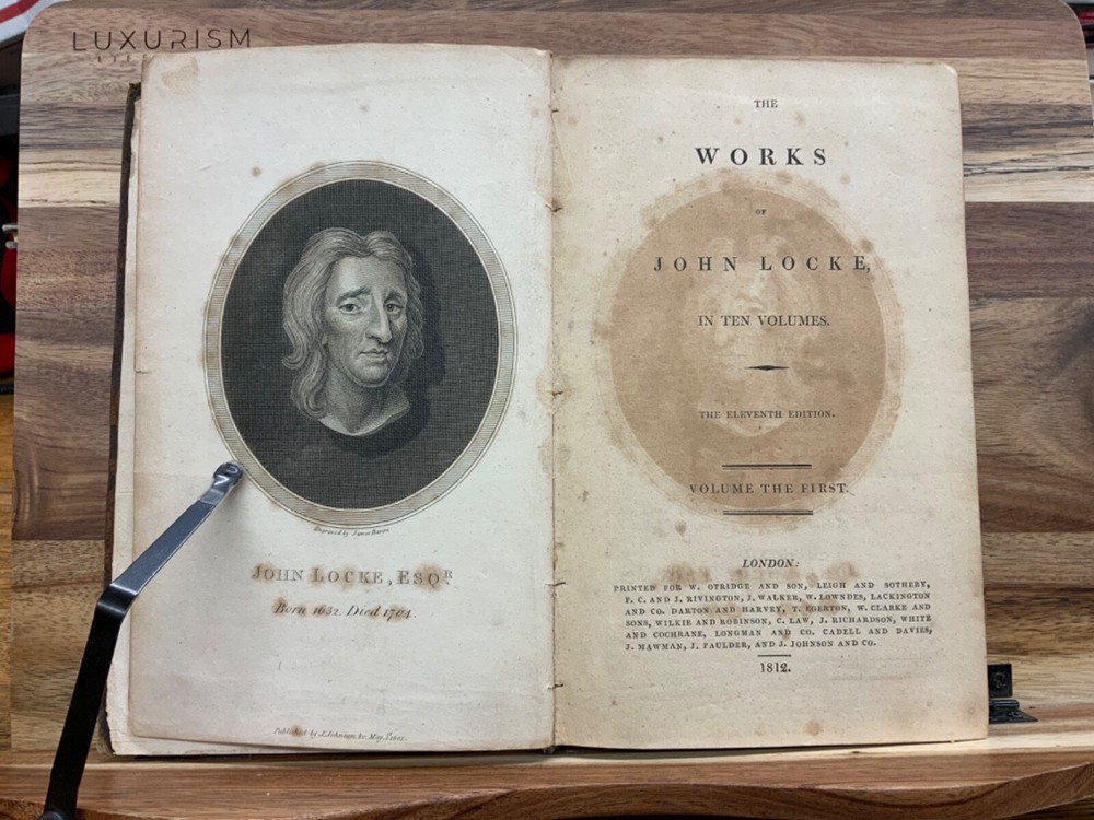 The Works of John Locke, In Ten Volumes. The Eleventh Edition. London: Printed for W. Otridge and Son, Leigh and Sotheby, F. C. and J. Rivington, et al. 1812. A Complete set in ten volumes - frontispiece of Locke in Vol. I + fold-out chart. Uniform binding measures 8.5 x 5.5", 8vos. In poor condition. As is. All boards are detached from bindings. All leather spines lacking - a few pieces of leather remain at head of Vols. I, II & V. Volume labels partially intact on Vols. V & VIII. Head bands lacking on Vols. III, IV & X. Leather boards are all moderately chipped at edges & corners; gilt bordering chipped & dulled. Leather is dried & brittle; prone to chipping. All edges of all text-blocks red marbled (dulled). Some marbled end-pages exhibit some chipping & are detached with boards. Previous ownership bookplates found on all front paste-downs: "James Madison Abney." Ink marginalia found on all volumes front fly-leaves (verso) with title & volume number. Below typed name on bookplates are ink signatures: "John Rutledge Abney." Normal age-related toning throughout text-blocks; with instances of finger-soiling and age-staining. Frontispiece in Vol. I has caused some off-setting on adjacent title page. Fold-out chart in Vol. I is toned around creases & exhibits a small tear at right fore-edge, where fold-out meets text-block. A complete set - all reading copies. Perfect candidate for restoration. Please see photos. James Madison Abney (1827 - 1889) married Martha Livingsoton on 21 December 1848 in Edgefield County, South Carolina. She was the daughter of Daniel and Karen Happuch Smith Livingston. James Madison Abney and Martha Livingston appeared as head of household on a census enumerated 19 December 1850 in Edgefield District, South Carolina. The household was listed as James Abney, 24, farmer, with real estate valued at $1,000. His wife, Martha, was 26. They had one child, John R. Abney, one year old. All were born in South Carolina. Living next door was Jacob Pope Abney. James began military service at age 34 on 5 December 1861 in Edgefield County, South Carolina, as corporal in company D, 19th South Carolina Infantry. He surrendered wiith the regiment 26 Apr 1865 at High Point, North Carolina. He was paroled 1 May 1865 at Greensboro. South Carolina provenance. FORN-SHELF-0698-BB-2406-HK1736