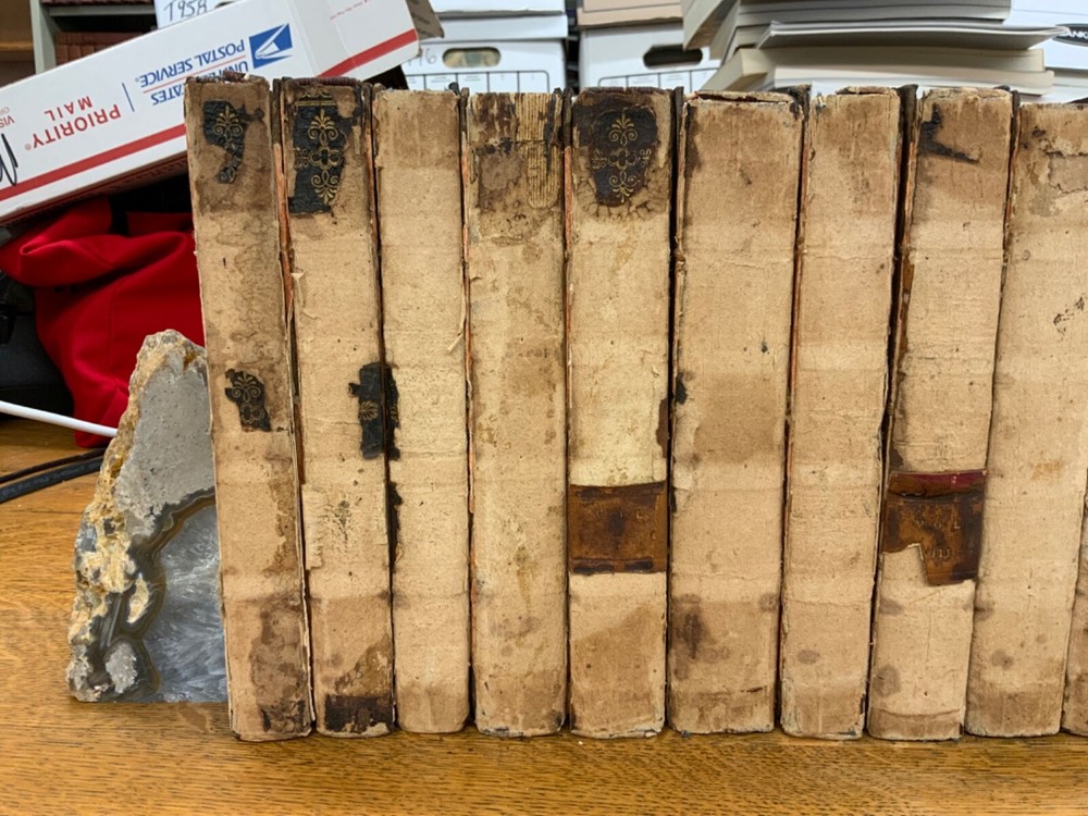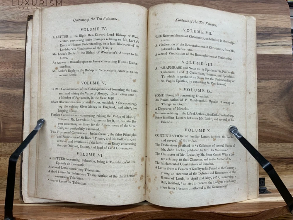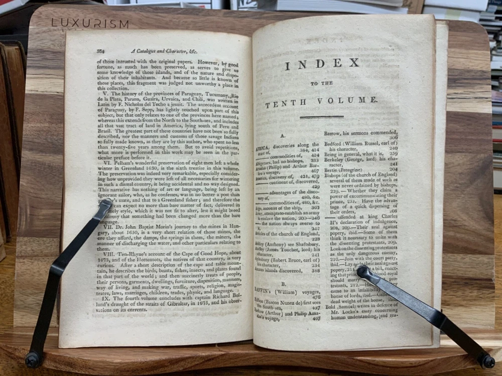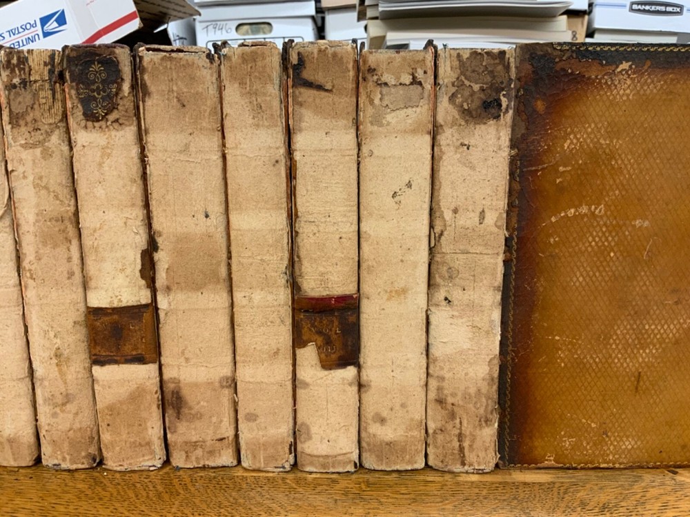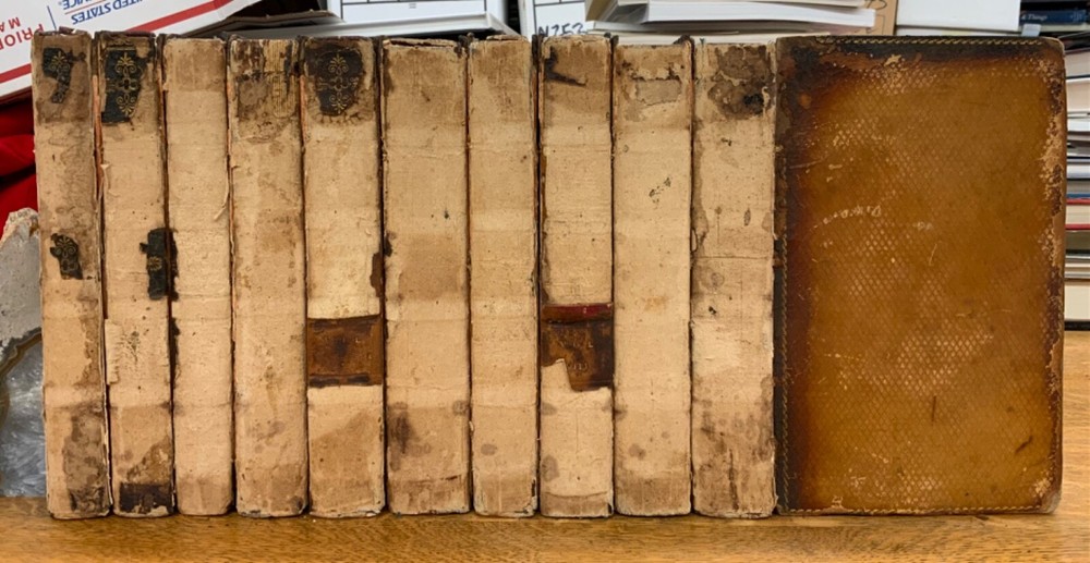 The Works of John Locke, In Ten Volumes. The Eleventh Edition. London: Printed for W. Otridge and Son, Leigh and Sotheby, F. C. and J. Rivington, et al. 1812. A Complete set in ten volumes - frontispiece of Locke in Vol. I + fold-out chart. Uniform binding measures 8.5 x 5.5", 8vos. In poor condition. As is. All boards are detached from bindings. All leather spines lacking - a few pieces of leather remain at head of Vols. I, II & V. Volume labels partially intact on Vols. V & VIII. Head bands lacking on Vols. III, IV & X. Leather boards are all moderately chipped at edges & corners; gilt bordering chipped & dulled. Leather is dried & brittle; prone to chipping. All edges of all text-blocks red marbled (dulled). Some marbled end-pages exhibit some chipping & are detached with boards. Previous ownership bookplates found on all front paste-downs: "James Madison Abney." Ink marginalia found on all volumes front fly-leaves (verso) with title & volume number. Below typed name on bookplates are ink signatures: "John Rutledge Abney." Normal age-related toning throughout text-blocks; with instances of finger-soiling and age-staining. Frontispiece in Vol. I has caused some off-setting on adjacent title page. Fold-out chart in Vol. I is toned around creases & exhibits a small tear at right fore-edge, where fold-out meets text-block. A complete set - all reading copies. Perfect candidate for restoration. Please see photos. James Madison Abney (1827 - 1889) married Martha Livingsoton on 21 December 1848 in Edgefield County, South Carolina. She was the daughter of Daniel and Karen Happuch Smith Livingston. James Madison Abney and Martha Livingston appeared as head of household on a census enumerated 19 December 1850 in Edgefield District, South Carolina. The household was listed as James Abney, 24, farmer, with real estate valued at $1,000. His wife, Martha, was 26. They had one child, John R. Abney, one year old. All were born in South Carolina. Living next door was Jacob Pope Abney. James began military service at age 34 on 5 December 1861 in Edgefield County, South Carolina, as corporal in company D, 19th South Carolina Infantry. He surrendered wiith the regiment 26 Apr 1865 at High Point, North Carolina. He was paroled 1 May 1865 at Greensboro. South Carolina provenance. FORN-SHELF-0698-BB-2406-HK1736