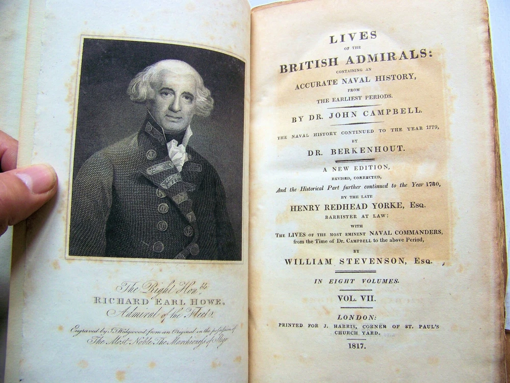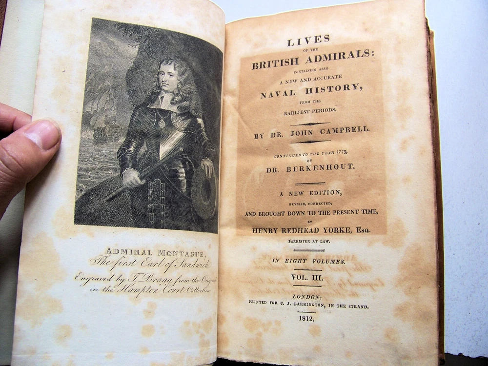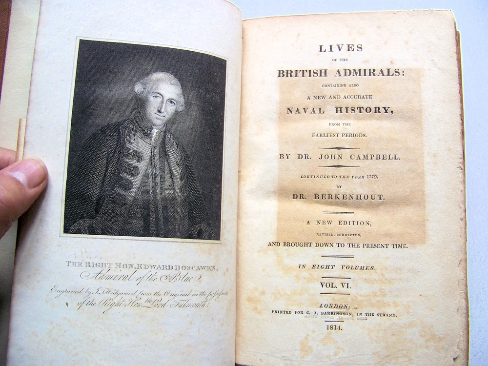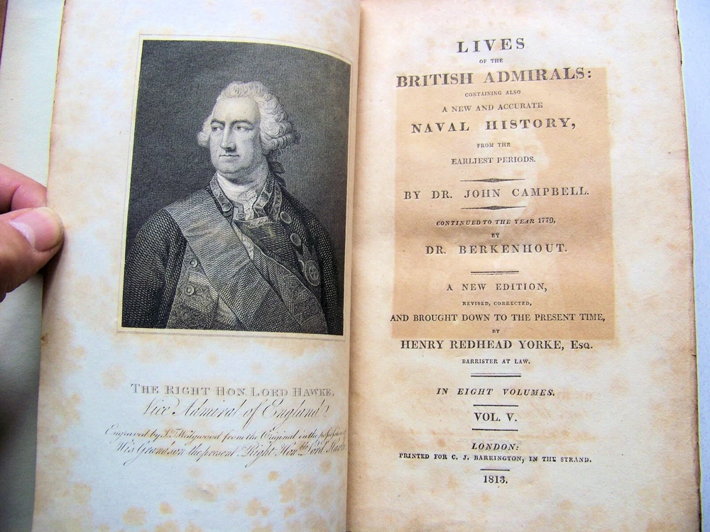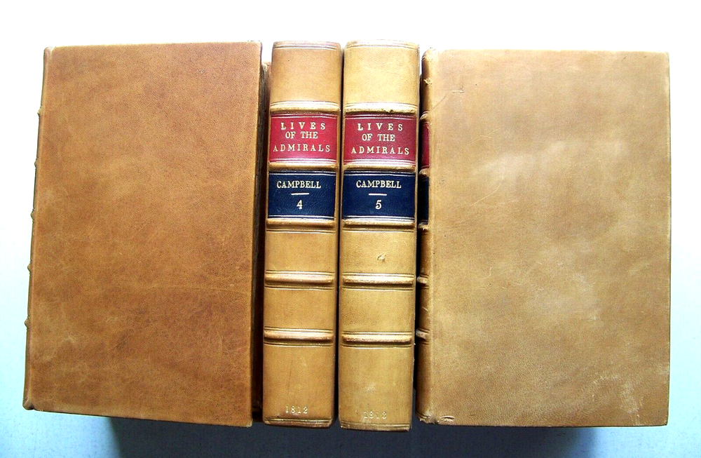 WE'VE PURCHASED ANOTHER TERRIFIC COLLECTION OF BOOKS A FULL LIBRARY OF VINTAGE BOOKS! FIRST EDITIONS SCARCE TITLES A WIDE VARIETY OF TOPICS SO GET COMFORTABLE...GRAB A CUP OF COFFEE...AND ENJOY SHOPPING SCARCE COPY OF THE 1812-1817 U. K. EDITION EIGHT VOLUME SET CONTAINING ACCURATE NAVAL HISTORY FROM THE EARLIEST PERIODS CONTINUED TO THE YEARS 1779 & 1780 FULL LEATHER BINDING WITH RAISED RIBS ON SPINE LIVES OF THE BRITISH ADMIRALS BY: JOHN CAMPBELL, DR. BERKENHOUT, & HENRY REDHEAD YORKE PUBLISHED BY: J. HARRIS