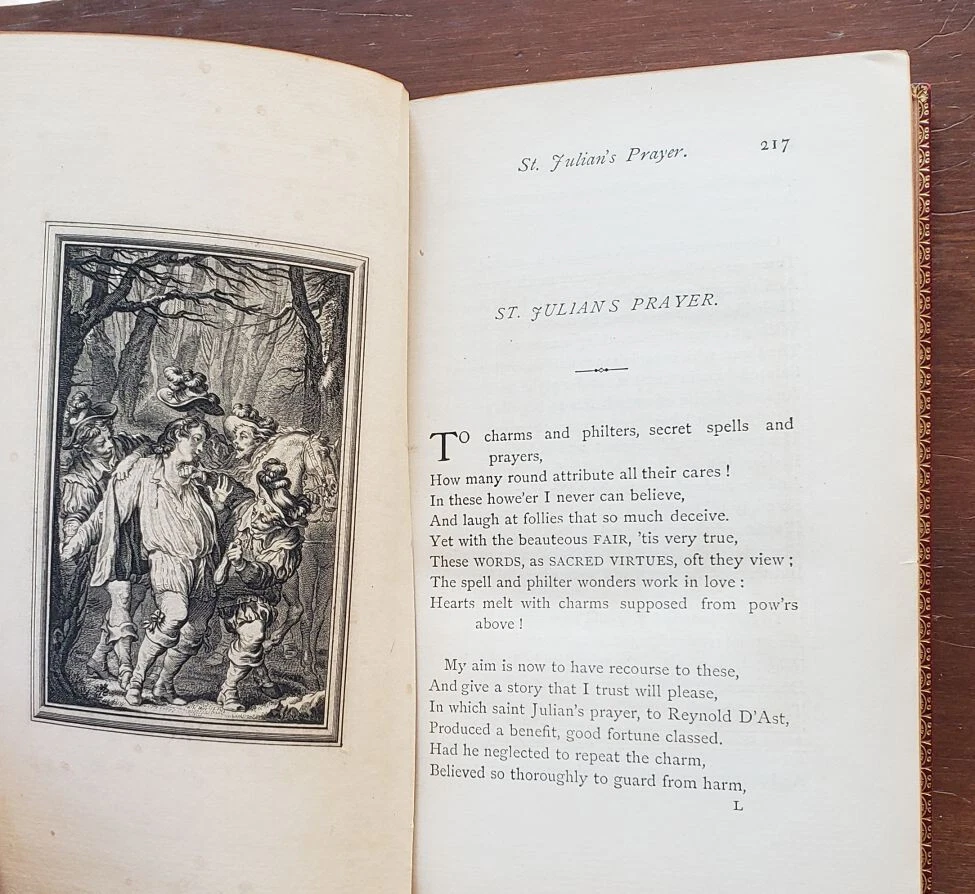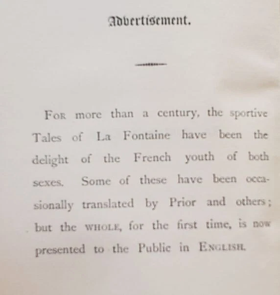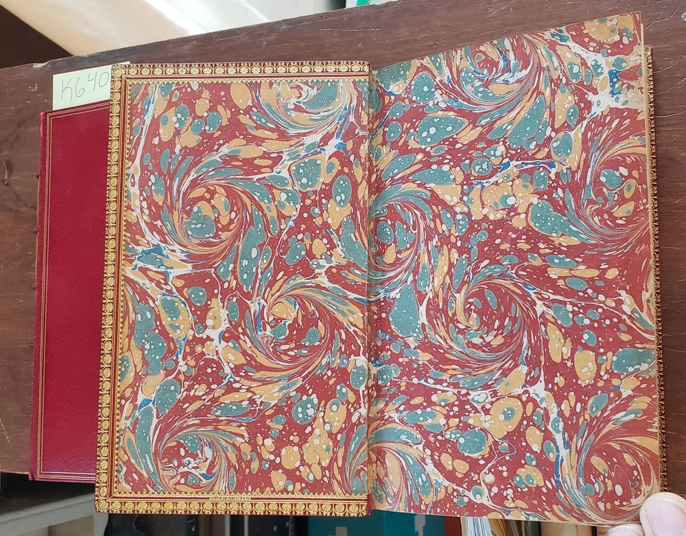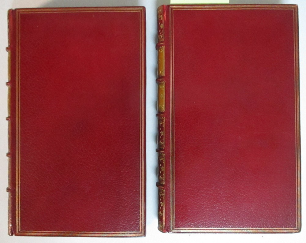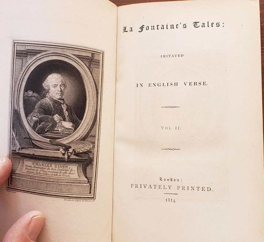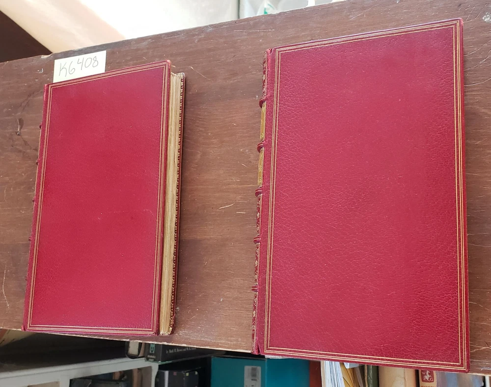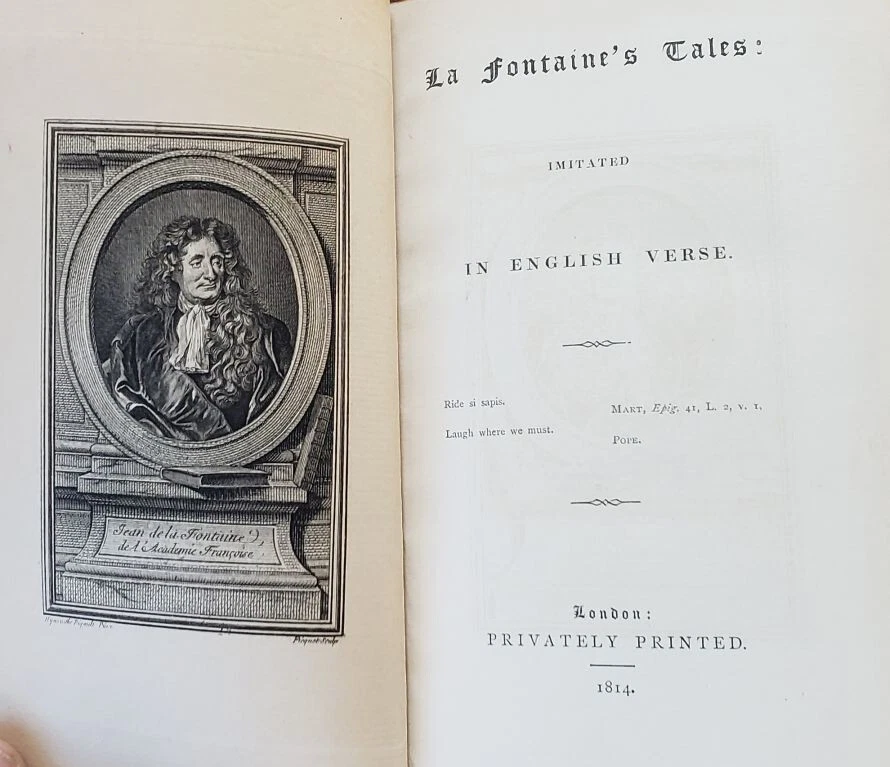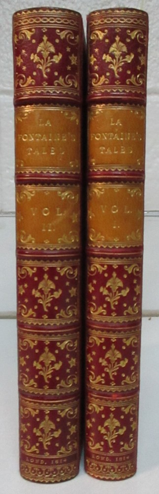 1814 2 Vol Set; La Fontaine's Tales, Fables; Fine Bindings, Gilt Leather La Fontaine's Tales by Jean de le Fontaine privately printed, London Jean de La Fontaine collected fables from a wide variety of sources, both Western and Eastern, and adapted them into French free verse. They were issued under the general title of Fables in several volumes from 1668 to 1694 and are considered classics of French literature. Humorous, nuanced and ironical, they were originally aimed at adults but then entered the educational system and were required learning for school children. Hardcover in Excellent Condition: No loose or missing pages, no water damage. No highlighting or underlining. Cover has minor surface wear. Numbers written on top corner of first page. A few pages have minor foxing. Gilt intact on top page edges. Books look very presentable. Printer unknown. 460 pages total, 1814, 8x5" k-h-6408 red