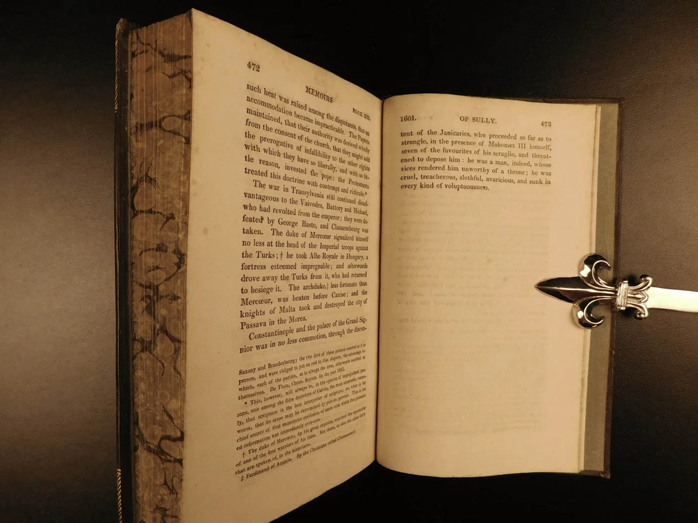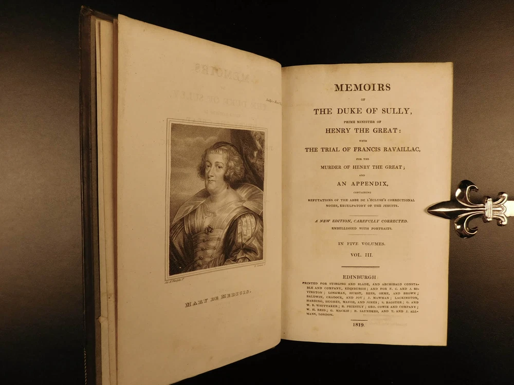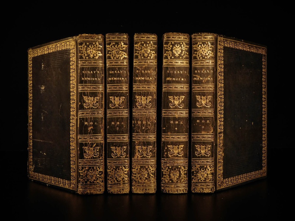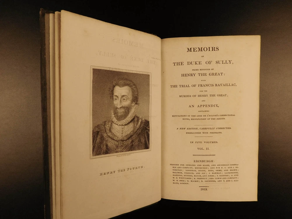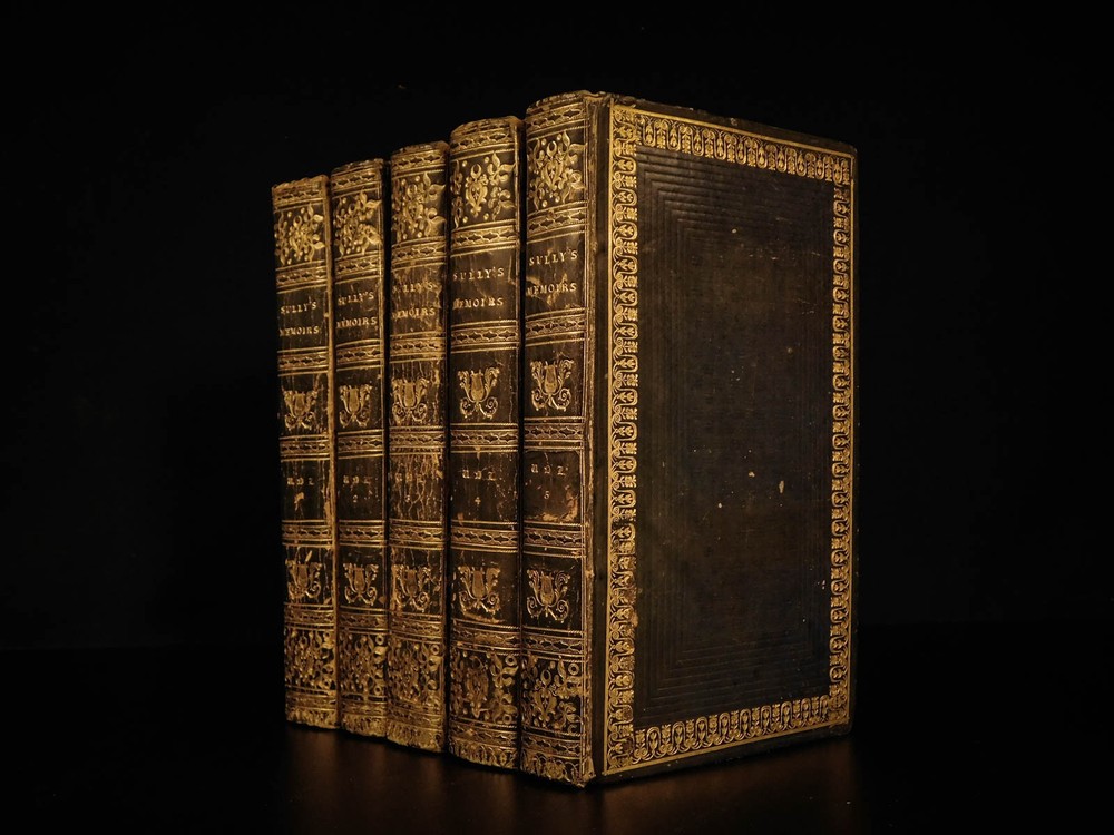 1819 Memoires of Duke of Sully France Henry IV Huguenot Utopian Europe 5v SET “A very valuable memoire of the history of the reign of Henry IV” Maximlien de Bethune was a 16 th -century French statesman who was the first Duke of Sully. Most known for his service under Henry IV of France, Sully left a collection of memoirs which is now a valuable and important work on the history of France during the reign of Henry the Great. Even though ‘Memoires’ contains many fictitious stories, it is still recognized for its accuracy and portrayal of European royalty. The most controversial section of ‘Memoires’ is Sully’s vision of a utopian society designed for all of Europe. He envisioned a Christian republic that was governed by a ‘Very Christian Council’ in which all differences were resolved and a military was complete removed. Some scholars even claim that Sully’s plan helped establish what would become the current European Union. According to Tulard, this work is a “very valuable memoire of the history of the reign of Henry IV.” Item number: #5198 Price: $550 BETHUNE, Maximilien de Duke of Sully Memoirs of the Duke de Sully, Prime Minister of Henry the Great. With the trial of Francis Ravaillac ... and an appendix, containing refutations of the Abbé de l'Écluse's correctional notes, exculpatory of the Jesuits. A new edition, carefully corrected. Embellished with portraits. Edinburgh : Stirling & Slade; Archibald Constable & Co. ; London : F. C. & J. Rivington, etc., 1819. New and revised edition. Details : · Collation: Complete with all pages o 5 volumes § xxix, 483 § 473 § 502 § 554 § 267, index (unpaginated) · Language: English · Binding: Leather; tight and secure · Size : ~8in X 5in (20cm x 12.5cm) Our Guarantee: Very Fast. Very Safe. Free Shipping Worldwide. Customer satisfaction is our priority! Notify us with 7 days of receiving, and we will offer a full refund without reservation! 5198