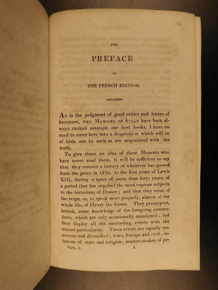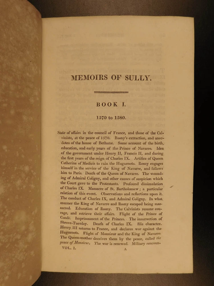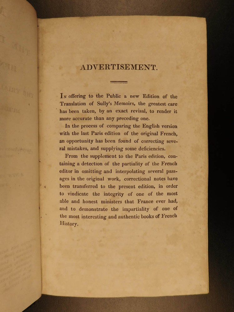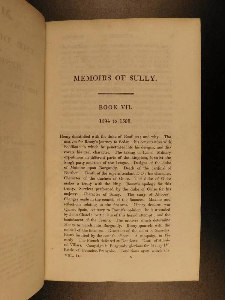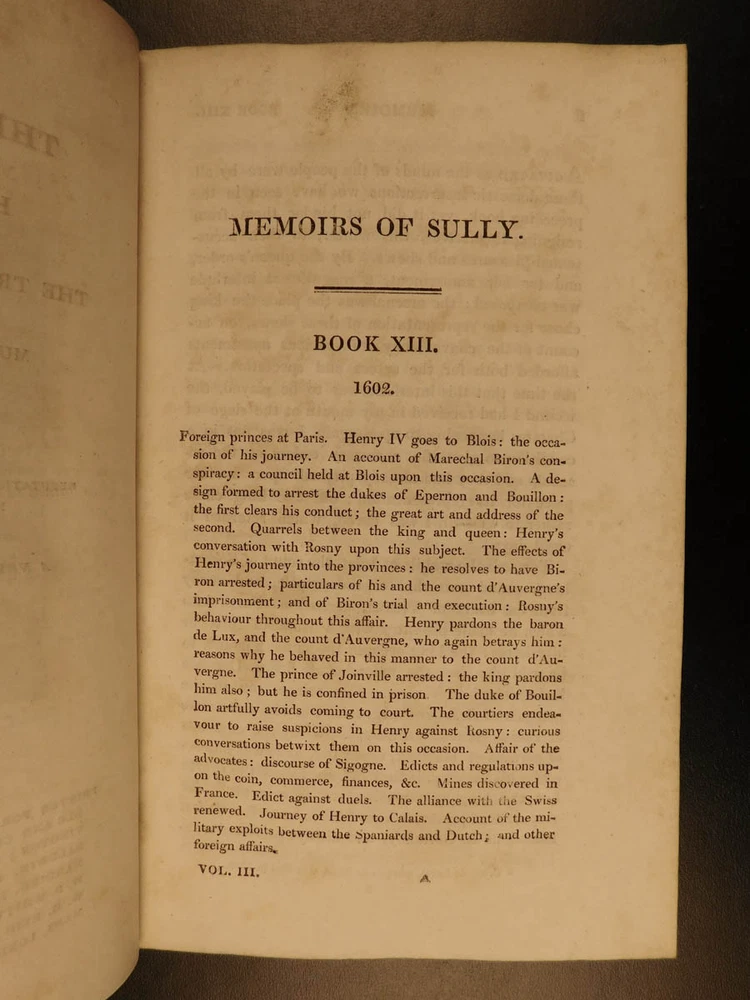 1819 Memoires of Duke of Sully France Henry IV Huguenot Utopian Europe 5v SET “A very valuable memoire of the history of the reign of Henry IV” Maximlien de Bethune was a 16 th -century French statesman who was the first Duke of Sully. Most known for his service under Henry IV of France, Sully left a collection of memoirs which is now a valuable and important work on the history of France during the reign of Henry the Great. Even though ‘Memoires’ contains many fictitious stories, it is still recognized for its accuracy and portrayal of European royalty. The most controversial section of ‘Memoires’ is Sully’s vision of a utopian society designed for all of Europe. He envisioned a Christian republic that was governed by a ‘Very Christian Council’ in which all differences were resolved and a military was complete removed. Some scholars even claim that Sully’s plan helped establish what would become the current European Union. According to Tulard, this work is a “very valuable memoire of the history of the reign of Henry IV.” Item number: #5198 Price: $550 BETHUNE, Maximilien de Duke of Sully Memoirs of the Duke de Sully, Prime Minister of Henry the Great. With the trial of Francis Ravaillac ... and an appendix, containing refutations of the Abbé de l'Écluse's correctional notes, exculpatory of the Jesuits. A new edition, carefully corrected. Embellished with portraits. Edinburgh : Stirling & Slade; Archibald Constable & Co. ; London : F. C. & J. Rivington, etc., 1819. New and revised edition. Details : · Collation: Complete with all pages o 5 volumes § xxix, 483 § 473 § 502 § 554 § 267, index (unpaginated) · Language: English · Binding: Leather; tight and secure · Size : ~8in X 5in (20cm x 12.5cm) Our Guarantee: Very Fast. Very Safe. Free Shipping Worldwide. Customer satisfaction is our priority! Notify us with 7 days of receiving, and we will offer a full refund without reservation! 5198
