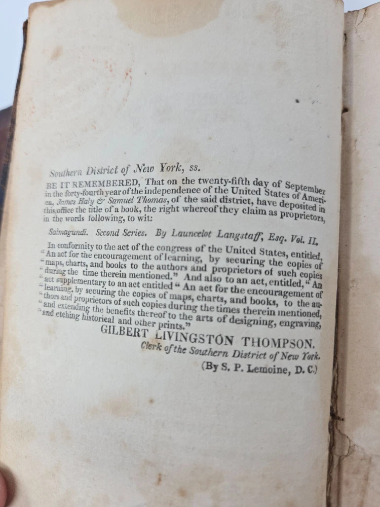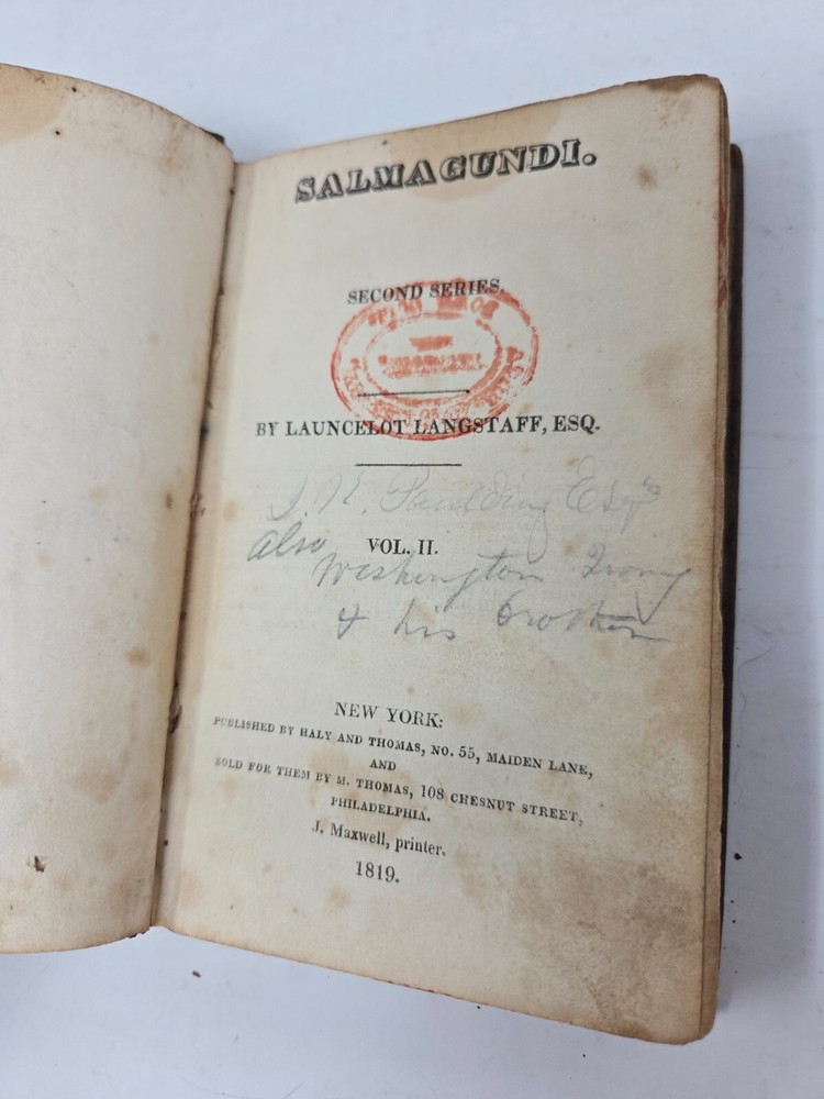 1819 Salmagundi , Second Series – Vol. I & II by Launcelot Langstaff, Esq. Published by Haly and Thomas, New York | Printed by J. Maxwell | Complete 2-Volume Set Offered here is a scarce two-volume set of Salmagundi , Second Series (1819), penned under the pseudonym Launcelot Langstaff by Washington Irving, along with his brother William Irving and James Kirke Paulding. These satirical essays offer a witty critique of early 19th-century American society, politics, and culture. Bibliographic Details: Title: Salmagundi, Second Series Author: Launcelot Langstaff, Esq. (pseudonym of Washington Irving et al.) Publisher: Haly and Thomas, No. 55 Maiden Lane, New York Printer: J. Maxwell Year: 1819 Volumes: I and II (complete set) Provenance: Bowdoin College library & pencil ownership inscription Condition: Full leather bindings with heavy surface wear, rubbing, and scuff marks Spines and hinges worn but intact; bindings solid Interior pages have age toning, foxing, and edge wear Library stamp and prior ownership inscriptions present Text is complete and readable throughout This early American literary set is an important milestone in U.S. satire, representing the early voice of Irving before his more famous works like The Legend of Sleepy Hollow . Rare in matching volumes with strong provenance. We provide FAST shipping, REASONABLE prices, and EXCEPTIONAL customer service. Our GOAL is to make your buying experience on e b a y the BEST it can be. Every item is CAREFULLY packed to ensure it arrives SAFELY at your door. Have questions? Feel free to send us a message—we’re here to help and respond quickly! Don’t forget to visit our store for more great finds like this one. Thank you for stopping by!