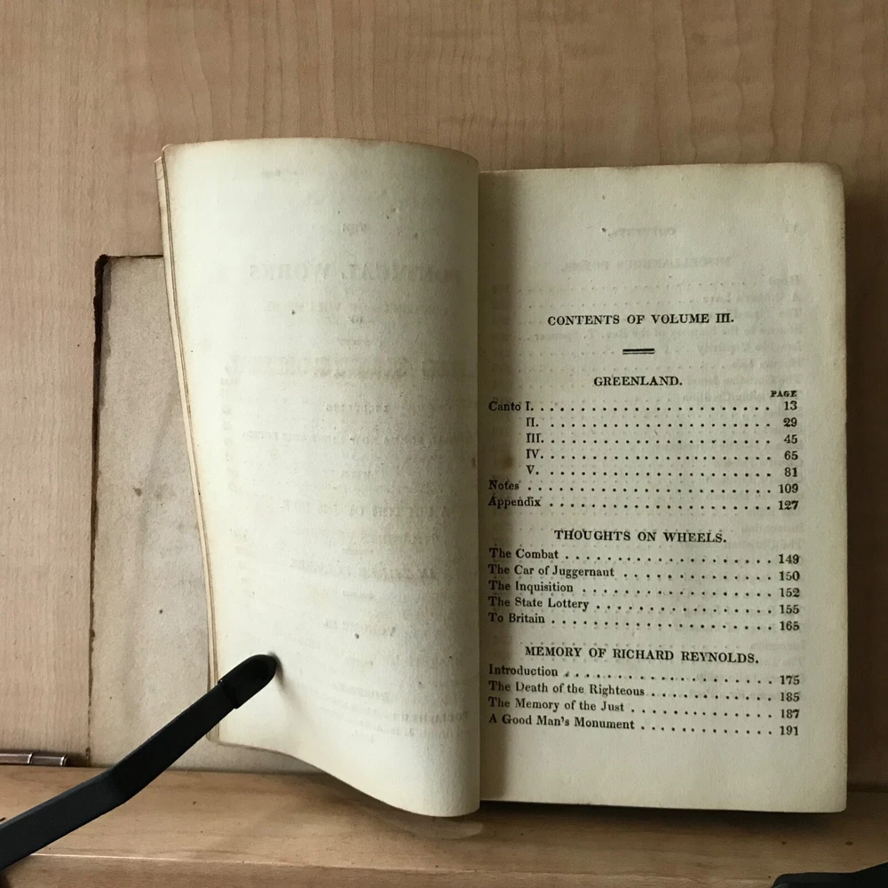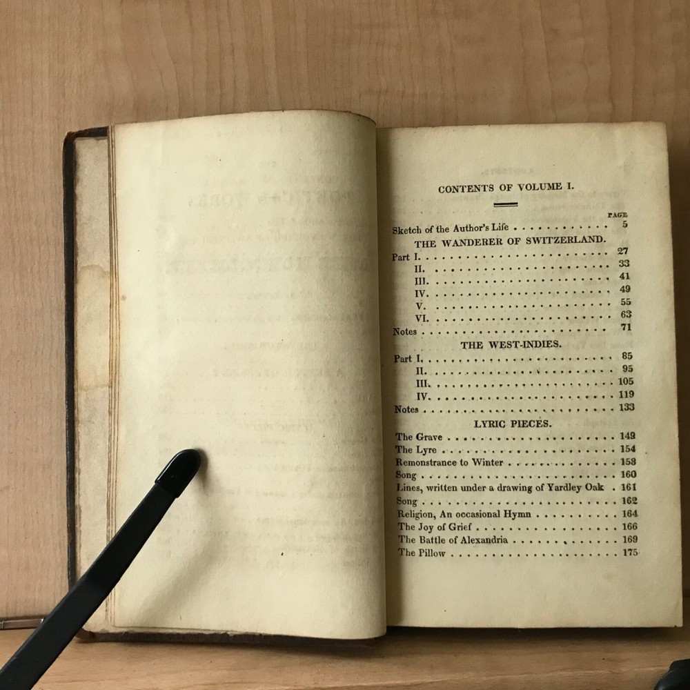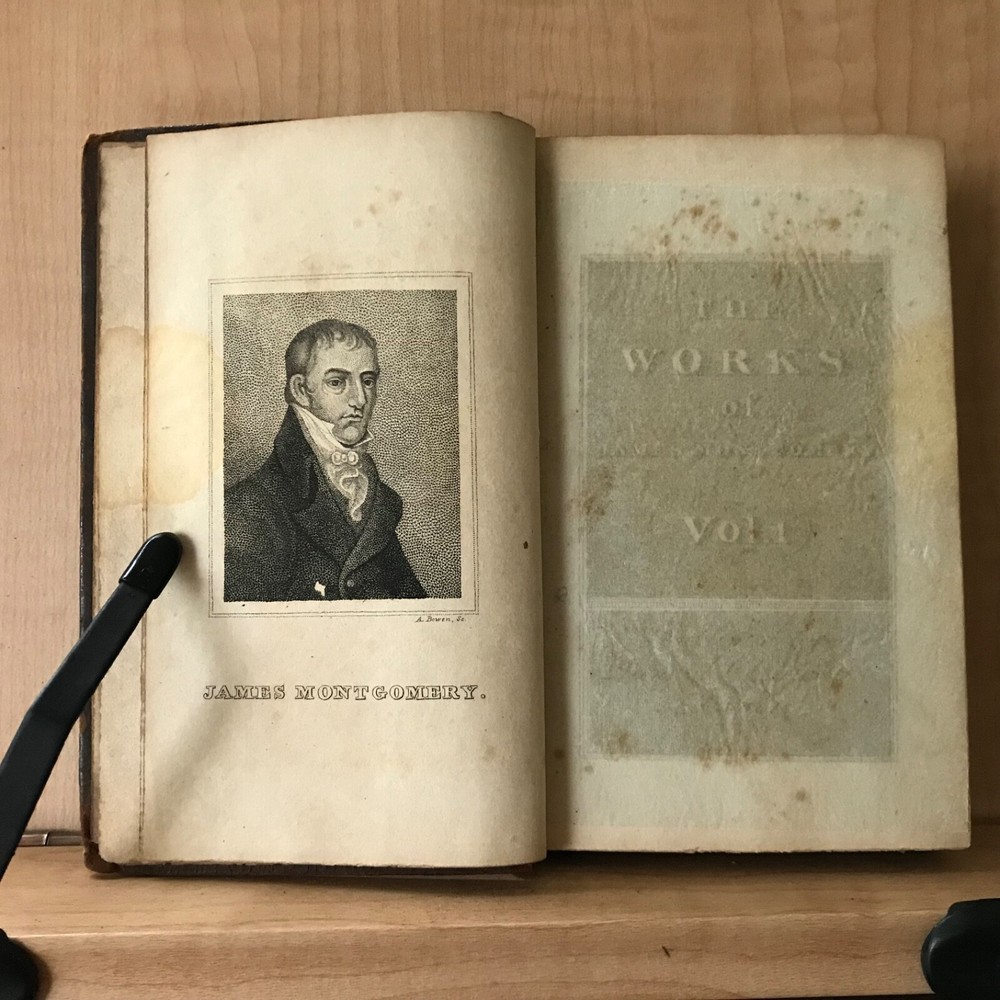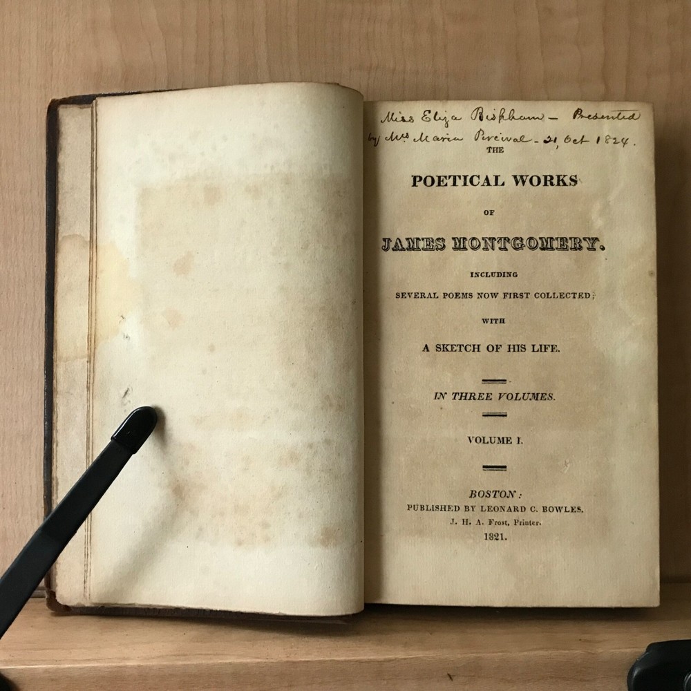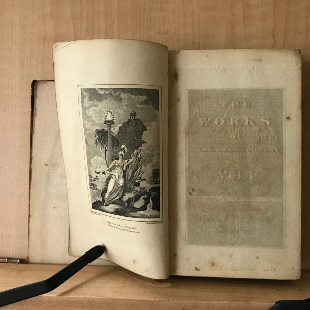 The Poetical Works of James Montgomery. Including Several Poems Now First Collected; with A Sketch of His Life, Complete in Three Volumes, Published by Leonard C. Bowles, Boston, 1821, three frontispieces and decorative titles, marbled leather bindings, 5.75 x 4”, 32mo. In good condition. Front board of volume three detached. Light wear to extremities with minor scuffing to corners, joints and end bands. A few mild scratch marks to surface of boards, but overall soft and rich in color. Decorative gilt tooling remains bright and clean. Spines exhibit minor loss at heads and tails, remain attractive despite this. Bookplate of Aaron O. Shuff on front pastedown of volume one serial No. 286. Some dampness staining in the beginning signature of volume one. Light offsetting from plates, tissue guards intact. Interiors good with minor toning. Free of too much foxing. Free of known marginalia. Miss Eliza Biskham Presented by Miss Maria Percival 21, Oct. 1824 on old hand manuscript on title pages. Bindings tight and intact. Irregular bleached staining to fore-edges. Please see photos. A distinguished edition of Montgomery, a poet of great interest to Americanists and historians of abolition. The early owner of this set, Aaron O. Shuff, ran the Steamboat Hotel near the wharf in Bloomsbury (South Trenton), on the Delaware River in the early 1820's, and beyond. Even with its defects, this is a handsome little set. COLL1831BDEN