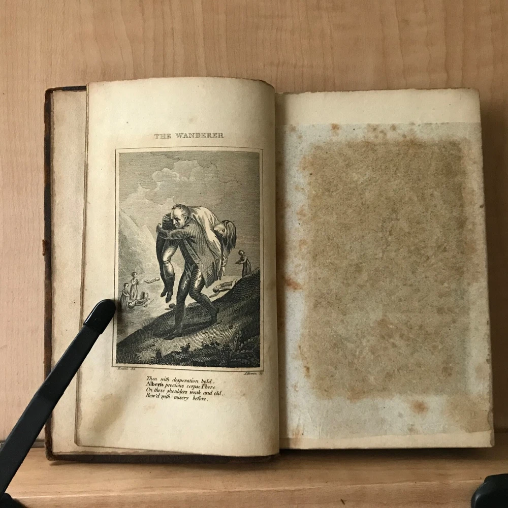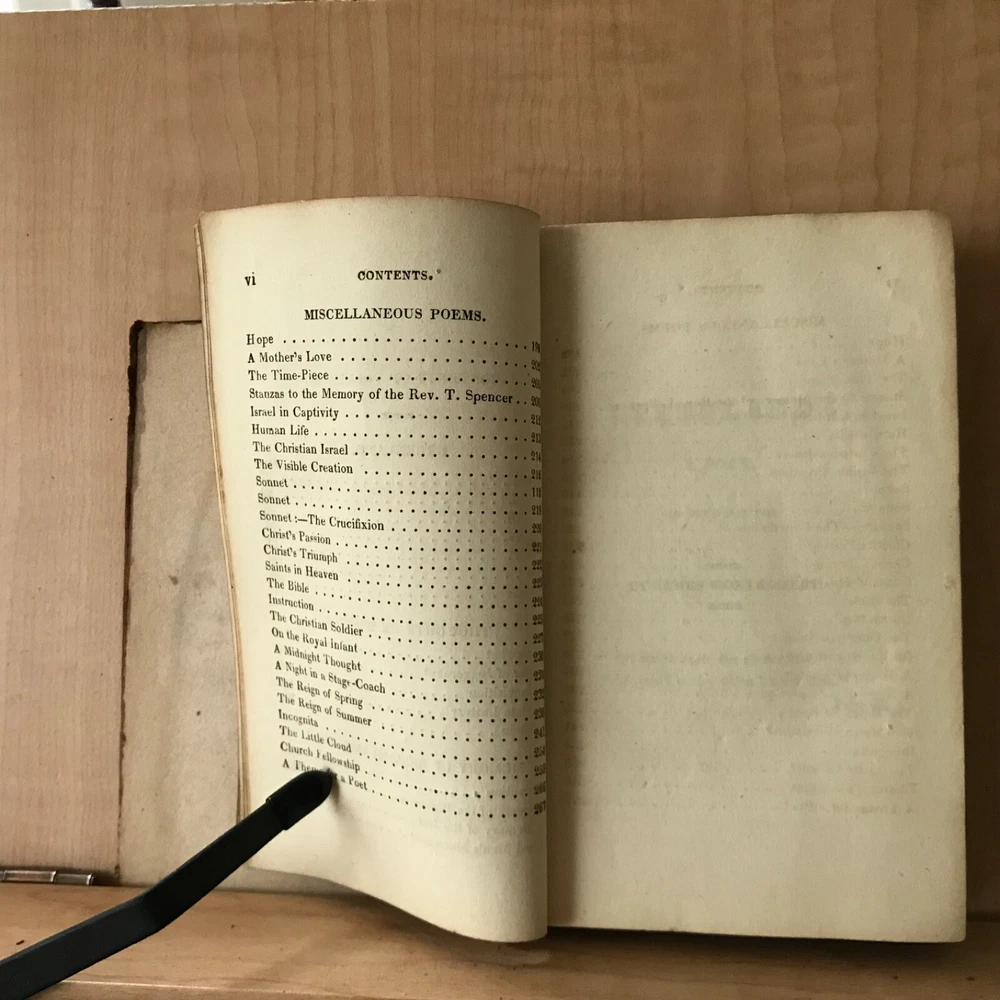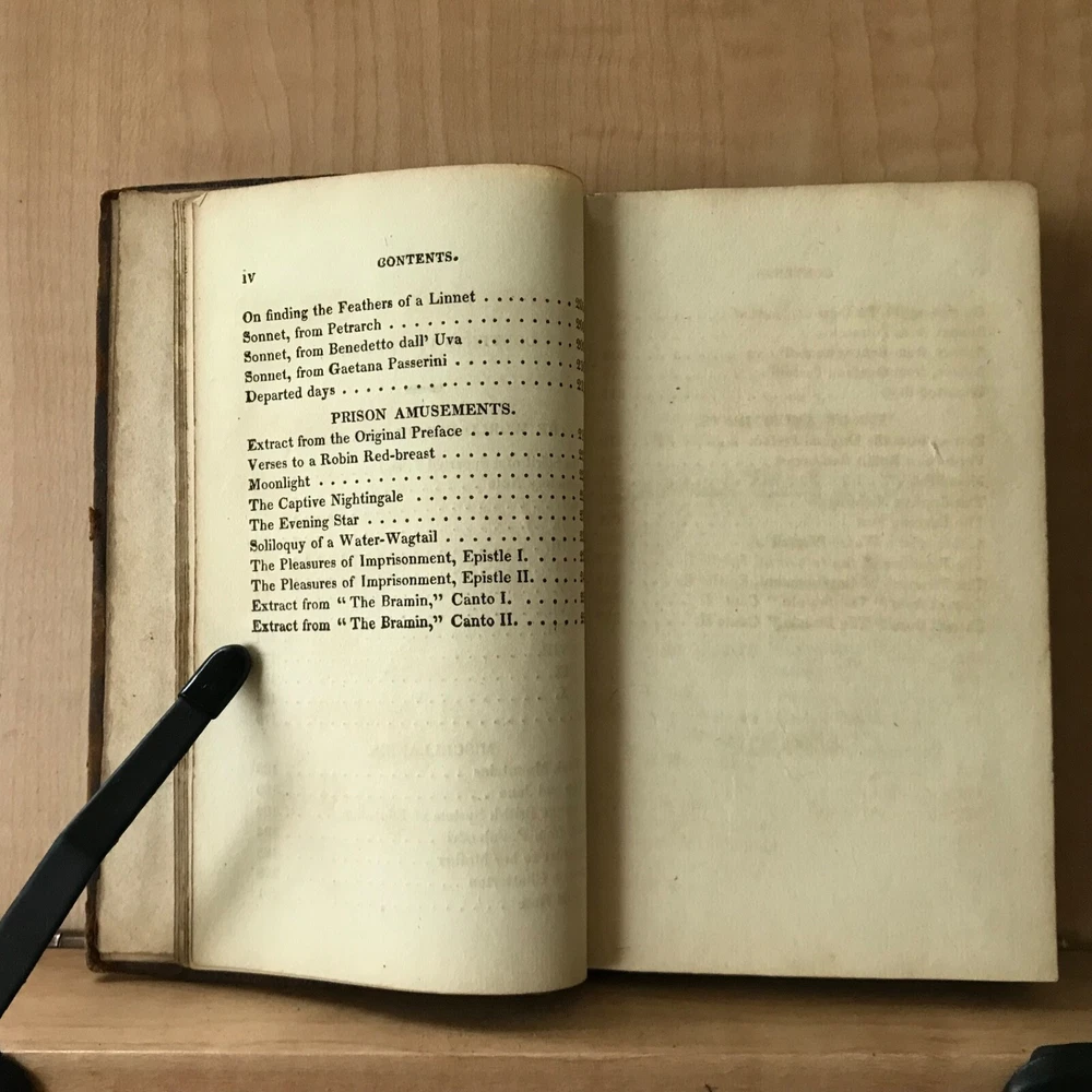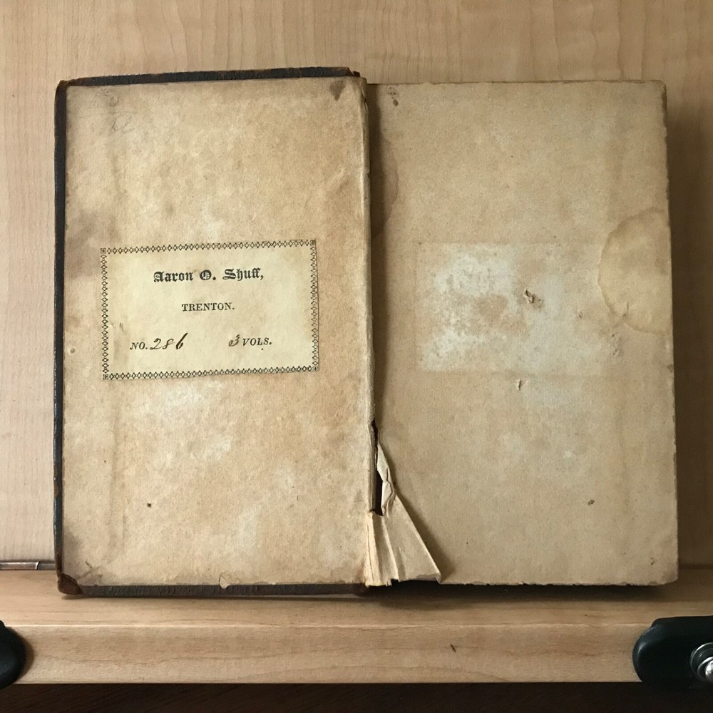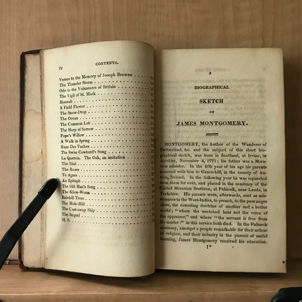 The Poetical Works of James Montgomery. Including Several Poems Now First Collected; with A Sketch of His Life, Complete in Three Volumes, Published by Leonard C. Bowles, Boston, 1821, three frontispieces and decorative titles, marbled leather bindings, 5.75 x 4”, 32mo. In good condition. Front board of volume three detached. Light wear to extremities with minor scuffing to corners, joints and end bands. A few mild scratch marks to surface of boards, but overall soft and rich in color. Decorative gilt tooling remains bright and clean. Spines exhibit minor loss at heads and tails, remain attractive despite this. Bookplate of Aaron O. Shuff on front pastedown of volume one serial No. 286. Some dampness staining in the beginning signature of volume one. Light offsetting from plates, tissue guards intact. Interiors good with minor toning. Free of too much foxing. Free of known marginalia. Miss Eliza Biskham Presented by Miss Maria Percival 21, Oct. 1824 on old hand manuscript on title pages. Bindings tight and intact. Irregular bleached staining to fore-edges. Please see photos. A distinguished edition of Montgomery, a poet of great interest to Americanists and historians of abolition. The early owner of this set, Aaron O. Shuff, ran the Steamboat Hotel near the wharf in Bloomsbury (South Trenton), on the Delaware River in the early 1820's, and beyond. Even with its defects, this is a handsome little set. COLL1831BDEN