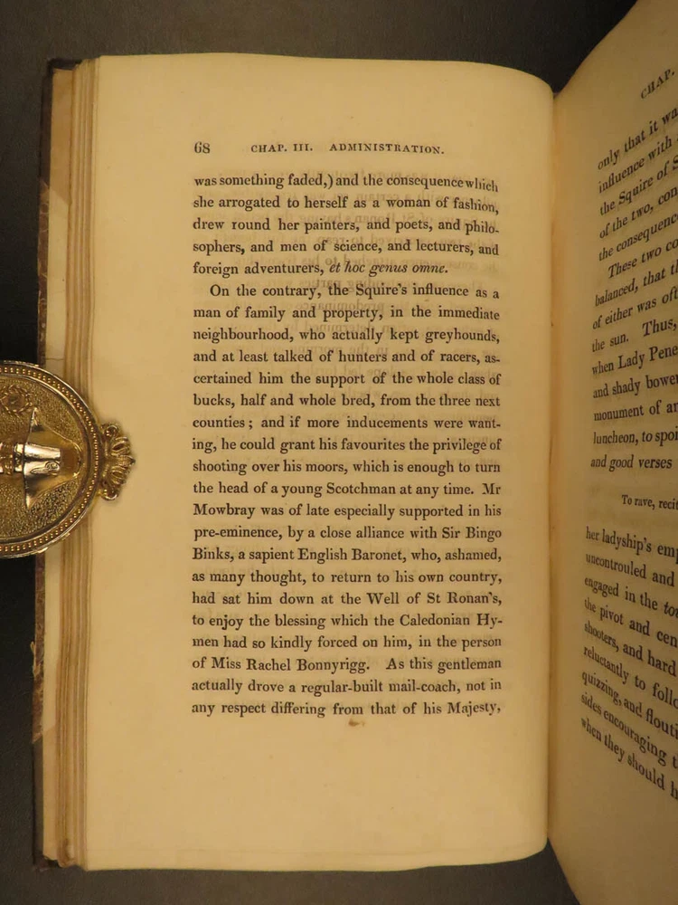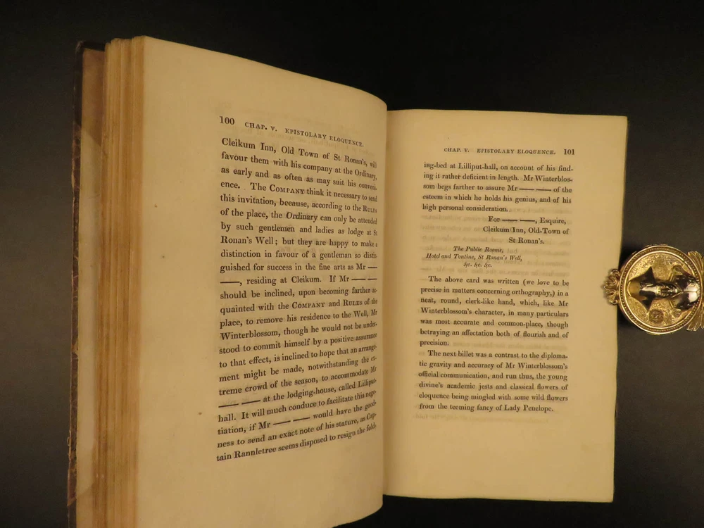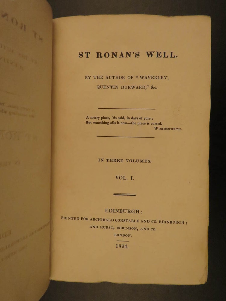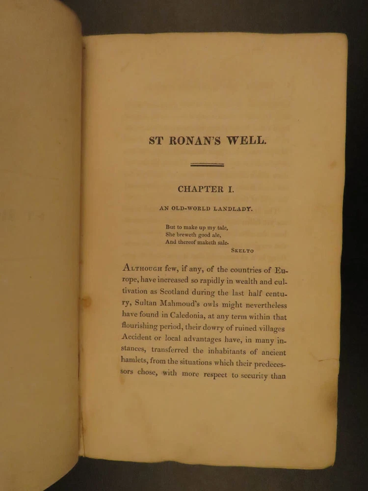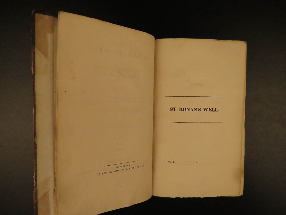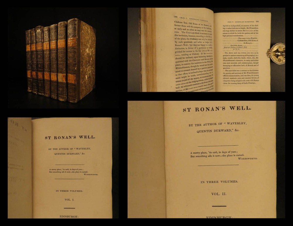 1822 1 st eds SCOTTISH Sir Walter Scott Saint Ronan’s Well Peveril of Peak 7v SET Sir Walter Scott was a Scottish historical novelist, playwright and poet. Many of his works remain classics of both English-language literature and of Scottish literature. These volumes are the true first Scottish edition of Scott’s famous books ‘ St. Ronan’s Well ’ and ‘ Peveril of the Peak .’ Scott's novel, Peveril of the Peak tracks the events of the Popish Plot of 1678, in which Jesuits were accused of planning the assassination of King Charles II in order to make his Roman Catholic brother, the Duke of York, King. Set during the time of the pretended Popish Plot (1678). "The author draws elaborate portraits of Charles II and Buckingham, and gives glimpses of such historical characters as Titus Oates, Colonel Blood (the impudent revolutionary who tried to steal the crown jewels from the Tower), and Sir Geoffrey Hudson (Henritta Maria’s dwarf)." (Oxford Companion to English Literature) St. Ronan's Well is a novel of Social Criticism and it is one of Scott's most bitter and scathingly satirical novels. In fact, a scene in which a forced marriage is consummated was so unpleasant that the publishers forced him to alter his plot. These seven volumes are the first Scottish editions of both works printed in Edinburgh. Item number: #12254 Price: $599 SCOTT, Walter [works] Edinburgh: Printed for Archibald Constable and Co. Edinburgh; And Hurst, Robinson, and Co. London, 1822, 1824. First Edition. Details : · Collation: Complete with all pages; 7 volumes o “Peveril of the Peak” 4 volumes o “St. Ronan’s Well” 3 volumes · References; Todd 165a; · Provenance: Bookplate – W. Clementine, 1901 · Language: English · Binding: Leather; tight & secure · Size : ~7.5in X 4.75in (19cm x 12cm) Our Guarantee: Very Fast. Very Safe. Free Shipping Worldwide. Customer satisfaction is our priority! Notify us with 7 days of receiving, and we will offer a full refund without reservation! 12254