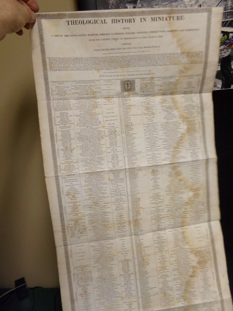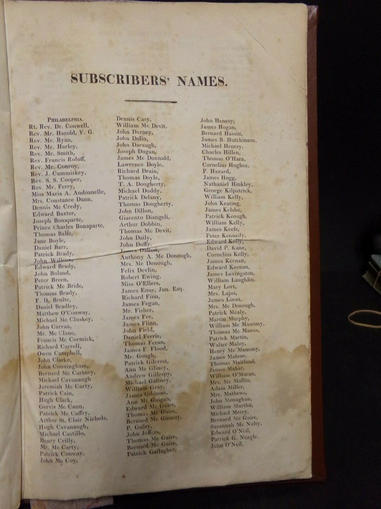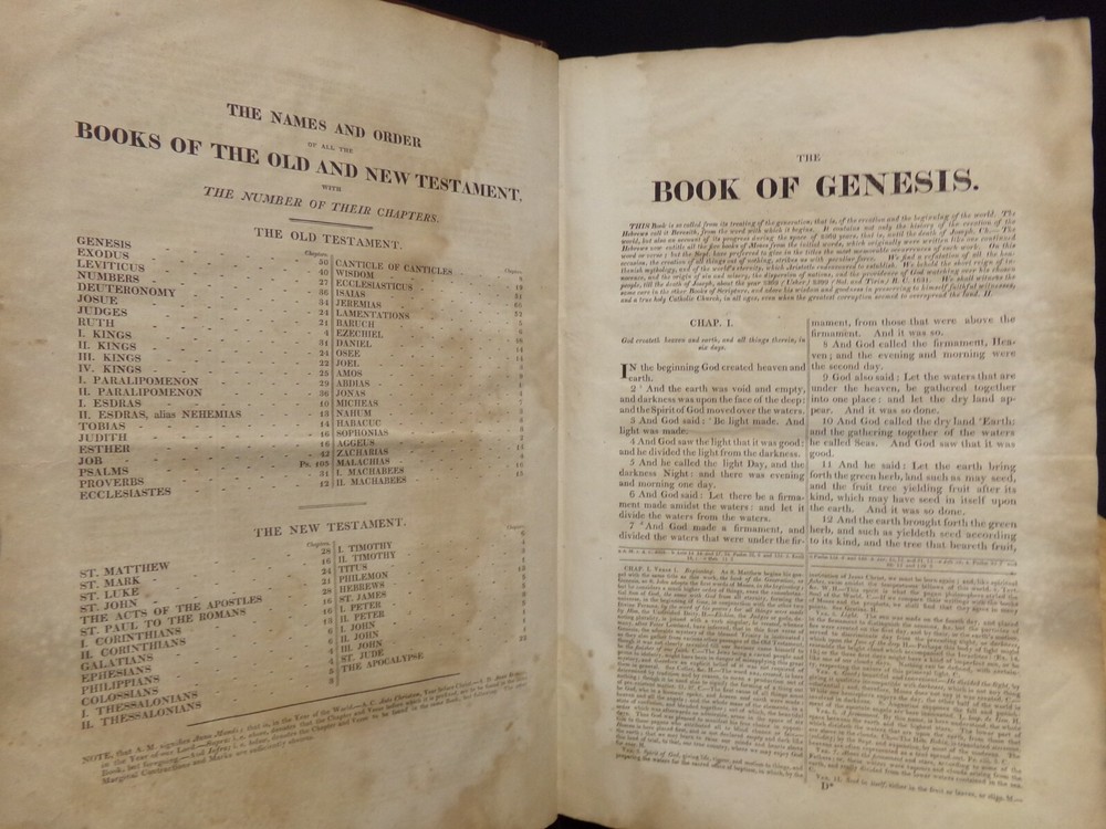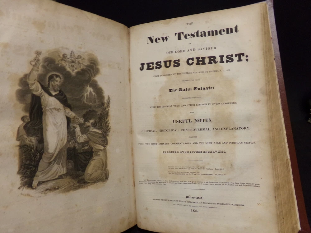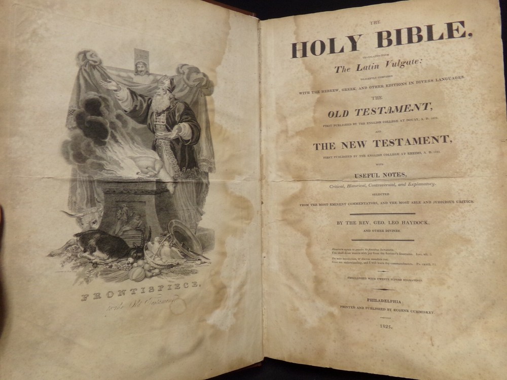 1825 Catholic Bible. Largest printed in America. 2 Volume Set. Catholic Douay-Rheims Version. Hill's Reference #518. Published & Printed by Eugene Cummiskey, Philadelphia. Complete as published. Good condition. Some foxing but very readable. New brown leather binding with tan title plate with gold gilt on spine. Spine has 7 raised ribs. Embellished with 20 engravings. Weighs 24 lbs. Each volume size: 11 1/2" x 17 1/2" x 2 3/4" thick. See pictures. -Fold out Theological History Chart -Subscriber's names listed. -Sold by subscription. -1000 copies printed. Store - top of bookshelf #25