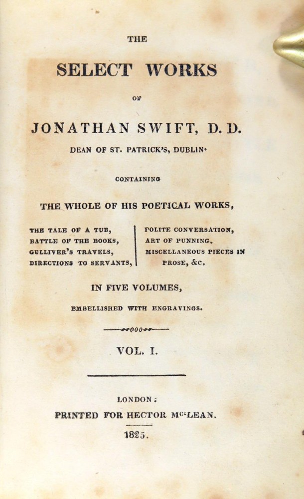 Hardcover. 16mo. Published by Hector M'lean, London, UK. 1825. 5 volumes. Illustrated with engravings, Volume I has five plates, Volume II has four plates, Volume III has two, Volume IV has two, and Volume V has two. DJ has light shelf-wear present to the DJ extremities. Bound in cloth boards with titles present to the spine and front board. Boards have light shelf-wear present to the extremities. No ownership marks present. Text is clean and free of marks. Binding tight and solid. Jonathan Swift (30 November 1667 ? 19 October 1745) was an Anglo-Irish satirist, essayist, political pamphleteer (first for the Whigs, then for the Tories), poet, and Anglican cleric who became Dean of St Patrick's Cathedral, Dublin, hence his common sobriquet, "Dean Swift". 1825 The Select Works of Jonathan Swift DD 5 Volume Set Leather Binding 1825 The Select Works of Jonathan Swift DD 5 Volume Set Leather Binding Description Up For Sale Today is The Select Works of Jonathan Swift D. D. Volume I-V Hardcover. 16mo. Published by Hector M'lean, London, UK. 1825. 5 volumes. Illustrated with engravings, Volume I has five plates, Volume II has four plates, Volume III has two, Volume IV has two, and Volume V has two DJ has light shelf-wear present to the DJ extremities. Bound in cloth boards with titles present to the spine and front board. Boards have light shelf-wear present to the extremities. No ownership marks present. Text is clean and free of marks. Binding tight and solid. Jonathan Swift (30 November 1667 ? 19 October 1745) was an Anglo-Irish satirist, essayist, political pamphleteer (first for the Whigs, then for the Tories), poet, and Anglican cleric who became Dean of St Patrick's Cathedral, Dublin, hence his common sobriquet, "Dean Swift". OUR MISSION STATEMENT: Our goal is to provide the best books for the lowest prices. We understand that you have more choices than ever to buy books, so we strive to provide the best service, accurate descriptions, the cheapest shipping and the best customer service in the realm of bookselling. Thank you for visiting this listing and we hope to see you again soon! Book formats and corresponding sizes Name Abbreviations Leaves Pages Approximate cover size (width × height) inches cm folio 2º or fo 2 4 12 × 19 30.5 × 48 quarto 4º or 4to 4 8 9½ × 12 24 × 30.5 octavo 8º or 8vo 8 16 6 × 9 15 × 23 duodecimo or twelvemo 12º or 12mo 12 24 5 × 7⅜ 12.5 × 19 sextodecimo or sixteenmo 16º or 16mo 16 32 4 × 6¾ 10 × 17 octodecimo or eighteenmo 18º or 18mo 18 36 4 × 6½ 10 × 16.5 trigesimo-secundo or thirty-twomo 32º or 32mo 32 64 3½ × 5½ 9 × 14 quadragesimo-octavo or forty-eightmo 48º or 48mo 48 96 2½ × 4 6.5 × 10 sexagesimo-quarto or sixty-fourmo 64º or 64mo 64 128 2 × 3 5 × 7.5 ALL ITEMS ARE DESCRIBED TO THE BEST OF MY ABILITY! PLEASE CHECK ALL THE PHOTOS BEFORE BIDDING! PAYMENT IS DUE WITHIN FOUR (4) DAYS OF THE INVOICE! Import duties, taxes and charges are not included in the item price. These charges are the buyer's responsibility. Please check with your country's customs office to determine what these additional costs will be prior to bidding/buying. These charges are typically collected by the delivering freight (shipping) company or when you pick the item up. We do not mark merchandise values below value or mark items as "gifts" as US and International government regulations prohibit such behavior. (This is a felony in the United States) Create your brand with Auctiva's Customizable Templates. Attention Sellers - Get Templates Image Hosting, Scheduling at Auctiva.com. Track Page Views With Auctiva's Counter