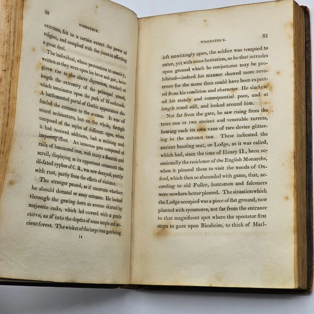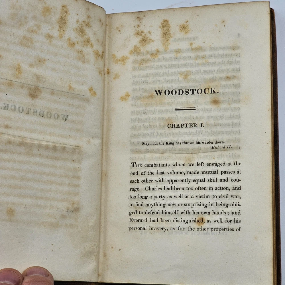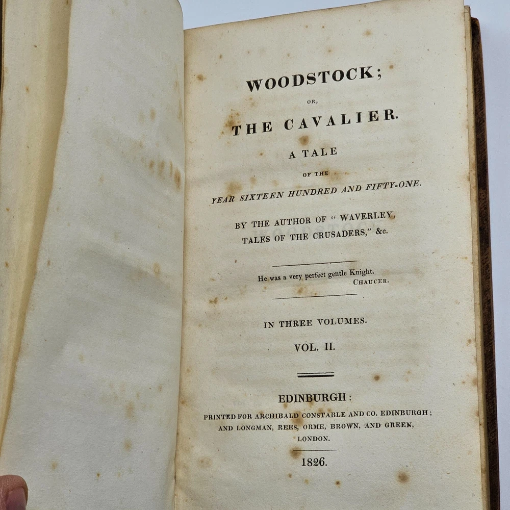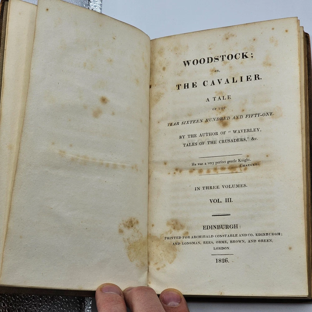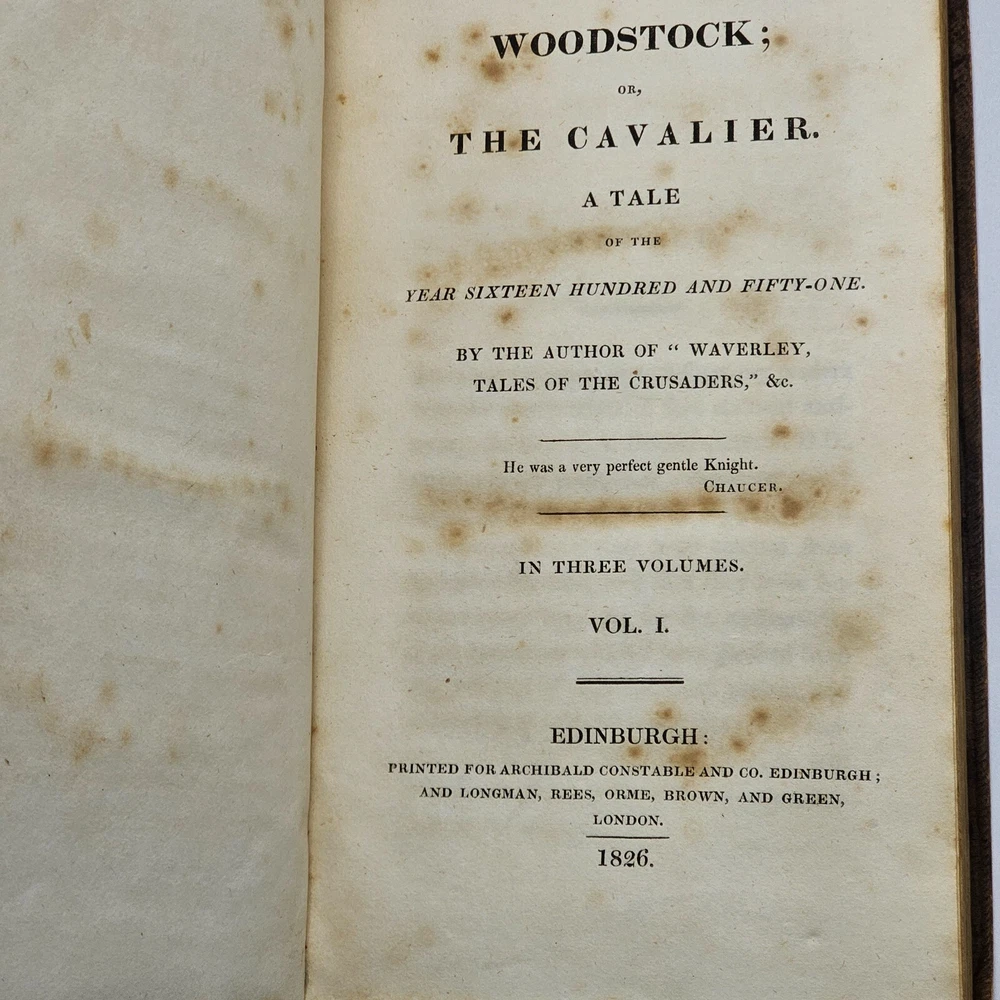 Antique Book WOODSTOCK OR, THE CAVALIER A TALE OF THE YEAR 1651 BY: THE AUTHOR OF "WAVERLY, TALES OF THE CRUSADES" (Walter Scott) 1826 SCOTTISH FIRST EDITION PUBLISHED BY: ARCHIBALD CONSTABLE THREE VOLUME SET Condition Good Plus Condition. Foxing, esp. to the initial pages (pictured). Boards are attached and bindings good. Please see photos for details. Satisfaction Guaranteed Combined Shipping Secure Packaging Assured Delivery Unconditional Returns See "Seller's other items" for more treasures from Dave's Café Américain