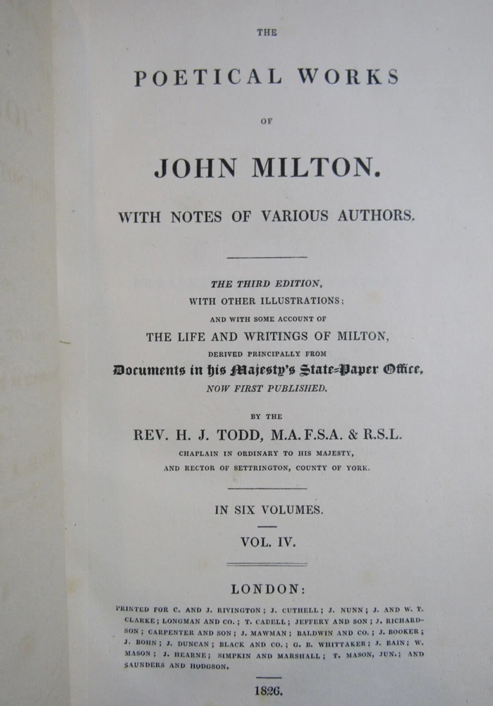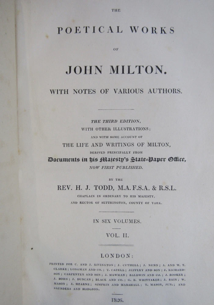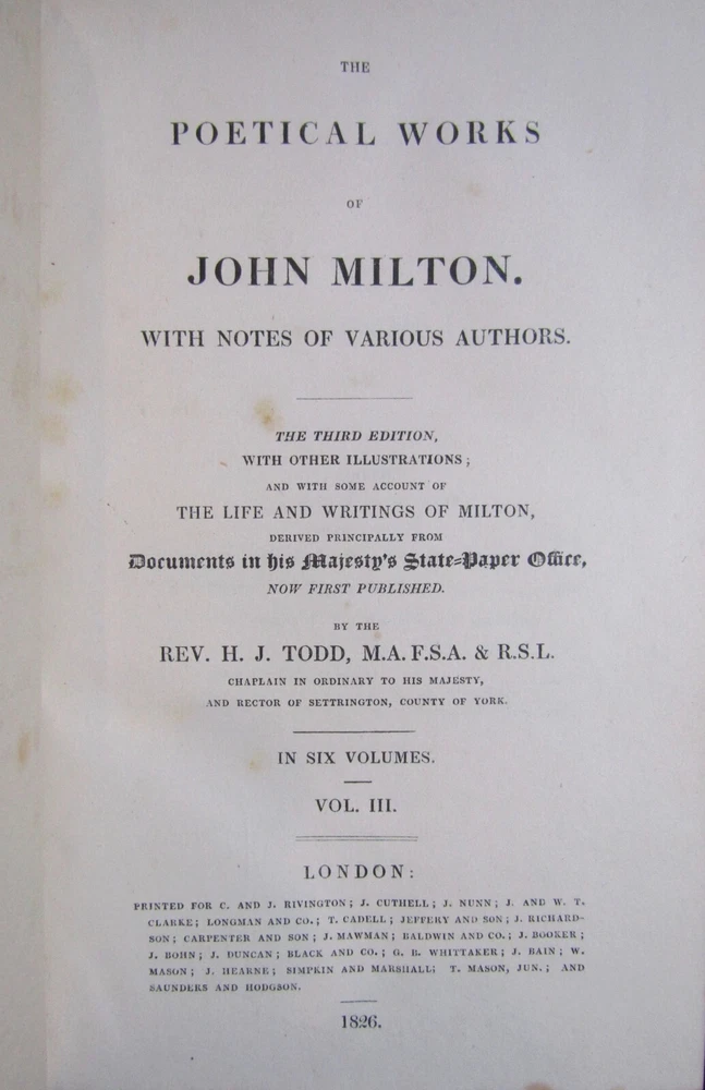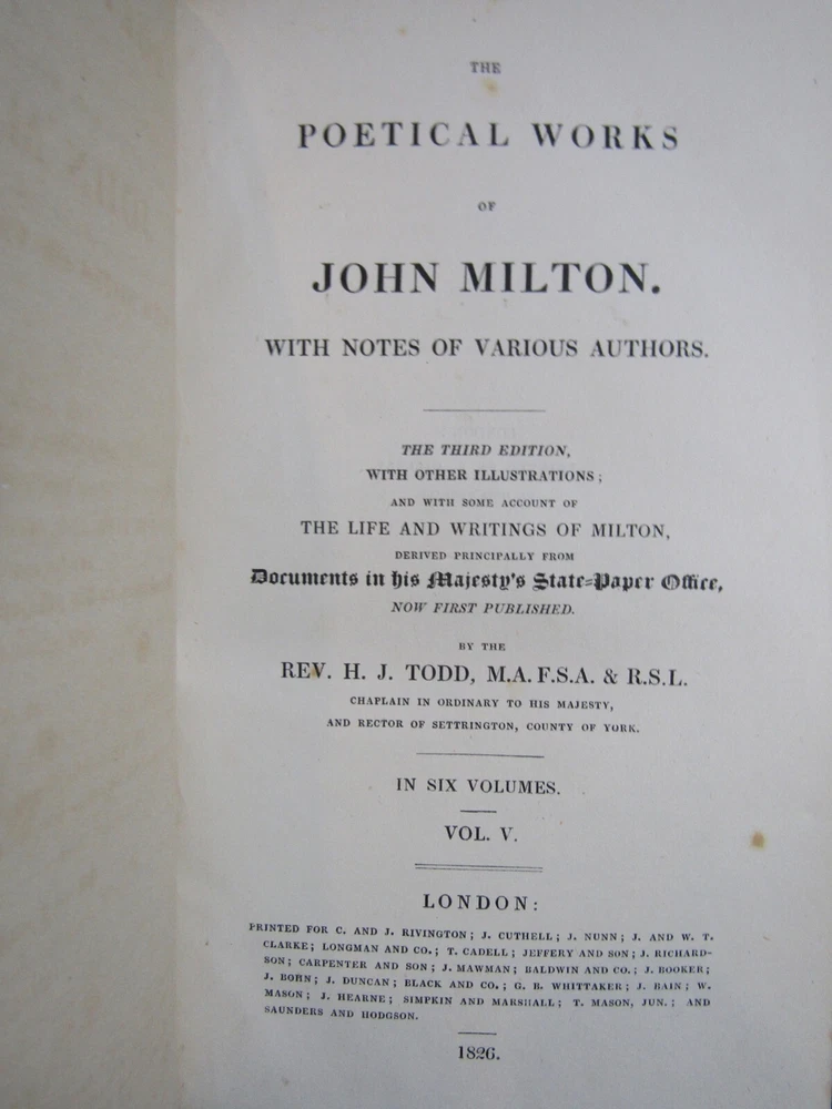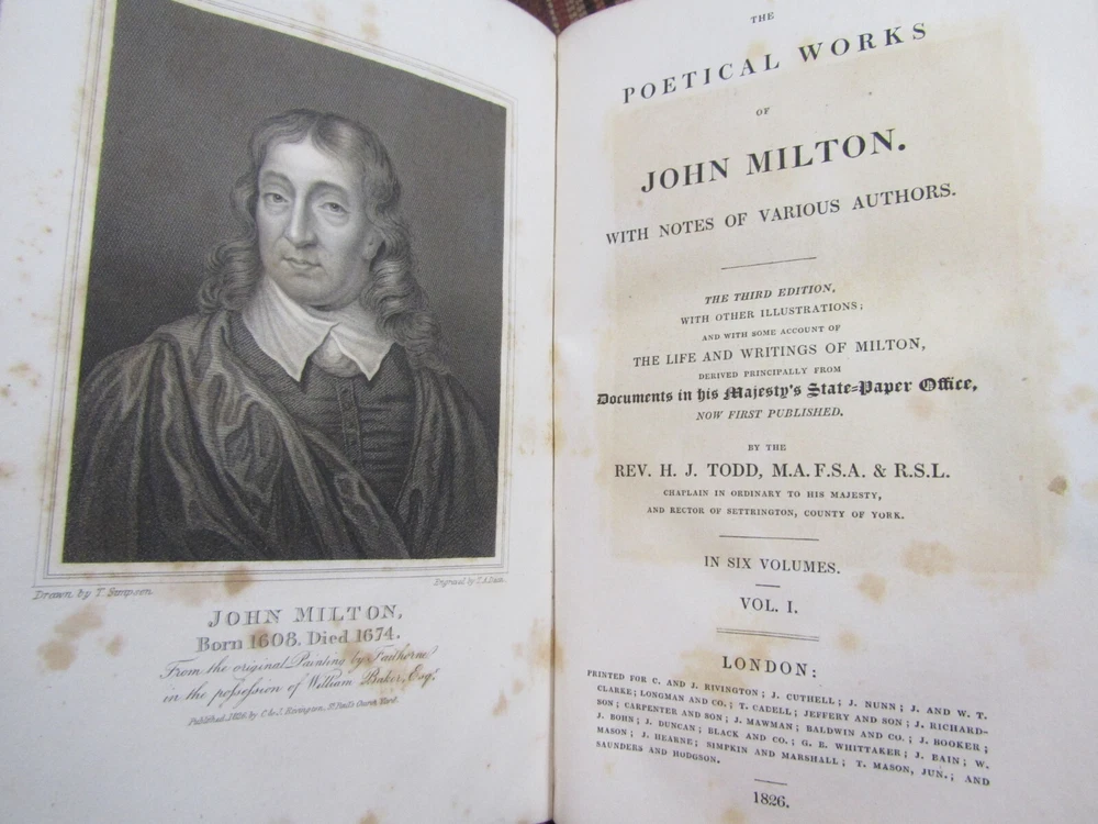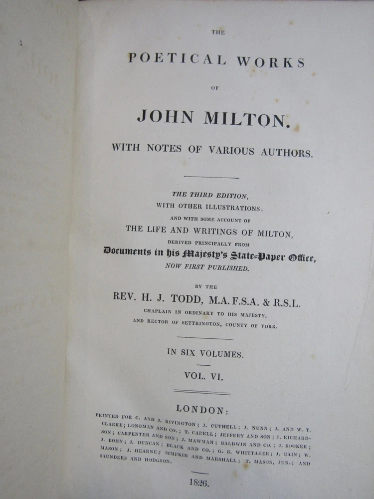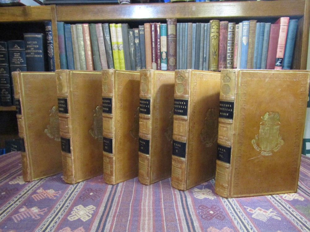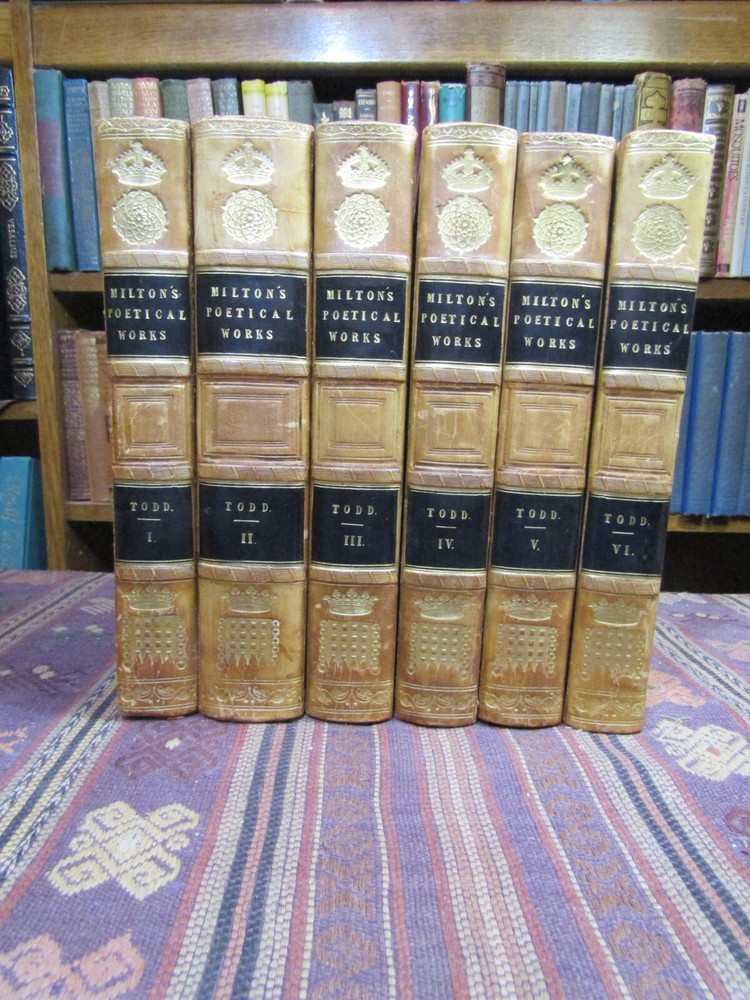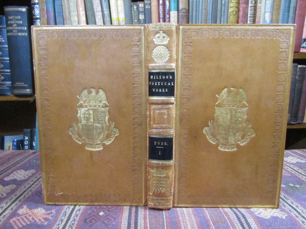 ~~Lovely Full Armorial Leather Bindings~~ ~ 6 Volume Set ~ Third Edition ~ ~ (Some Splitting to Rear Hinge of Volume I) ~ The Poetical Works of John Milton. With Notes of Various Authors. The Third Edition, with other Illustrations; and with Some Account of the Life and Writings of Milton. Derived Principally from Documents in his Majesty's State-Paper Office, now First Published [With "Paradise Lost", etc. 6 Volumes in Armorial Gilt Leather Bindings] By John Milton ~ Edited and with "Life" by Rev. H. J. Todd ~ London: Printed for E. and J. Rivington; J. Cuthell [et al], ~ 1826 ~ ************************************************* Octavos. Variously paginated. Hardcovers bound in lovely full calf with dual black leather labels and gilt stamping on the spines. Armorial bindings with crests on the front and rear covers on each volume embossed in gilt. Blind rules along the perimeters of the covers. The gilt crest has an left-facing eagle sitting on a crown above a shield. The shield has four compartments, two with three fleur-de-lis and two with three left facing lions and a motto of "Coll / Christi / Cant." All edges marbled, and all volumes with matching green marbled endpapers. The bindings generally show moderate wear and bumping, but the rear outer hinge on Volume I is splitting with the split running about 3 1/4 inches up from the foot of the spine. The rest of the volumes are a little rubbed but are fairly attractive and are sound. The text has light foxing. ***************************************** We Always Accept Returns if the Item Does Not Match the Description. If You Have any Questions, Please Do Not Hesitate to Ask! *************************************************** Come visit our OPEN SHOP in Greensboro, North Carolina. Shop Hours: 10-6 Mondays ~~ Saturdays ~~Closed on Sundays~~ Pages Past -- Used & Rare Books / 1837 Spring Garden St. / Greensboro, N.C. 27403 We are proud to have serviced the Greensboro area with an open bookshop since 1996 !
