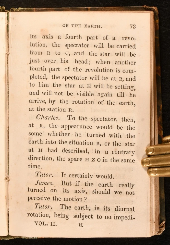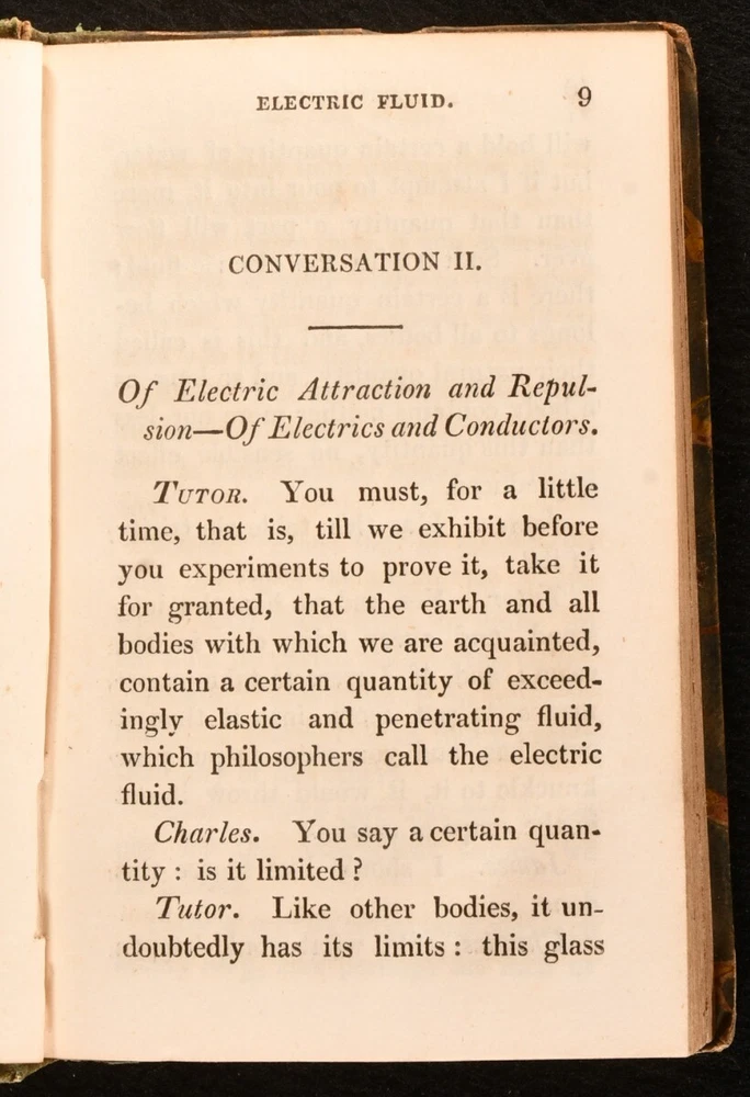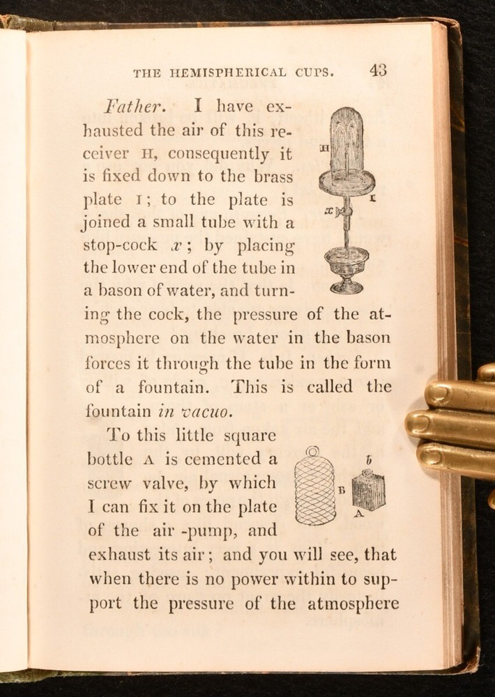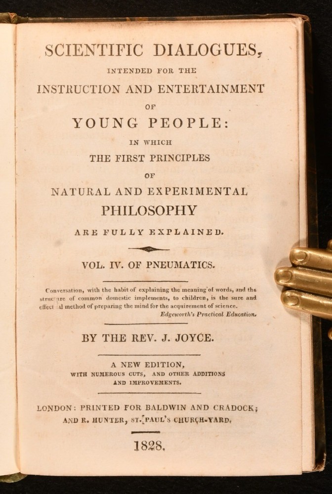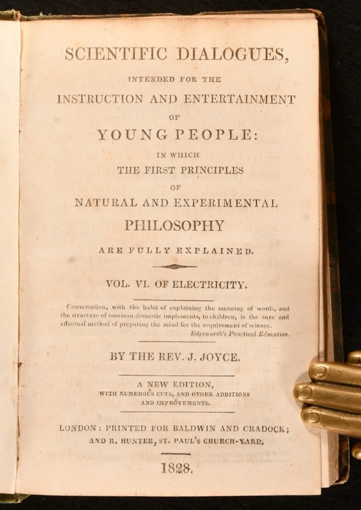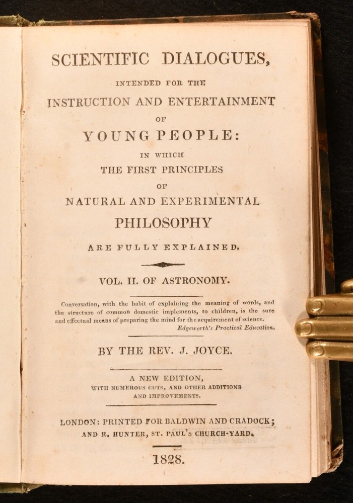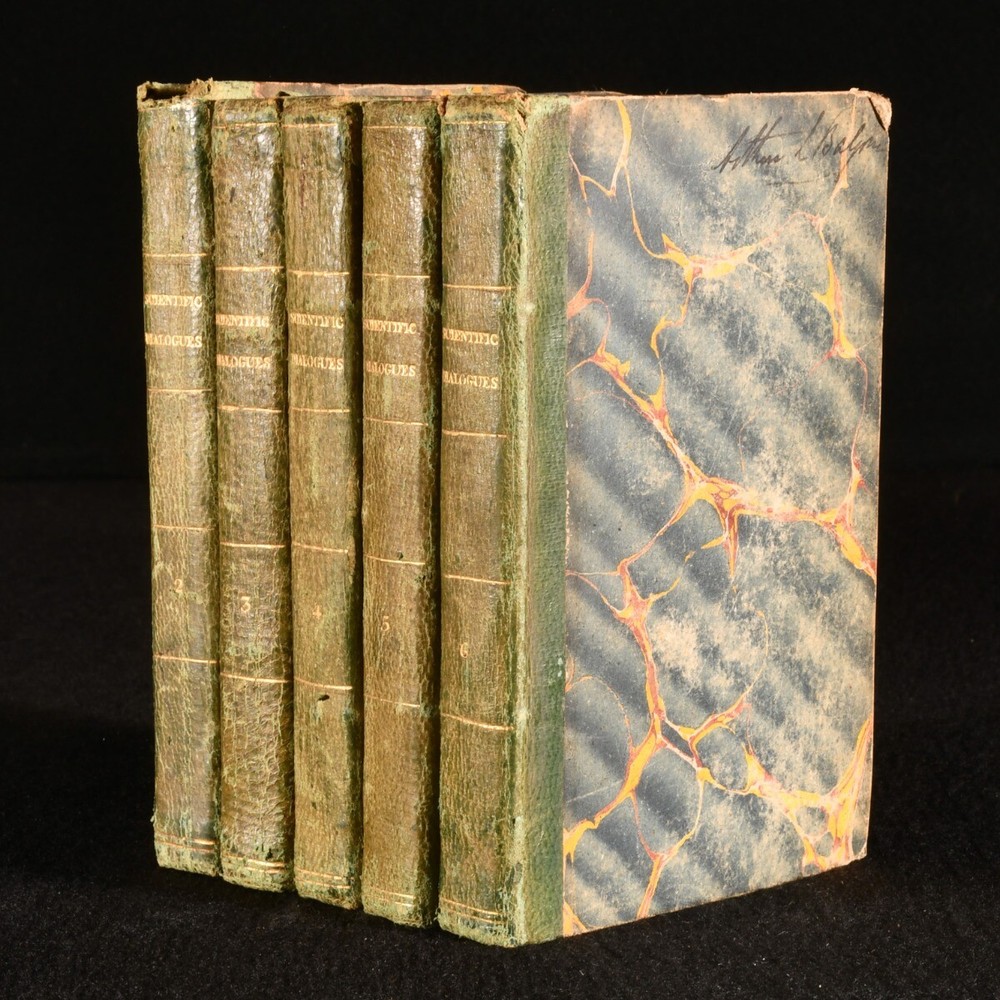 Click here to see our other books! Scientific Dialogues, Intended for the Instruction and Entertainment of Young People Jeremiah Joyce 1828 Baldwin and Cradock : London 6" by 4" 254; 236; 260; 259; 252pp SUMMARY A smart set of early nineteenth century educational scientific works, aimed at the 'Entertainment of Young People'. Leather Binding Overall Condition: Very Good This book weighs 1.5 KG when packed UK Postage: £ 3.99 US Postage: £ 23.99 EU Postage : £ 18.99 European Postage: £ 19.99 Asia Postage: £ 31.99 Worldwide Postage: £ 32.99 DESCRIPTION Five volumes only of the seven volume 1828 'New Edition' of the scientific dialogues of educator and Unitarian minister Jeremiah Joyce. Consisting of volumes II to VI: Vol. II, Astronomy; Vol. III, Hydrostatics; Vol. IV, Pneumatics; Vol. V, Optics and Magnetism, and Vol. VI, Electricity. A wonderfully informative introduction to various scientific subjects, published with the intention of igniting an interest in such subjects in the young. With numerous vignette illustrations. Former owner's illustrations to head of front boards. CONDITION In quarter morocco bindings with marbled paper covered boards. Fading to back strips, with minor losses to back strip heads. Rubbing to boards. Former owner's inscriptions to head of each front board. Internally, firmly bound. Pages generally clean and bright, with only the odd spot. Overall Condition: Very Good GLOSSARY OF TERMS Overall Condition (Dustwrapper condition rating is shown after that for the book itself, where a dustwrapper is present) Fine - Very well preserved copy showing very little wear Very Good Indeed - Only one or two minor faults, really a very attractive copy Very Good - Quite a wide term meaning no major faults but probably several smaller ones often expected given the age of the book, but still a respectable copy Good - Meaning not very good. Some more serious faults as will be described in the condition report under 'condition' Good Only - Meaning one or more faults that could really do with repair Fair - As with good only above but with other faults leaving a compromised copy even after repair Poor - Really bad and possibly seriously incomplete. We only sell books in this condition where their rarity or value makes them attractive none the less. Major defects will be described. GUARANTEE We offer a full money back guarantee on our descriptions. Please ask for details and conditions. We prefer PAYPAL. If you pay via PAYPAL we will post the item off the same or the next working day with the postage you have selected. Please note we cannot accept USD cheques