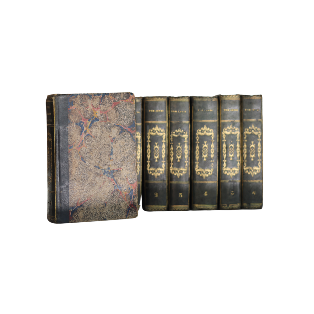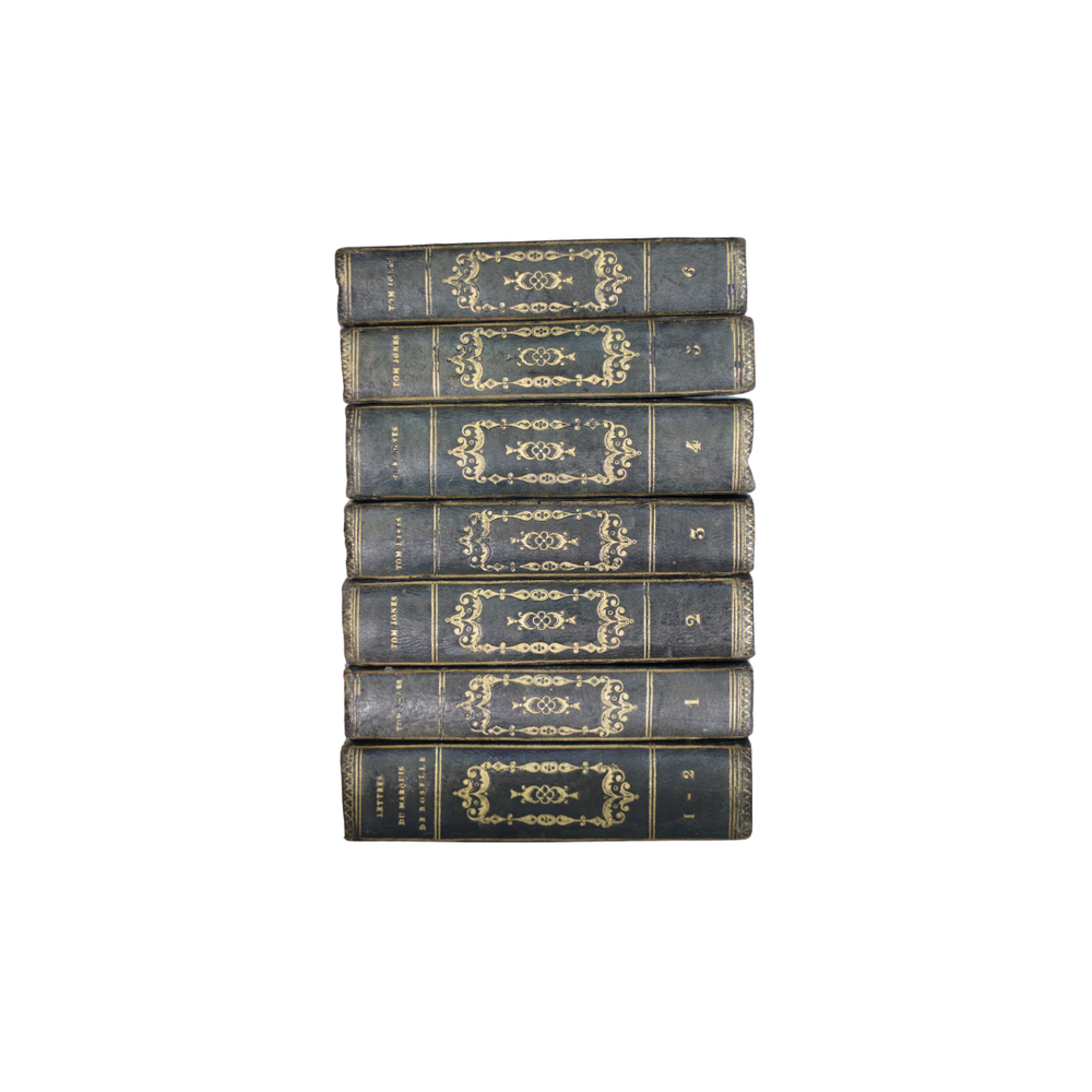 The 1828 French Marbled Leather Bound Antique Books (Set of 7) are a stunning collection that exemplifies the exquisite craftsmanship and literary heritage of early 19th-century France. Each volume is encased in luxurious marbled leather, adorned with intricate gilt detailing and elegantly embossed spines, showcasing the meticulous artistry of the era. The pages, often featuring marbled edges and fine paper, encapsulate the rich cultural and intellectual milieu of 1828 France. This remarkable set of seven books not only stands as a testament to the timeless beauty and sophistication of antique French bookbinding but also brings an air of historical grandeur and intellectual depth to any library or home decor.