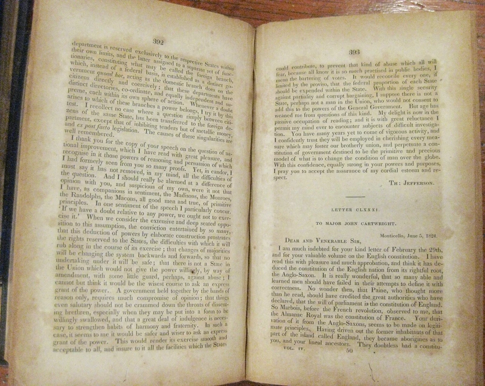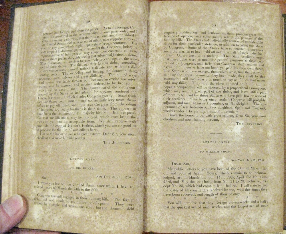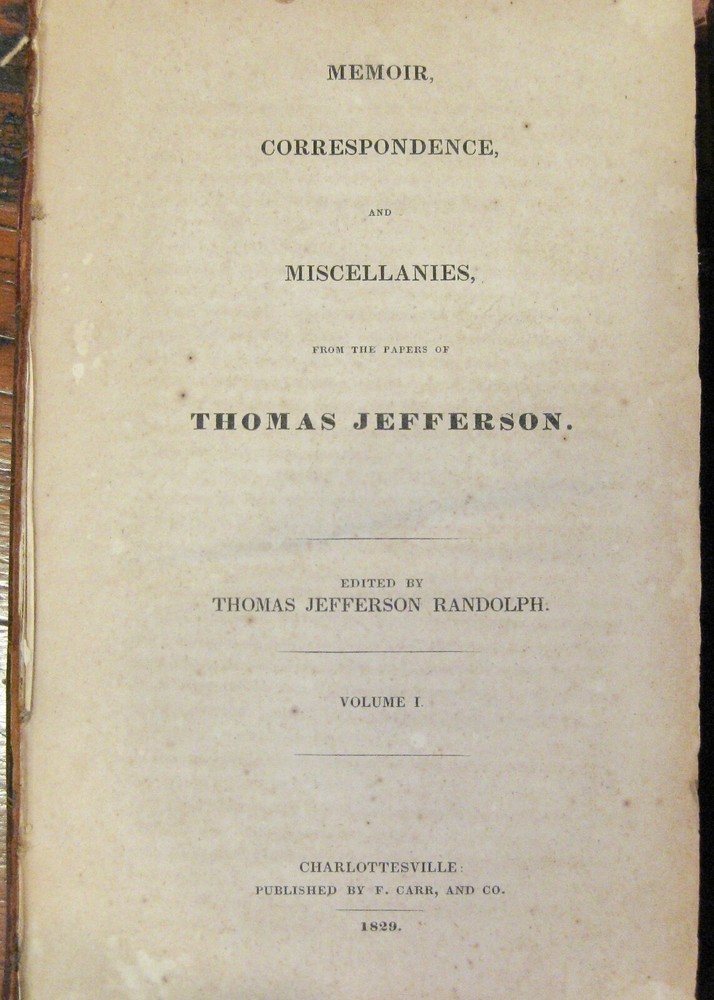 THIS MATCHED SET OF FIRST EDITIONS IS QUITE RARE. NO SIMILAR SET COULD BE LOCATED AT ANY ONLINE BOOKSELLER. RARE MATCHED SET OF FOUR VOLUMES OF "MEMOIR, CORRESPONDENCE, AND MISCELLANIES, FROM THE PAPERS OF THOMAS JEFFERSON." EDITED BY JEFFERSON'S GRANDSON, THOMAS JEFFERSON RANDOLPH. FOLDOUT OF JEFFERSON'S DRAFT OF THE DECLARATION OF INDEPENDENCE IS MISSING, AND THE TISSUE PROTECTOR OVER THE FRONTISPIECE OF VOLUME FOUR IS MISSING. THERE IS A "NOTICE" FROM THE PUBLISHER IN VOLUME ONE STATING THAT THE COPIES OF THE DECLARATION DID NOT ARRIVE IN TIME TO BE SHIPPED WITH THESE BOOKS. THIS MAY INDICATE THAT THIS SET WAS ONE OF THE FIRST TO BE PRINTED. EACH BOOK IS ENDORSED ON THE FRONT PASTE-DOWN BY THE ORIGINAL OWNER (EXCEPT THAT THE MISSING FRONT COVER OF VOLUME ONE PRECLUDES SUCH), N. G. NYE, A LAWYER WHO PRACTICED IN YAZOO CITY, MISSISSIPPI. NYE OWNED THE FAMOUS BLEAK HOUSE OUTSIDE YAZOO CITY. LEATHER COVERS ARE MARBLED AND IN REASONABLY GOOD CONDITION, ESPECIALLY CONSIDERING THEIR AGE, SHOWING ONLY A MINOR AMOUNT OF SCUFFING AND SOILING. COVER CORNERS AND EDGES SHOW WEAR. LABELS ON THE SPINE ARE ALSO IN REASONABLY GOOD CONDITION CONSIDERING THEIR AGE, SHOWING VERY LITTLE FADING. SEE PHOTO. SOME MIGHT REBIND THIS SET, HOWEVER, BECAUSE THE COVERS ARE IN SUCH GOOD CONDITION, ONE MIGHT DO WELL TO LOCATE ANOTHER COVER THAT MATCHES THESE AS CLOSELY AS POSSIBLE AND USE IT TO REPLACE THE FRONT COVER OF VOLUME ONE. SHIPPING METHOD WILL BE DETERMINED BY BUYER AND WILL BE BILLED AT COST.