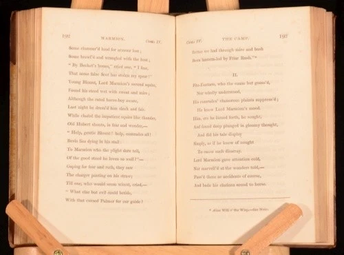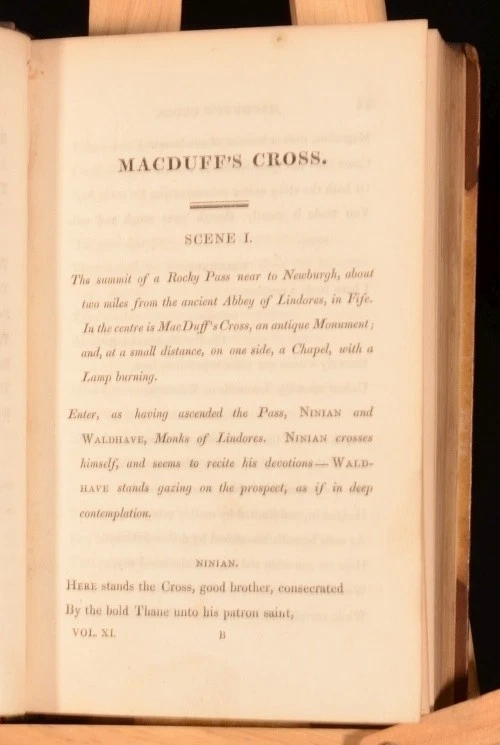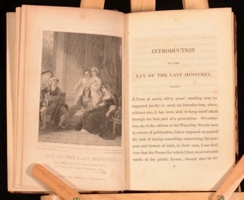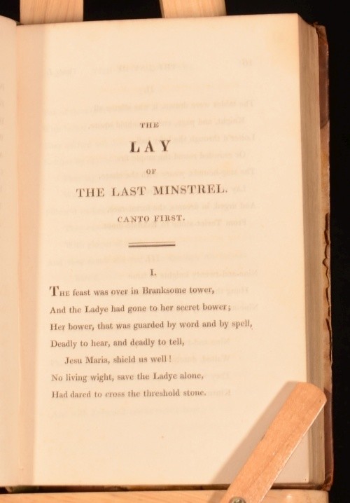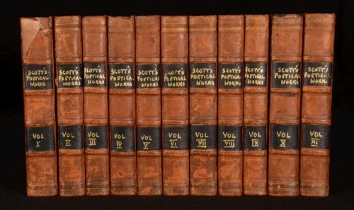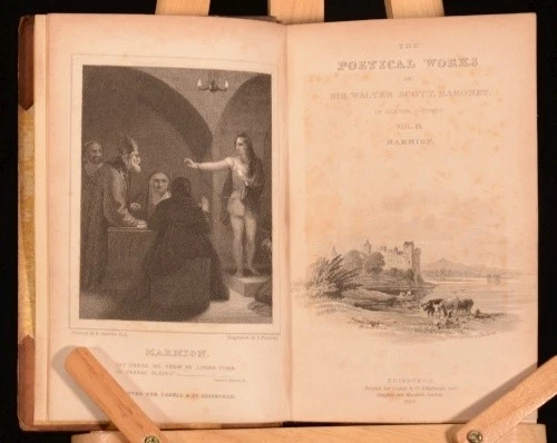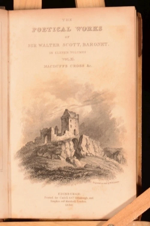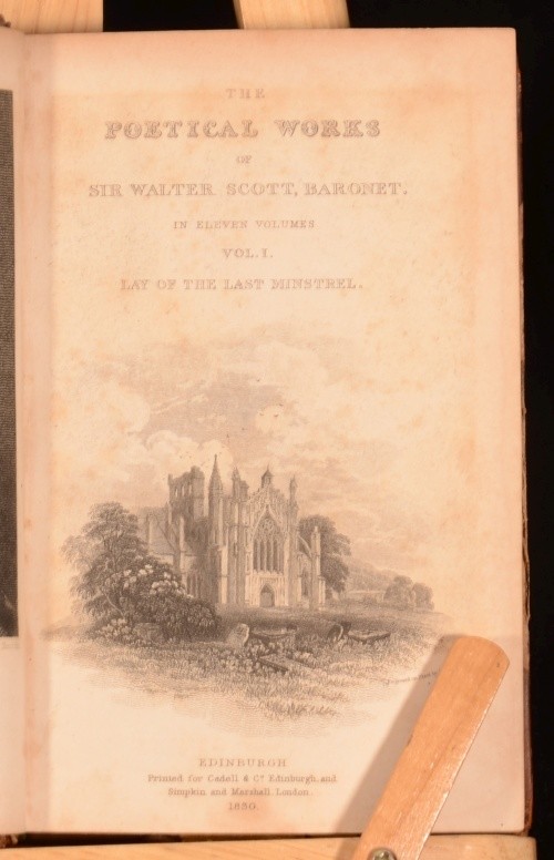 Click here to see our other books! The Poetical Works of Sir Walter Scott, Baronet Sir Walter Scott 1830 Cadell and Co : Edinburgh 5.5" by 3.5", xxx, 341; xi, 308; 296; xiii, 303; 294; iv, 332; xv, 330; vi, 299; vi, 278; v, 402; 366pp SUMMARY The Poetical Works of Sir Walter Scott, Baronet with engraved frontispiece and illustrated title to each volume. Illustrated,Leather Binding Overall Condition: Good Only This book weighs 3 KG when packed UK Postage: £ 3.99 US Postage: £ 36.99 EU Postage : £ 25.99 European Postage: £ 27.99 Asia Postage: £ 47.99 Worldwide Postage: £ 69.99 DESCRIPTION In eleven volumes complete. With an introduction to each work and notes to the end of each work. Poetical works included are: The Lay of the Last Minstrel; Marmion; Ballads and Lyrical Pieces; The Lady of the Lake; Rokeby; The Bridal of Triermain; Harold the Dauntless; The Vision of Don Roderick; The Field of Waterloo; The Lord of the Isles and other Miscellaneous Poems; Songs and Miscellanies. Plays included are: Halidon Hill; Macduff's Cross; The Doom of Devorgoil and Auchidrance; or, the Ayrshire Tragedy. Sir Walter Scott, 1st Baronet (1771 - 1832) was a Scottish historical novelist, playwright, and poet, popular throughout much of the world during his time. Scott was the first English-language author to have a truly international career in his lifetime, with many contemporary readers in Europe, Australia, and North America. His novels and poetry are still read, and many of his works remain classics of both English-language literature and of Scottish literature. Famous titles include Ivanhoe, Rob Roy, The Lady of the Lake, Waverley, The Heart of Midlothian and The Bride of Lammermoor. CONDITION In half calf bindings with marbled paper covered boards. Externally, sound but with slight wear to extremities, rubbing and marks to boards, with loss to backstrip to volume one and handwritten spine labels. Five joints starting, six starting very slightly, some hinges strained also. Internally, firmly bound. Bright but with slight foxing to frontispiece and titles, the odd spot and handling mark and with offsetting from binding to endpapers. Overall Condition: Good Only GLOSSARY OF TERMS Overall Condition (Dustwrapper condition rating is shown after that for the book itself, where a dustwrapper is present) Fine - Very well preserved copy showing very little wear Very Good Indeed - Only one or two minor faults, really a very attractive copy Very Good - Quite a wide term meaning no major faults but probably several smaller ones often expected given the age of the book, but still a respectable copy Good - Meaning not very good. Some more serious faults as will be described in the condition report under 'condition' Good Only - Meaning one or more faults that could really do with repair Fair - As with good only above but with other faults leaving a compromised copy even after repair Poor - Really bad and possibly seriously incomplete. We only sell books in this condition where their rarity or value makes them attractive none the less. Major defects will be described. GUARANTEE We offer a full money back guarantee on our descriptions. Please ask for details and conditions. We prefer PAYPAL. If you pay via PAYPAL we will post the item off the same or the next working day with the postage you have selected. Please note we cannot accept USD cheques