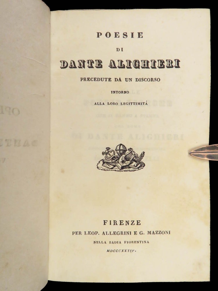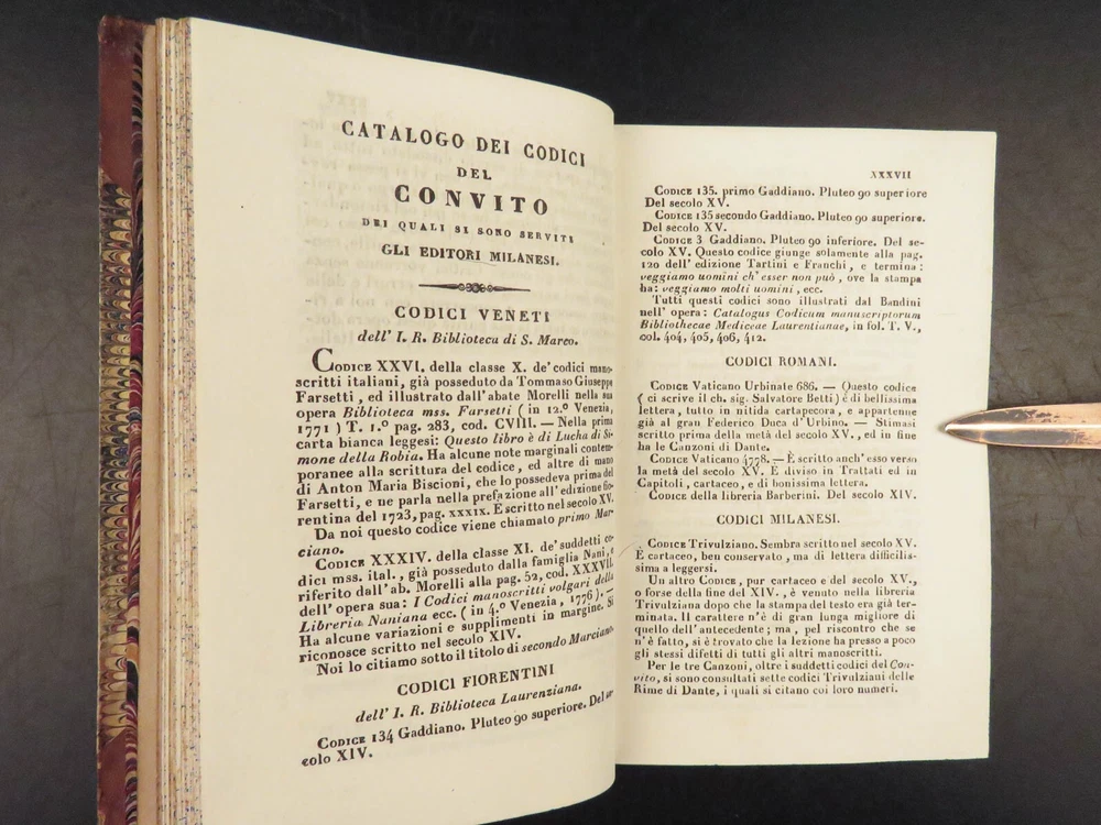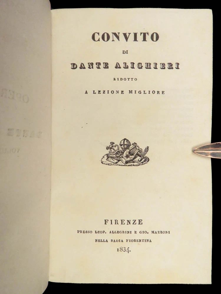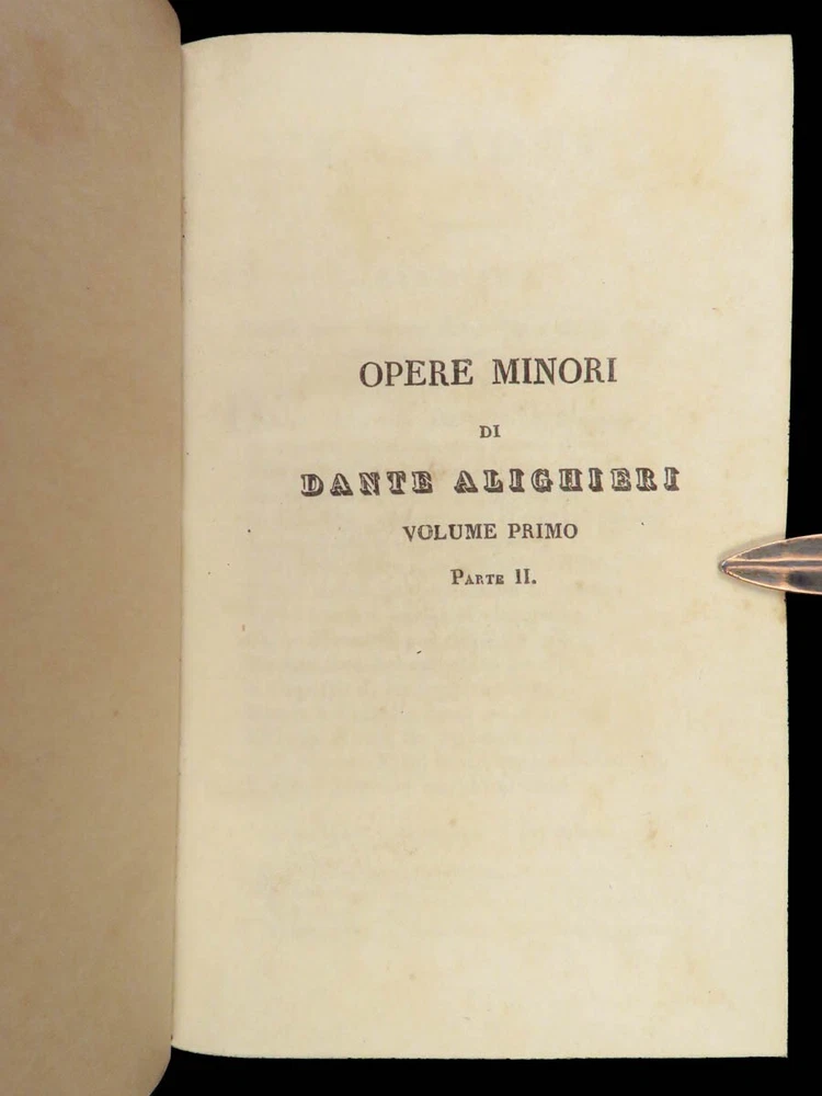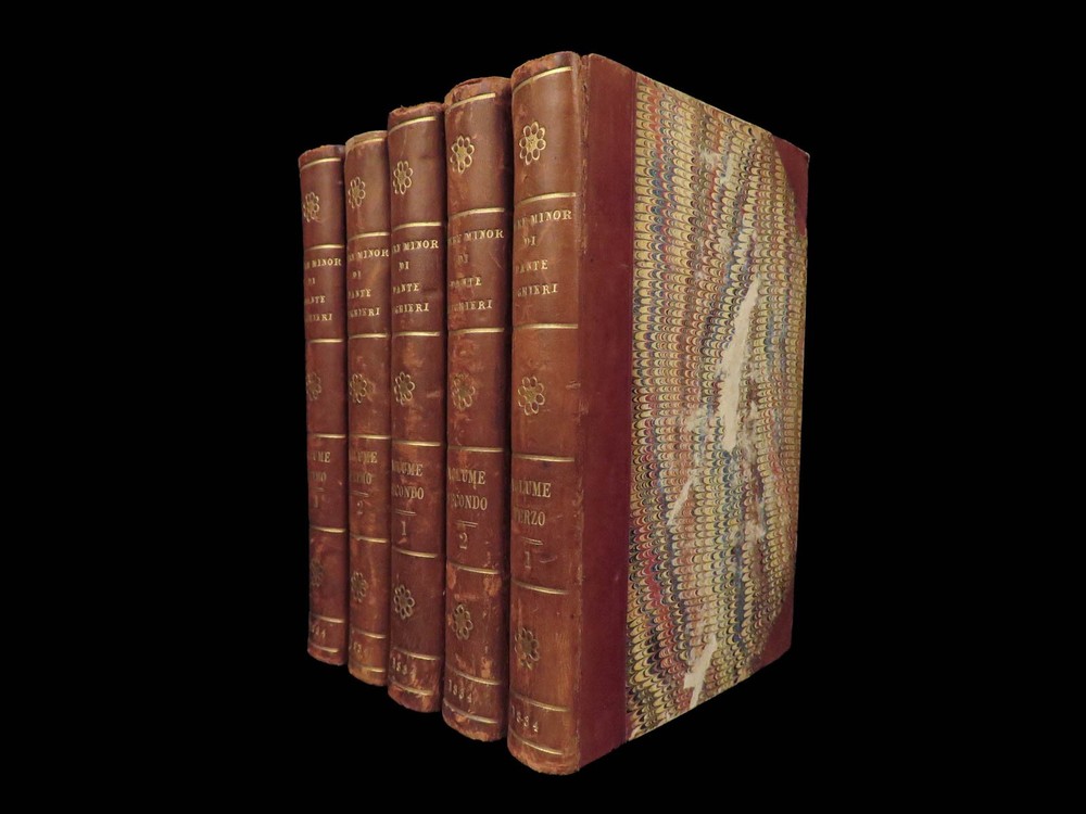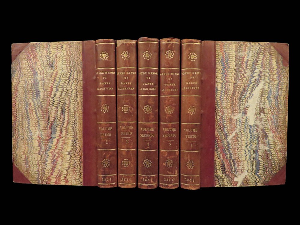 1834 DANTE Convivio The Banquet Monarchia Medieval Poetry Italian 5v Set RARE “Abandon all hope, ye who enter here.” ― Dante Alighieri, The Divine Comedy While best-known for the famous ‘ Divine Comedy’ , Dante Alighieri also wrote two lesser-known works such as ‘ Convivio’. ‘ Convivio’ , or ‘ The Banquet’ is a collection of Dante’s own knowledge, a sort of encyclopedia of philosophy, religion, science, history, and astronomy. This collection of Dante’s minor works includes Convivio and ‘ Monarchia’ – a treatise on political philosophy. This five-volume Italian edition of Dante’s works was published in Florence. A fine five-volume set! Item number: #24839 Price: $950 ALIGHIERI, Dante Opere minori In Firenze [Florence]: Leop. Allegerini e G. Mazzoni, 1834-39. 1 st edition Details : · Collation: Complete with all pages; 3 volumes in 5 tomes o Vol. I § Part 1 – cccliv, [2] § Part 2 – [2], 356 o Vol. II § Part 1 – xxxvii, [1], 324 § Part 2 – [2], 325-696 o Vol. III – xii, 358, [2] · Provenance: Armorial bookplate - Edward Francis Witts o Likely Edward Francis Witts (1813-1886), rector of Upper Slaughter in Gloucestershire. He was also the father of George Backhouse Witts (1846–1912), a British civil engineer and archaeologist who specialised in the prehistoric barrows of Gloucestershire. Motto: ANTE OBITUM NEMO FELIX · Language: Italian / Latin · Binding: Leather; tight and secure · Size : ~6in X 3.75in (15cm x 9.5cm) · Very rare and desirable collection! Our Guarantee: Very Fast. Very Safe. Free Shipping Worldwide. Customer satisfaction is our priority! Notify us with 7 days of receiving, and we will offer a full refund without reservation! 24839