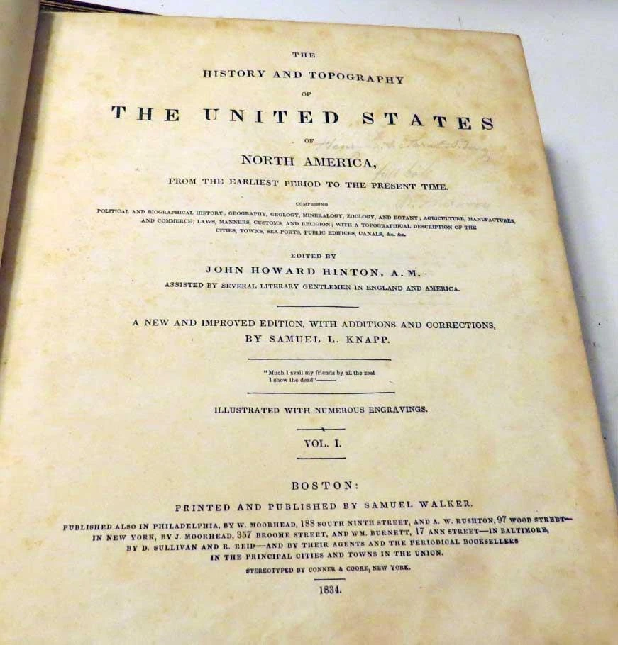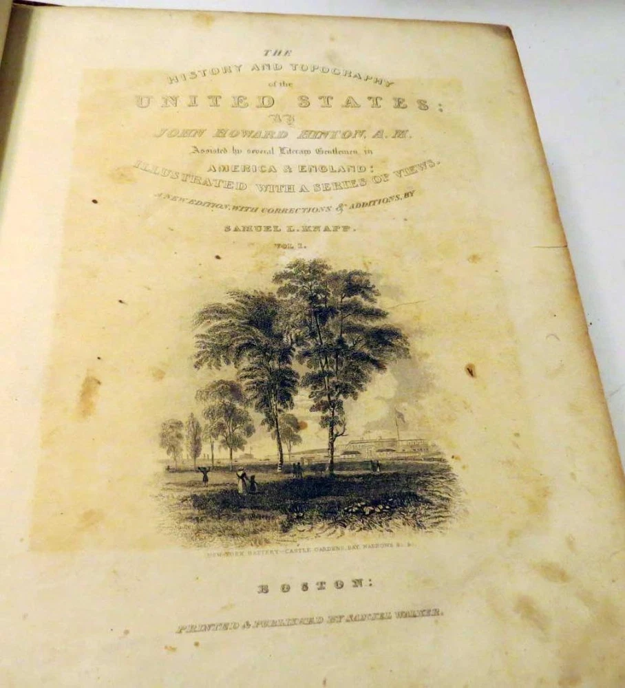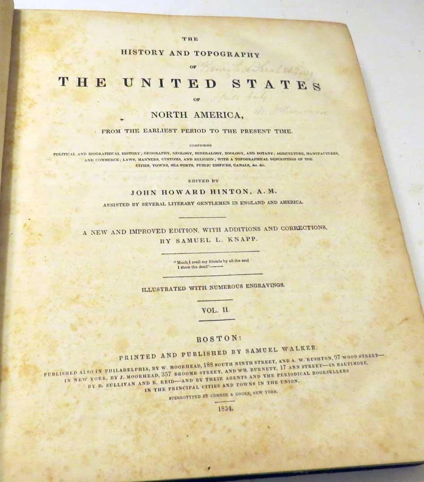 1834 HINTON'S THE HISTORY AND TOPOGRAPHY OF THE UNITED STATES - ILLUSTRATED SET 1834 HINTON'S THE HISTORY AND TOPOGRAPHY OF THE UNITED STATES - ILLUSTRATED SET Description Topdog Presents: Always Interesting Toys and Models! Title: HINTON'S THE HISTORY AND TOPOGRAPHY OF THE UNITED STATES - ILLUSTRATED SET Publication Year: 1834 Publisher: S. Walker, Boston Description: Acquire a piece of American history with this rare and illustrious set, "The History and Topography of the United States of North America," meticulously compiled by John Howard Hinton and Samuel L. Knapp. This set provides a captivating glimpse into the early history and geographical features of the United States, offering valuable insights into the nation's development from its colonial roots to the early 19th century. Key Features: Rare First Edition: This first edition set is a prized gem for collectors and enthusiasts, offering a glimpse into the historical narrative and topographical landscapes of the United States during the early 19th century. Illustrated Edition: Delve into the visual richness of the United States with illustrations that bring to life the diverse landscapes, cultural heritage, and historical landmarks depicted in the text. Provenance: Acquired from the original owner's family, this set bears a unique page with the names of its owners inscribed in ink, providing a personal connection to its historical journey. Condition: While the set is in good condition overall, it is not without some problems typical of its age. The second volume is in better condition than the first, which exhibits signs of wear such as a loose front board, missing endpapers on the end, and some yellowing of pages. Despite these , both volumes are complete with no missing pages. Comprehensive Content: Explore the comprehensive coverage of the United States' history and geography, from its earliest colonial beginnings to the present day, including insights into exploration, development, and significant events that shaped the nation. Don't miss this rare opportunity to own a piece of American history and embark on a journey through the vibrant tapestry of the United States' past and present. . . Please see the photos they are part of description. Flat rate shipping in the US $18 Click images to enlarge Payment Payments We add $1 handling fees for every additional item in combined shipping. A total cost of a combined shipping will be calculated based on a combined parcel weight and current USPS shipping rates. Payments are due within 7 days of auctions close, no exceptions We accept PayPal . Shipping Shipping in the US WHEN: We try to ship in 2 days (excluding weekends and holidays). COURIER: USPS International Shipping WHEN: We try to ship the next day (excluding weekends and holidays) COURIER: USPS WHERE: We will ship Worldwide CUSTOMS FEES if any are buyers responsibility. Customs form will show total you paid by PayPal and price for your purchases. We always mark parcels as "used toys". Please do not ask us to low declared value, it defeats the whole idea of shipping fully insured parcel . If you are paying by PayPal parcels with a total value under $750 will be shipped by Registered Mail or First Class International (delivery time up to 4 weeks) or if they weight over 4 pounds will be shipped FULLY INSURED by Priority Mail (delivery time 6-14 days non guaranteed) over $750 will be shipped FULLY INSURED by Express Mail with a signature confirmation (delivery time 4-7 days) The International bidders might want to contact us about shipping cost prior to placing their bids. We will ship to the address listed in your eBay profile under "Shipping Details". It's buyers responsibility to provide a correct shipping address. All returned parcels because of " a wrong shipping address" parcels will be re-sent at the buyer's expense. Please do not ask us to ship to the address not listed in your eBay profile, we will not do it unless we know you from previous transactions. Postal Insurance All domestic parcels with a total over $50 (for Priority mail) and $25 (for First class and Parcel Select) will be insured: $1 per up to $100 of the total (for example if total is $256 , postal insurance will be $3) All International parcels will be insured (no exceptions): $2 per $100 of the total for example if total is $256 , postal insurance will be $6) Lost & Damaged Claims For lost parcels, you must wait for 21 days domestic (US) and 45 days for International shipments. For shipments to Italy , you must wait 60 days before filing. Damage claims can be filed immediately. All claims should be submitted within 90 days from the date of shipment. All International parcels will be insured with U-PIC, please do not file a "not received "claim with PayPal, just contact us to resolve your problem. Terms of Sale Refunds & Returns 100% Satisfaction Guarantee that the item is original and meets the detailed description! Returns to be made within 30 Days of Receipt (including the cases when parcel was hold at PO by buyer's request), after that a sale considered to be final. Buyer pays return shipping cost. If item was damaged in transit you should not return it. You should submit an insurance claim to get a compensation. Please do not send us back broken items. If you need an assistance with your claim please contact us. All returned items should have a tracking number and be fully insured. We reserve right to replace defective item or refund money (less S&H) Pickups We do not do any pickups. As Is If auction marked "AS IS", it means that Liquest Group Inc. shall not be responsible for the correct description, authenticity, genuineness of, or defect in any lots, and makes no warranty in connection therewith. As no warranty is given with any lot, therefore no sale is invalid or avoidable by reason of any fault in any lot or by reason of any lot being incorrectly described (in the ad), and no compensation may be paid for any such fault or error in description or 