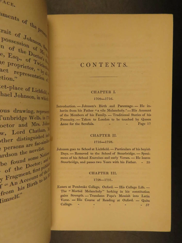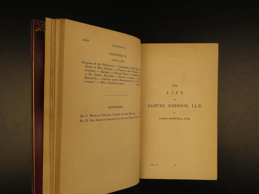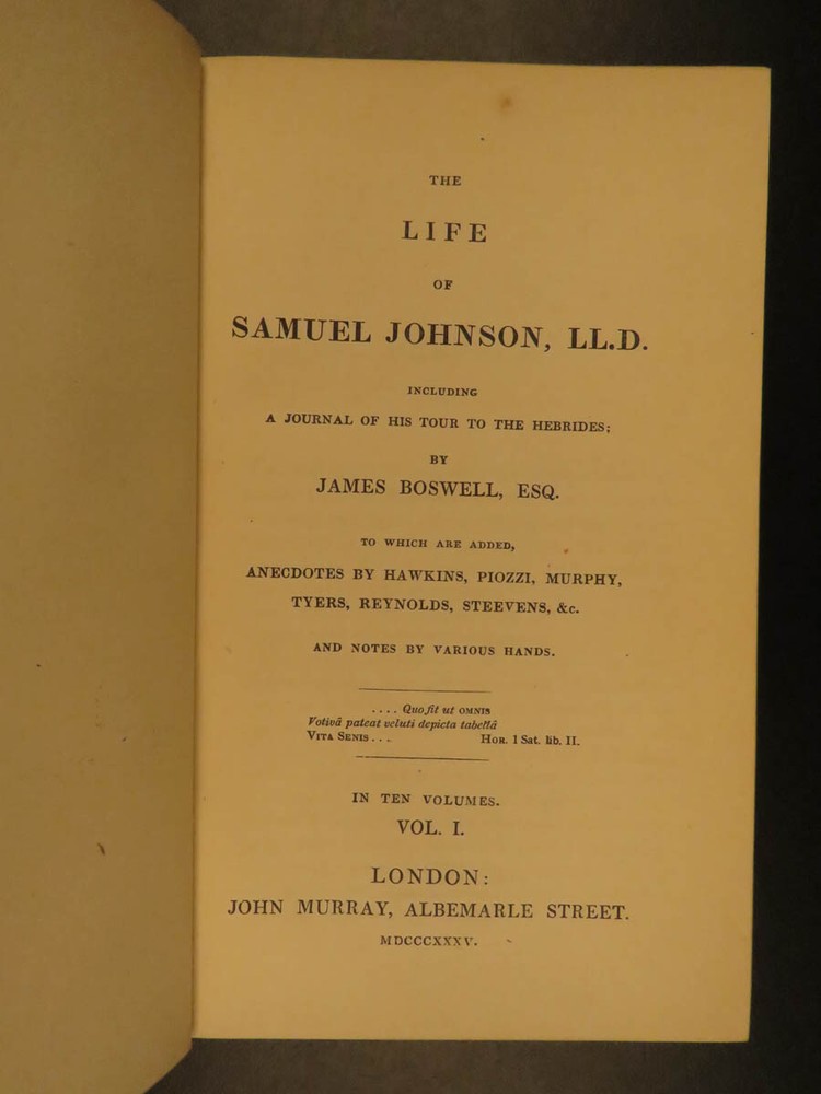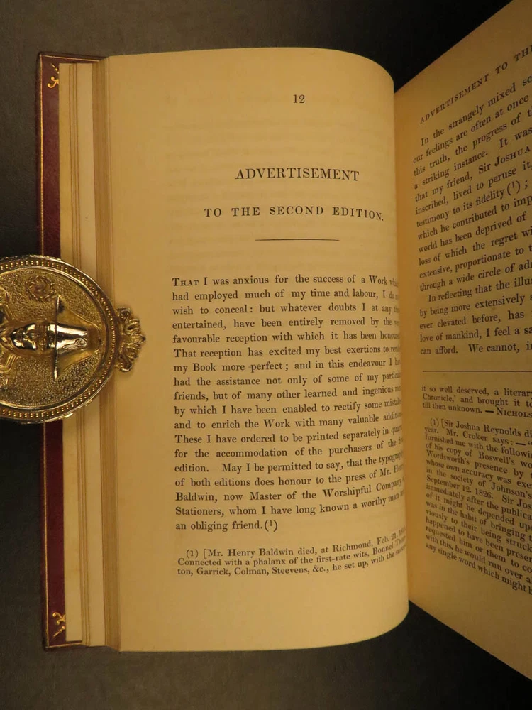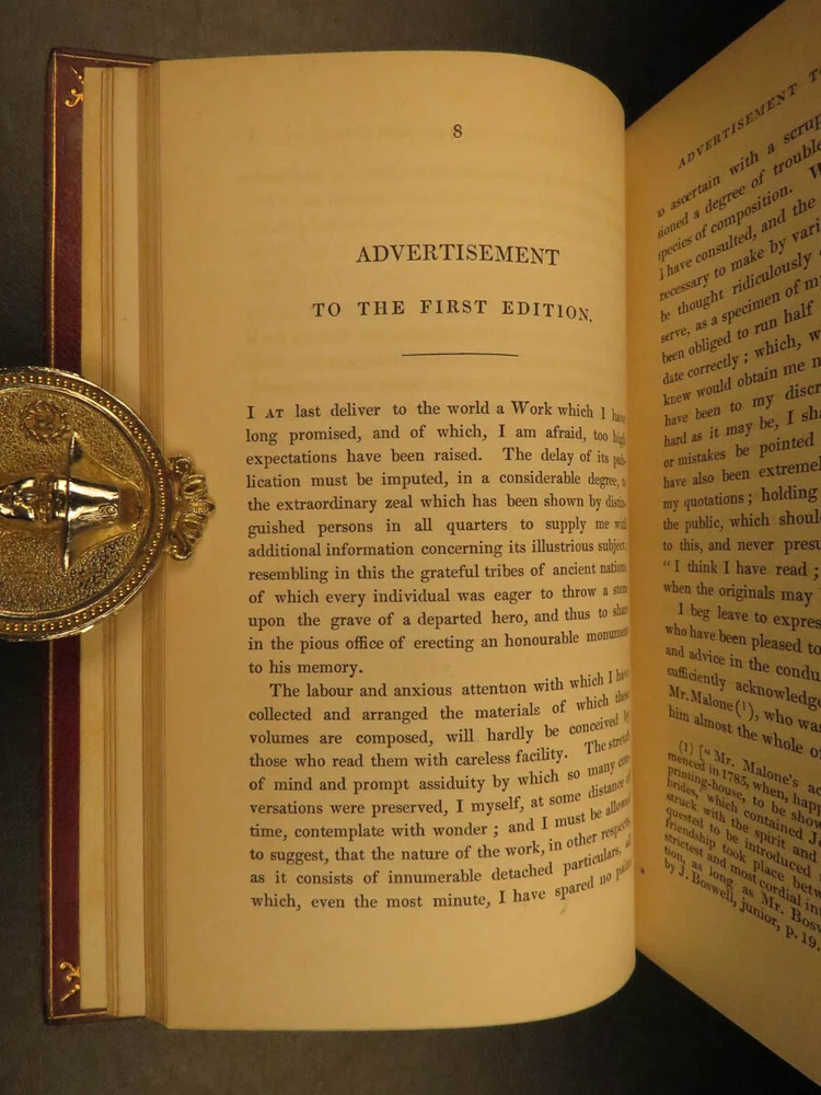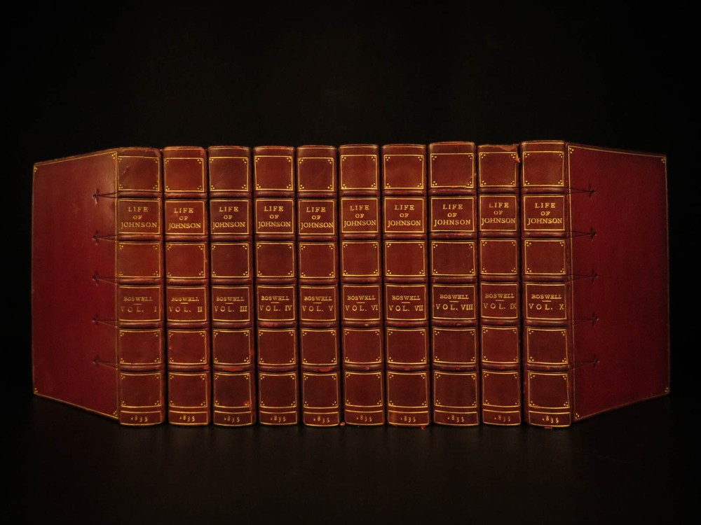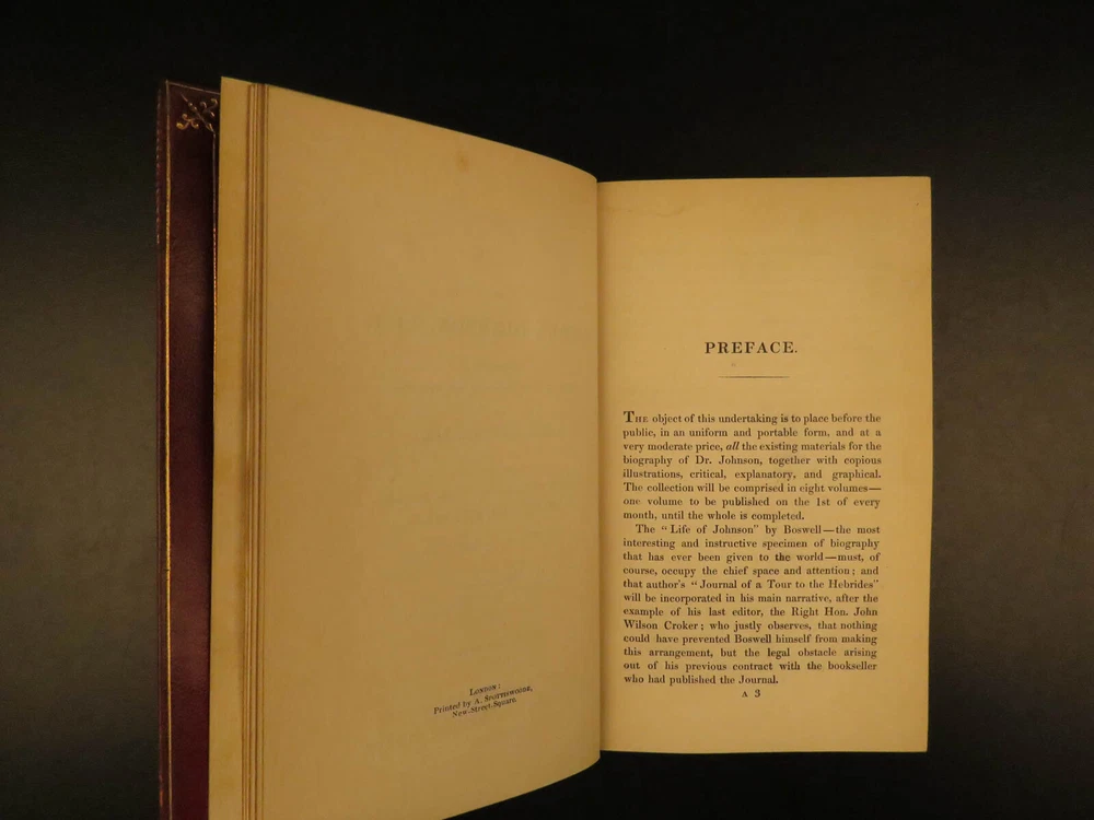 1835 Life of Samuel Johnson by James Boswell FAMOUS English Biography 10v SET “I hate mankind, for I think myself one of the best of them, and I know how bad I am.” ― Samuel Johnson Samuel Johnson was a famous English writer and scholar most known for his ‘ Dictionary of the English Language ’ as well as a collection of biographical accounts of eminent English poets. In the mid-1700s, Johnson met James Boswell, a Scottish biographer who wrote an extensive biography of Johnson, which, according to a number of experts, is the greatest biography in the English language ! In addition to the complete eight-volumes of ‘ Life of Samuel Johnson ’ this set includes both volumes of ‘ Johnsoniana’ , a work of anecdotes collected by Johnson himself. According to Pottle, “This version contains both the original texts, augmented by the additional writings of the biographer and his subject, and the very valuable new and related material which Croker introduced.” Item number: #13734 Price: $950 BOSWELL, James The life of Samuel Johnson, LL. D: including a journal of his tour to the Hebrides, to which are added, anecdotes by Hawkins, Piozzi, Murphy, Tyers, Reynolds, Stevens, &c., and notes by various hands London: John Murray, 1835. Details : · Collation: Complete with all pages; 10 volumes o Vols I-VIII: Life of Johnson o Vols IX-X: Johnsoniana o 28 engraved plates · References: Pottle 92 · Language: English · Binding: Leather; tight & secure · Size : ~6.5in X 4in (16.5cm x 10cm) Our Guarantee: Very Fast. Very Safe. Free Shipping Worldwide. Customer satisfaction is our priority! Notify us with 7 days of receiving, and we will offer a full refund without reservation! 13734