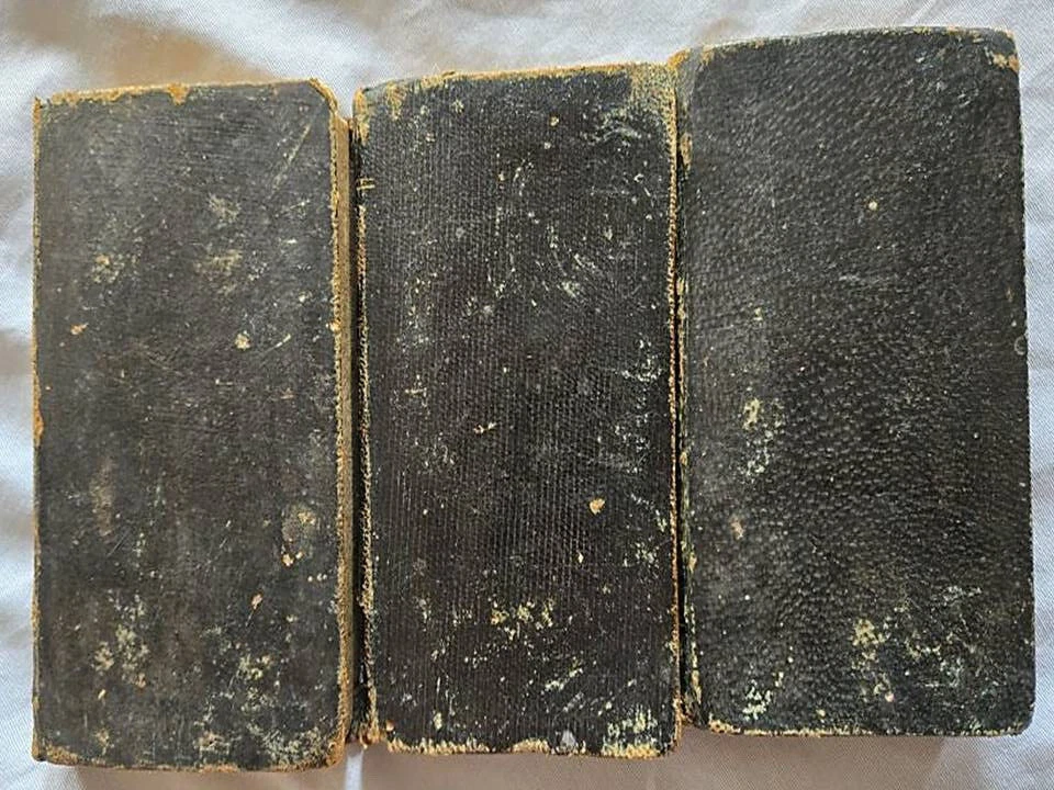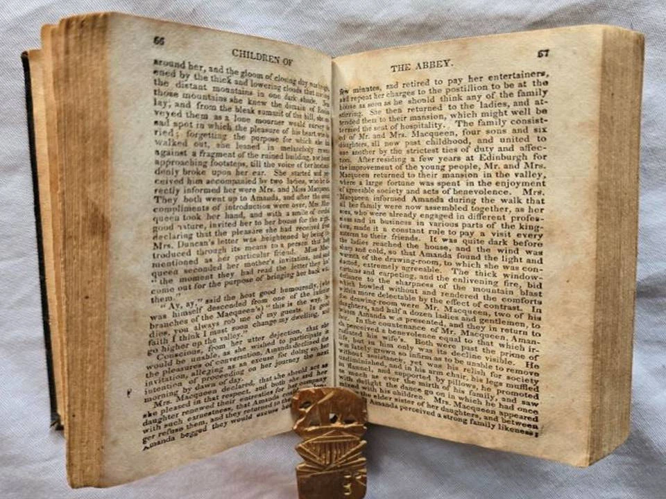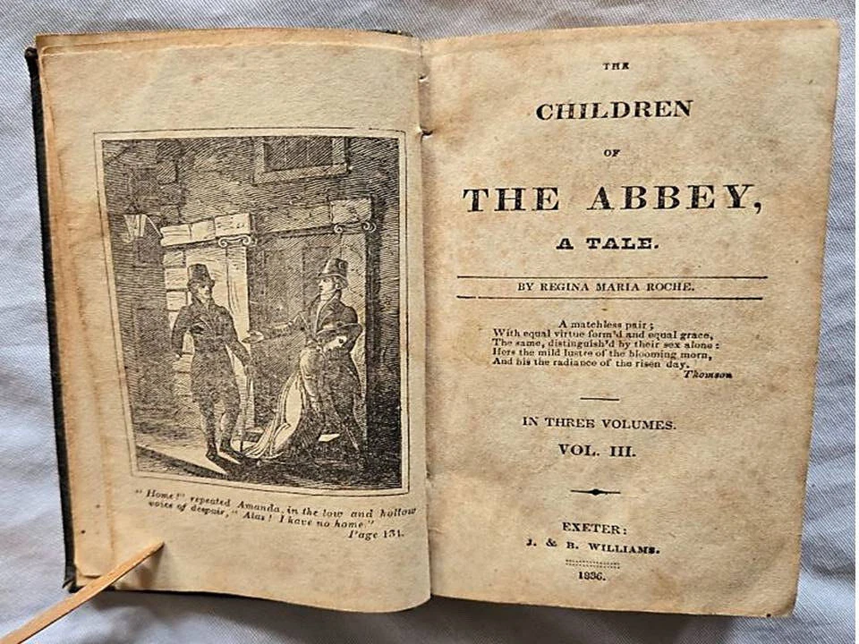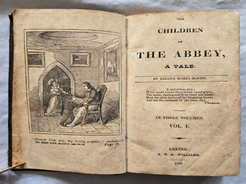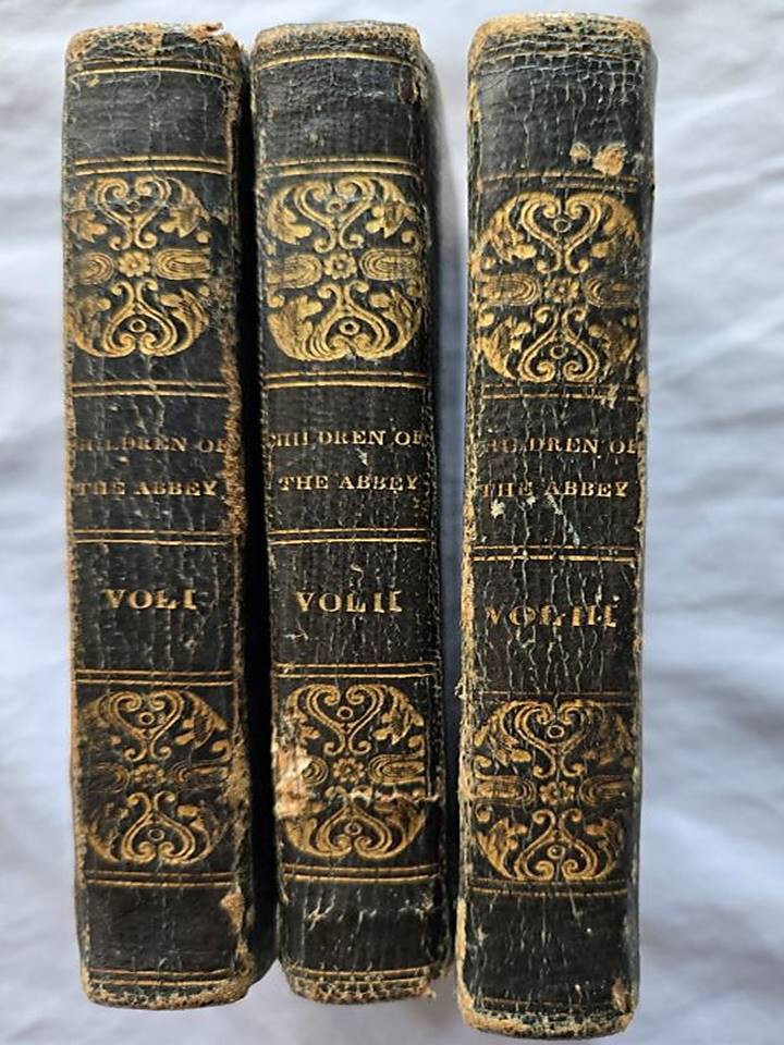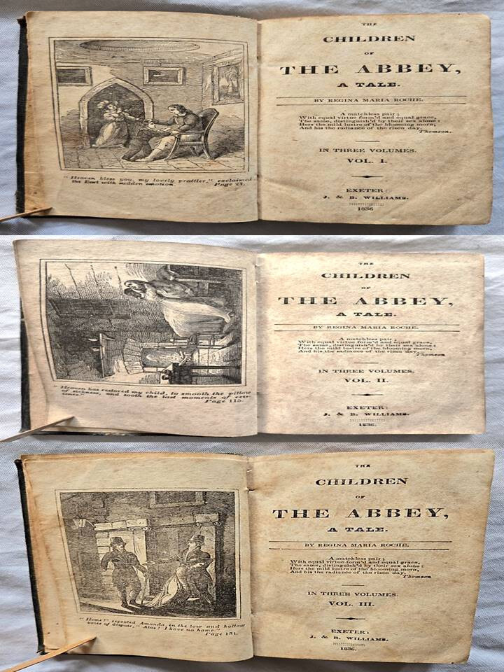 1836 Three volume miniature set of 'Children of the Abbey by Regina Maria Roche. J.B. Williams publisher, Exeter, U.K. This gothic novel was well known in the 18th century, she was an Irish gothic novelist 1764-1845 from Waterford, Ireland. The book contains many standard gothic elements (old mansions, a haunted abbey. This leather bound miniature set measure 3"x5, good condition. Has some wear some wear, no tears on any pages, some writing in pencil & ink on first blank pages. Binding is strong. Please view my other listings on eBay. Trident books Antique/Vintage, Used Books in all Subjects