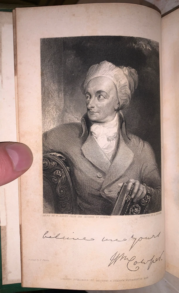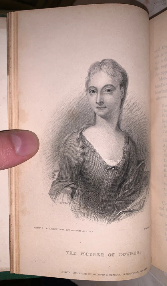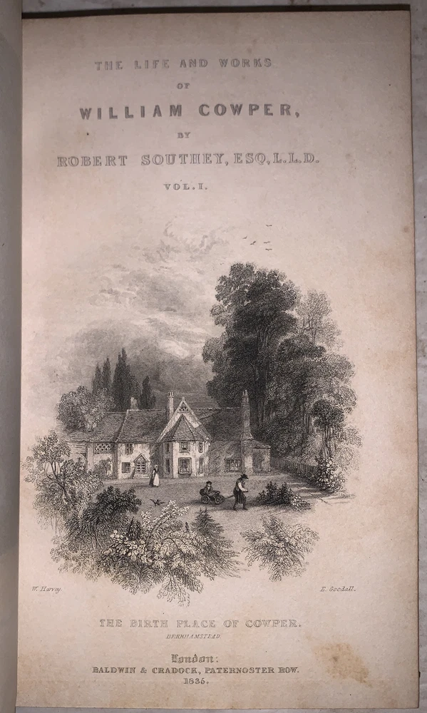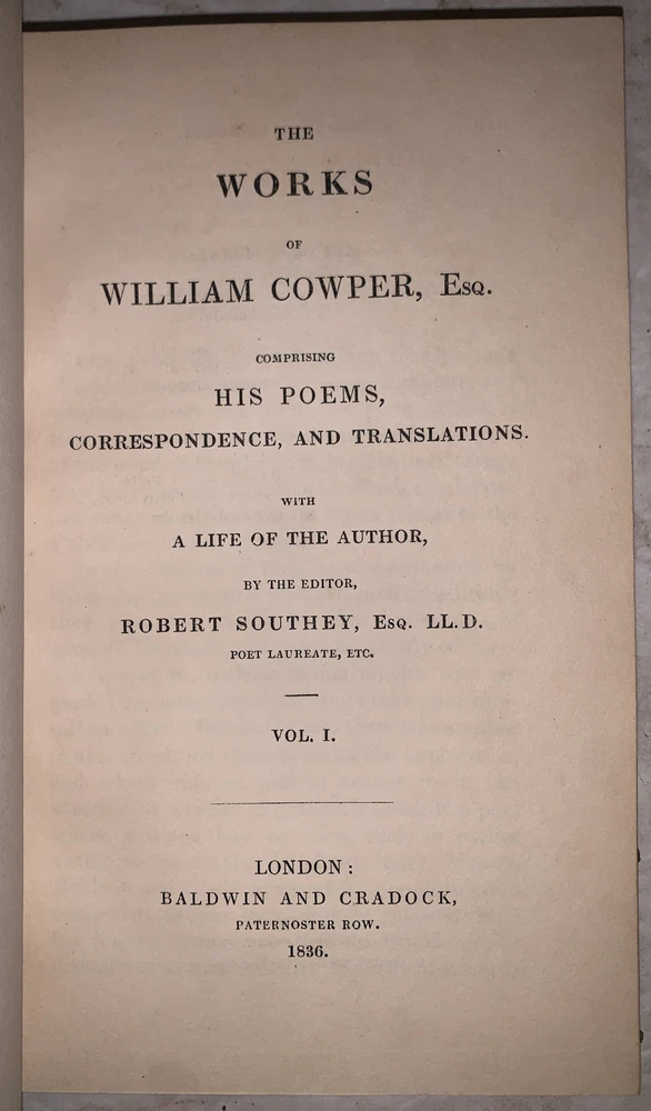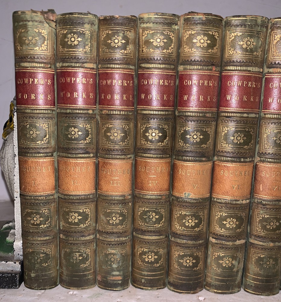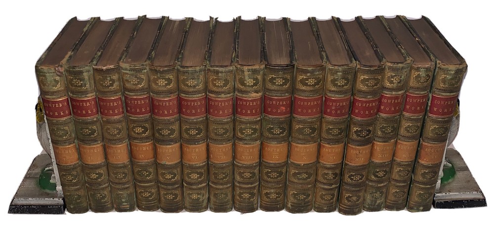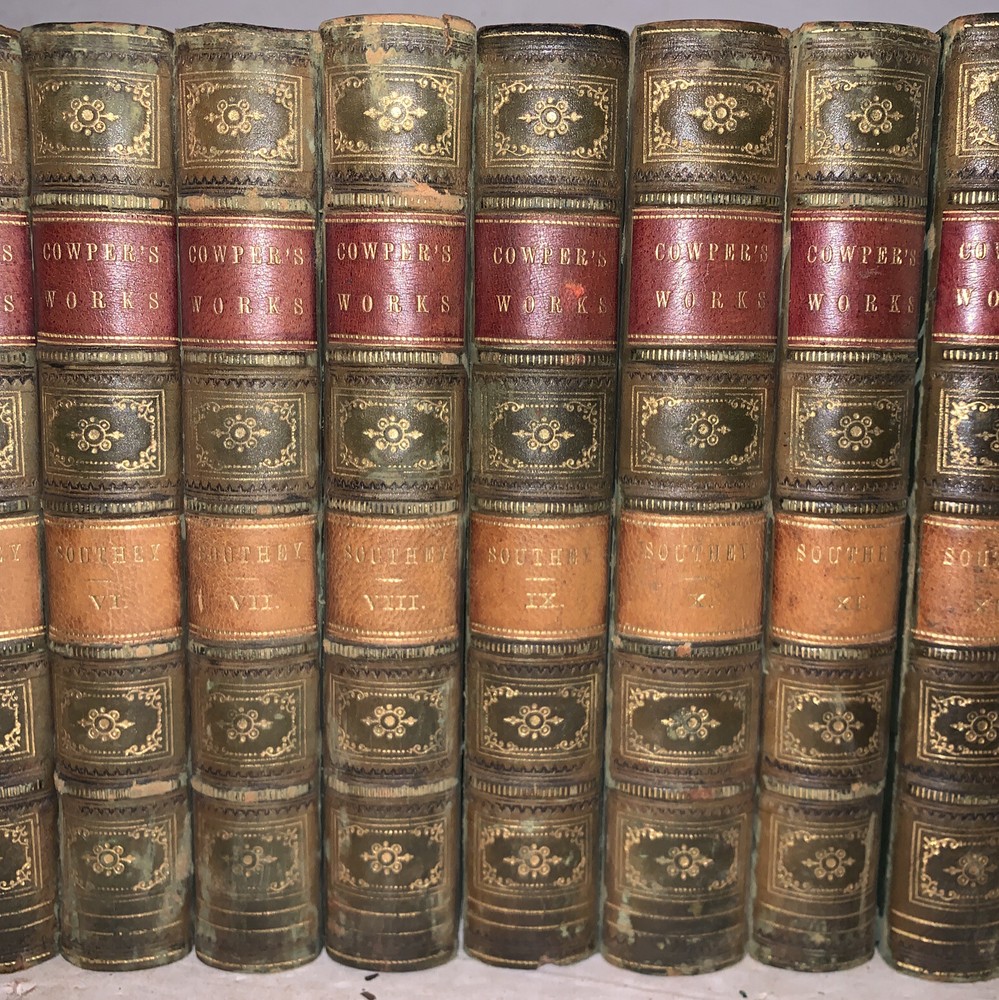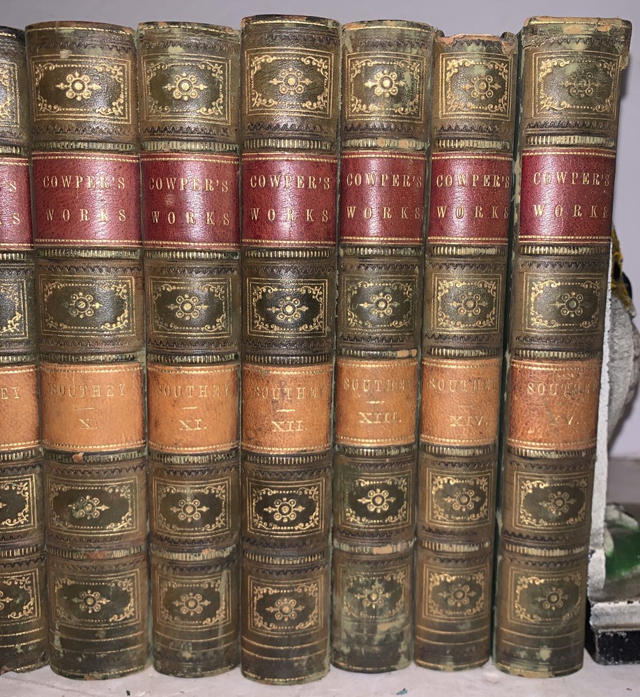 The Works of William Cowper, Esq. Comprising His Poems, Correspondence, and Translations With A Life of the Author, by the Editor, Robert Southey, Esq. LL.D. In Fifteen Volumes London: Baldwin and Cradock 1836-7 Fifteen 12mos, bound in period quarter green leather over marbled boards. Spines with raised bands, gilt lettering and decoration. Illustrated with black and white plates. Some slight rubbing and wear, scuffs, minor discoloration, else in very good condition. If you have any questions feel free to ask and don't forget to check out my other listings.