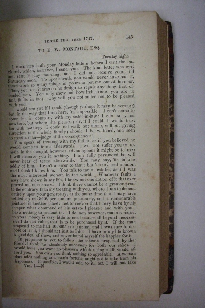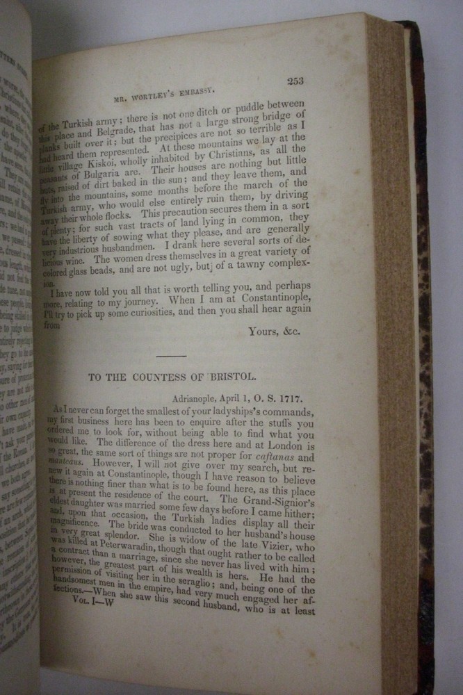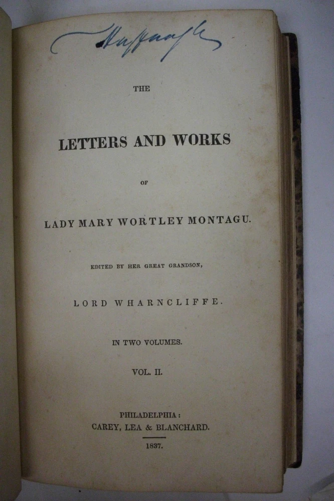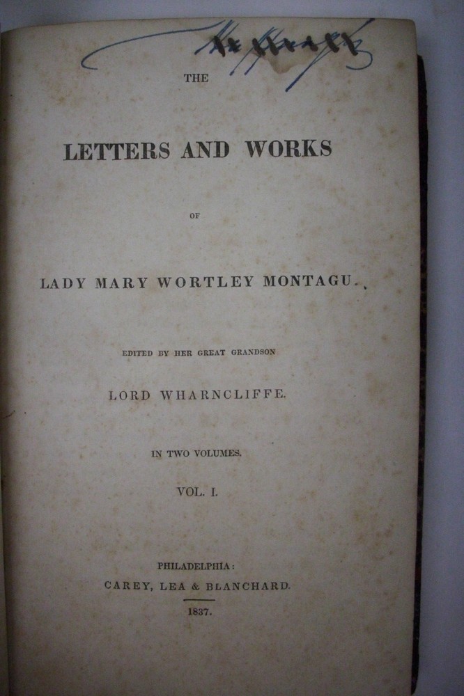 You are bidding on a rare set of antique hardcover books titled The Letters and Works of Lady Mary Wortley Montagu. Edited by Her Great Grandson Lord Wharncliffe. The set is complete in two volumes and you are bidding on both volumes. This is the very scarce two volume set. Published by Carey, Lea & Blanchard, 1837. From wikipedia: Lady Mary Wortley Montagu (15 May 1689 – 21 August 1762) was an English aristocrat and writer. Lady Mary is today chiefly remembered for her letters, particularly her letters from Turkey, as wife to the British ambassador, which have been described by Billie Melman as “the very first example of a secular work by a woman about the Muslim Orient”. Lady Mary Pierrepont was born in London on 15 May 1689; her baptism took place on 26 May at St. Paul's Church in Covent Garden. She was a daughter of Evelyn Pierrepont, 5th Earl of Kingston-upon-Hull, and his first wife, Lady Mary Fielding. As a pioneer of modern medicine, she was the first European who insisted on inoculation of her children of small doses of smallpox long before programmes of preventative medicine began, based on her own observational evidence of Turkish milkmaids similarly inoculated who recovered from the disease. Her mother had three more children before dying in 1692. The children were raised by their Pierrepont grandmother until Mary was 9. Lady Mary was then passed to the care of her father upon her grandmother's death. She began her education in her father's home. Family holdings were extensive, including Thoresby Hall and Holme Pierrepont Hall in Nottinghamshire, and a house in West Dean in Wiltshire. She used the library in her father’s mansion, Thoresby Hall in the Dukeries of Nottinghamshire, to “steal” her education, teaching herself Latin. Thoresby Hall had one of the finest private libraries in England, which she loved, but it was lost when the building burned in 1744. By about fourteen she had written two albums filled with poetry, a brief epistolary novel, and a prose-and-verse romance modeled after Aphra Behn's Voyage to the Isle of Love (1684). She also apparently corresponded with two bishops, Thomas Tenison and Gilbert Burnet, who supplemented the instructions of a governess she despised. Lady Mary would later describe her governess' teachings as "the worst in the world". She defied convention most memorably with her pioneering of a smallpox inoculation, a course of action unparalleled in medical advance up to that point. Lady Mary's own brother had died of smallpox and her own famous beauty had been marred by a bout with the disease in 1715. In 1717, she went to live in Turkey with her husband, the British ambassador to that country, and stayed for two years. In the Ottoman Empire, she visited the women in their segregated zenanas, learning Turkish, making friends and learning about Turkish customs. There she witnessed the practice of inoculation against smallpox—variolation—which she called engrafting, and wrote home about it. Variolation used live smallpox virus in the liquid taken from a smallpox blister in a mild case of the disease and carried in a nutshell. Lady Mary was eager to spare her children, and had her son inoculated while in Turkey. On her return to London, she enthusiastically promoted the procedure, but encountered a great deal of resistance from the medical establishment, because it was an "Oriental" process[citation needed]. Emanuel Timoni, a Greek physician who also attended the Wortley Montagues, had also described the procedure a few years earlier. Dr. Timoni first described this procedure in the Philosophical Transactions of the Royal Society of London in 1714. James Pylarini described it again in the Transactions in 1716. They called it variolation (varus is Latin for pimple) or inoculation (inoculare means to graft). In 1721, after a smallpox epidemic struck England, she had her three-year-old daughter inoculated by Charles Maitland, a physician who had been at the embassy in Turkey, and publicized the event. She persuaded Princess Caroline to test the treatment. Seven prisoners awaiting execution were offered the chance to undergo variolation instead of execution: they all survived and were released. Then six orphan children were inoculated: they all survived. In 1722 King George I allowed Maitland to inoculate two of his grandchildren, children of the Princess. The children recovered. However, in another household, six servants became ill with smallpox after a child was inoculated. Some clergymen then announced that trying to prevent the illness was against God's will. Some physicians warned that inoculation might spread the disease. Nevertheless, inoculation became known as a way to prevent smallpox. In fact, using live virus did carry a risk of infection. About 3% of those inoculated developed smallpox and died. Others spent weeks recovering. However, that was preferable to catching smallpox in the wild, with its mortality rate of 20–40% and survivors left scarred and sometimes blind. In response to the fear of inoculation, Lady Mary wrote an anonymous article describing inoculation as it was practised in Turkey. Inoculation gained general acceptance. In 1754 she was praised for bringing the practice to Britain. In later years, Edward Jenner, who was 13 years old when Lady Mary died, developed the much safer technique of vaccination using cowpox instead of smallpox. As vaccination gained acceptance, variolation gradually fell out of favour. Condition: Books are quarter bound in leather with leather tips. The leather on the spine has bee recovered at some point. Covers are securely attached. The corners are worn through and there is some loss to the paper on rear cover of Volume II (refer to picture). All pages are tightly bound with some scattered foxing and soil, but most pages are clean and free of any foxing or soil. Previous owner name written on top of title pages. The books remain in good condition. This is a very rare set! Wo