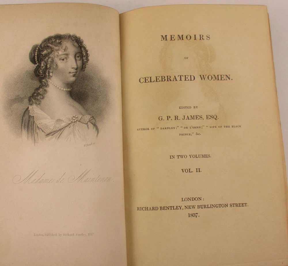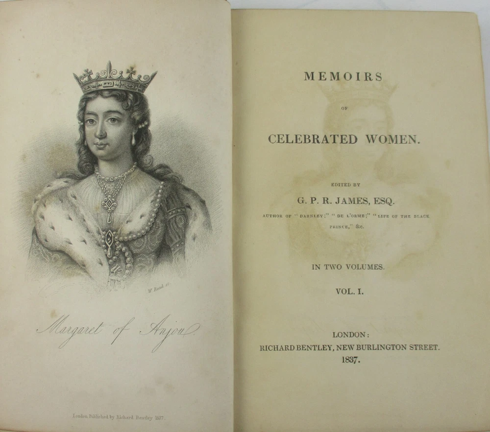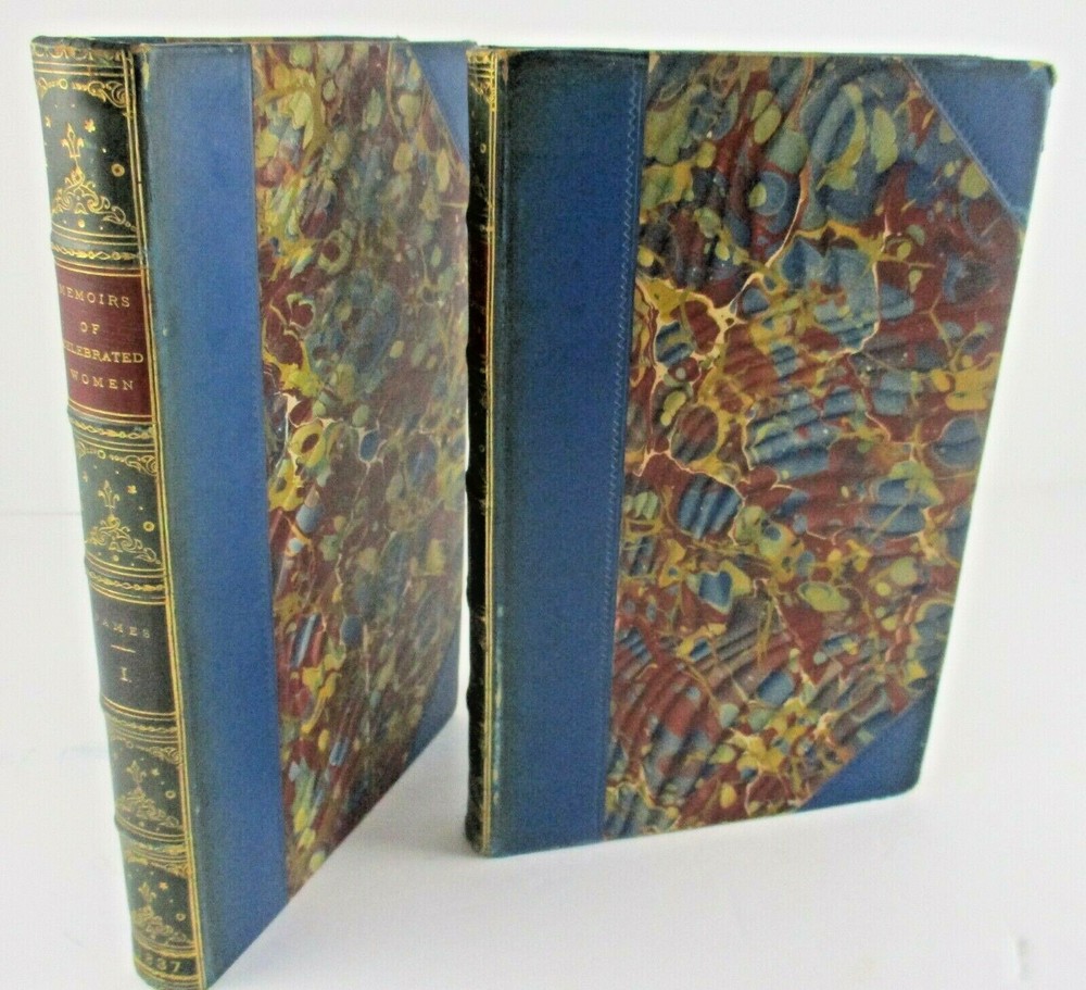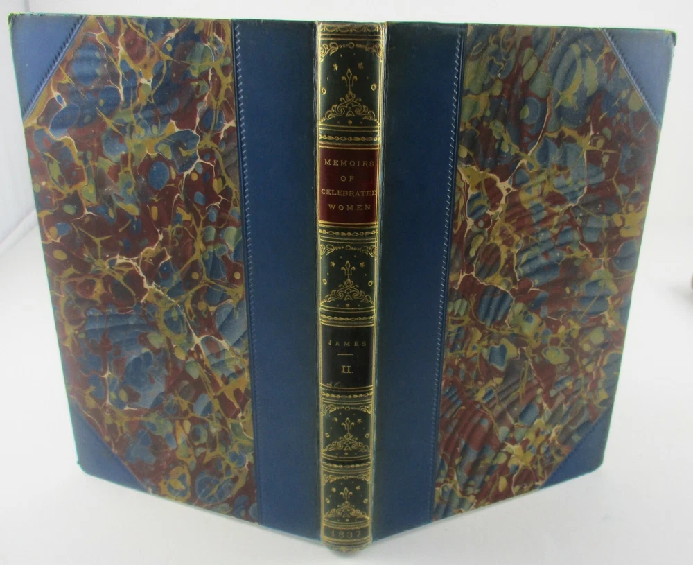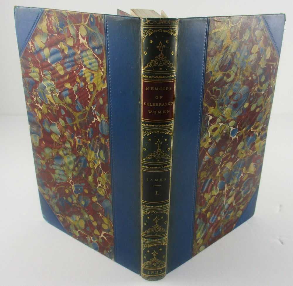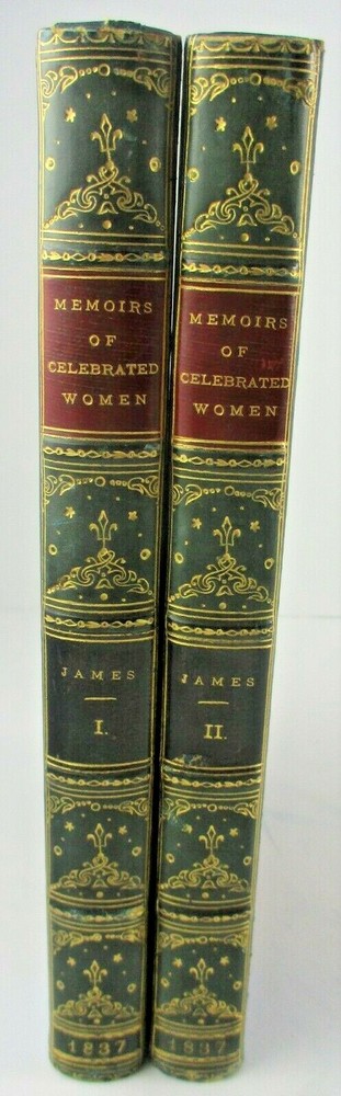 Memoirs of Celebrated Women In Two Volumes edited by G. P. R. James Published in 1837 Leather Hardback Binding 601 Pages The "celebrated women" in this set include Joan of Arc, Margaret of Anjou, Lady Jane Grey, Marchioness of Maintenon, Queen Elizabeth and Donna Maria Pancheco. Features: Beautiful marbled quarter calf-leather binding First Edition Gold gilt lettering and decoration on the spine Raised (hubbed) spine Marbled endpapers (front and back) Frontispiece in both volumes Gold gilt top page edges Published in 1837 Each volume measures 7 3/4" x 5"
