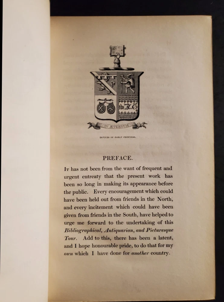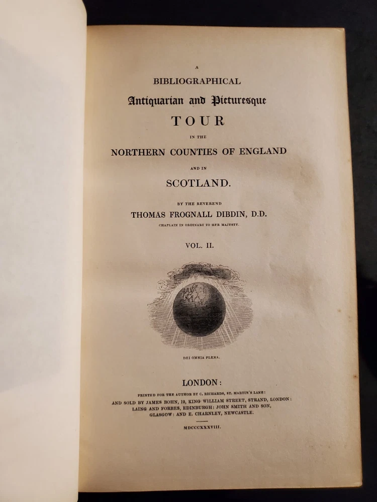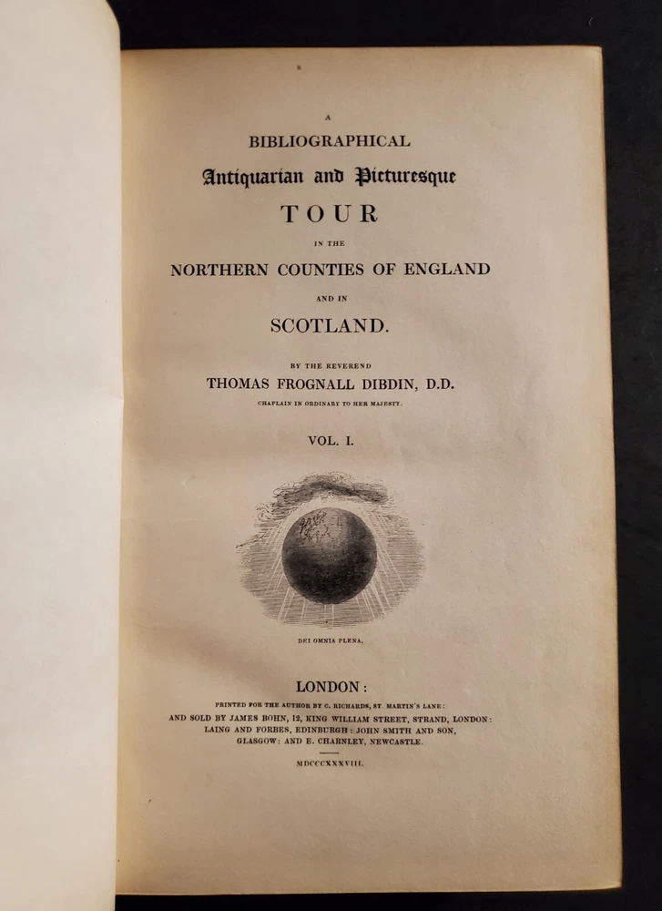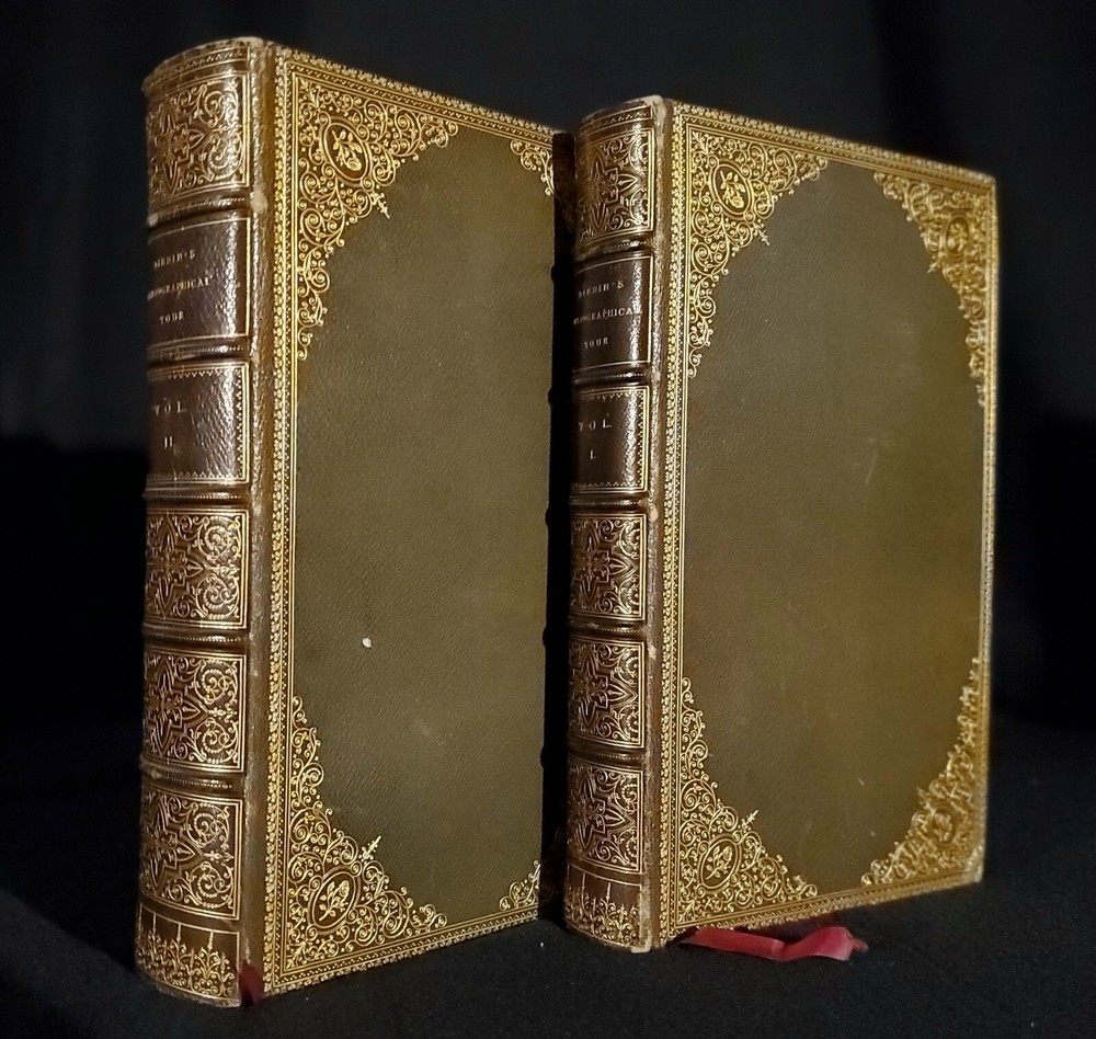 A Bibliographical Antiquarian And Picturesque Tour In The Counties Of England And Scotland. Dibdin, Thomas Frognall Published by C. Richards London, 1838 Complete 2 volume set printed in 1838. Wrapped in beautiful full calf dark green leather with gilt designs and lettering. Nicely preserved previous collectors copy. Interior pages clean and bright with some minor toning as shown. Binding and hinges are in good condition. Only major blemish is the front end-paper which is detached but present as shown in our photos. Otherwise, this is a near fine collectors set! Please see all of our listed photos. . . . . SunRise Rare Books - We ship items world-wide, daily. - Each item is carefully stored and protected in our temperature controlled library. We securely pack each item tightly in cardboard boxes to ensure safe delivery. - Returns accepted within 30 days.