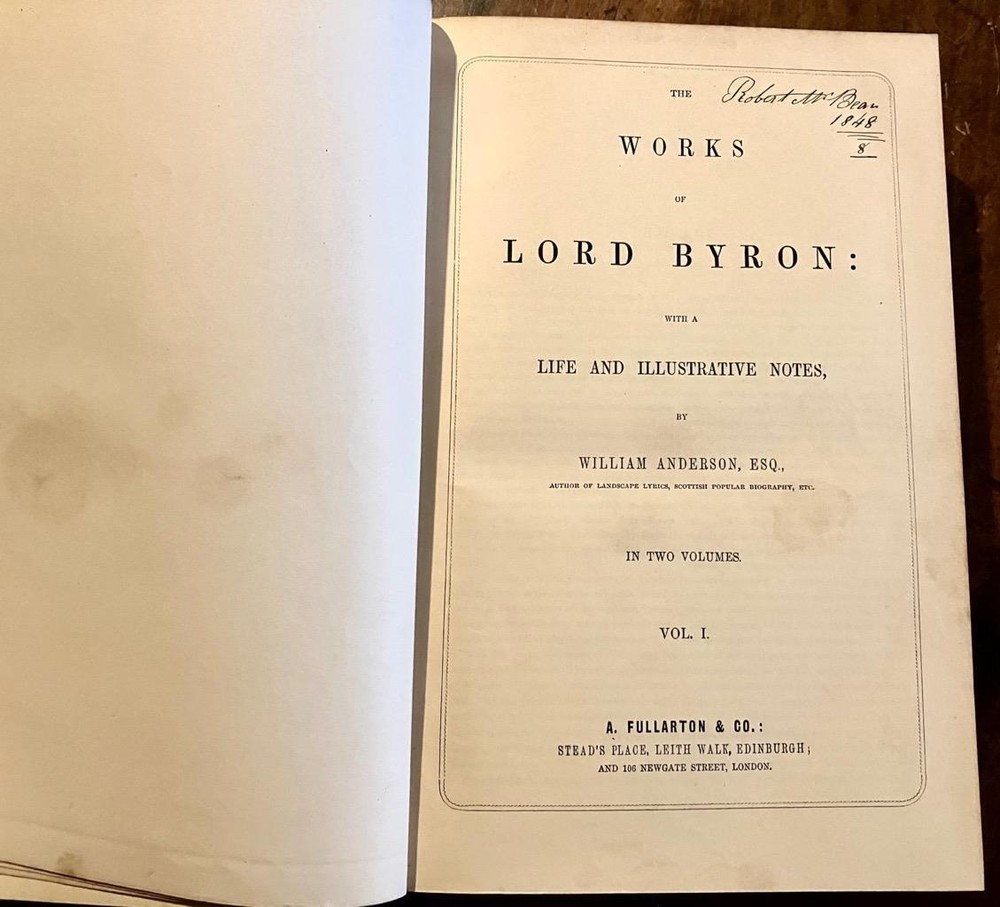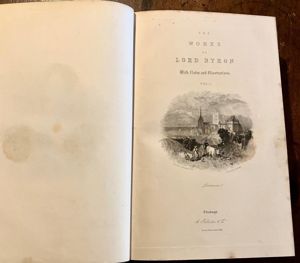 Please scroll down or click on the full description for images & condition report 1840 LORD BYRON Life & Works Leather Bound 2 x Volume Set NUMEROUS ENGRAVINGS 1840 LORD BYRON Life & Works Leather Bound 2 x Volume Set NUMEROUS ENGRAVINGS Click images to enlarge Description THE WORKS OF LORD BYRON WITH A LIFE & ILLUSTRATIVE NOTES, BY WILLIAM ANDERSON PUBLISHED BY A. FULLARTON, LONDON CIRCA 1840 COMPLETE IN TWO VOLUMES BOUND IN 19TH CENTURY HALF LEATHER BINDINGS, FRONTIS & EXTRA ILLUSTRATED TITLE PAGE TO BOTH VOLUMES, MARBLED BOARDS, ENDPAPERS & PAGE EDGES, NUMEROUS FULL PAGE STEEL ENGRAVED ILLUSTRATIONS TO BOTH VOLUMES EACH BOOK MEASURES APPROX 10.5 x 7 INCHES SOME MINOR RUBBING TO COVERS WITH THE VERY OCCASIONAL MINOR PEELING TO LEATHER AT CORNERS, CORNERS BUMPED, SAME NAME & DATE OF 1848 TO TITLE PAGES, ENDPAPERS FOXED WITH OCCASIONAL FOXING TO PAGES & PLATES OVERALL IN VERY GOOD CONDITION WITH BOARDS WELL ATTACHED. HEAVY BOOKS PLEASE CHECK MY E-BAY SHOP FOR RARE & ANTIQUARIAN BOOKS,MAPS & PRINTS Add me to your Favourite Seller Visit My eBay Store Images sell! Get Supersized Images & Free Image Hosting Create your brand with Auctiva's Customizable Templates. Attention Sellers - Get Templates Image Hosting, Scheduling at Auctiva.com. Track Page Views With Auctiva's Counter