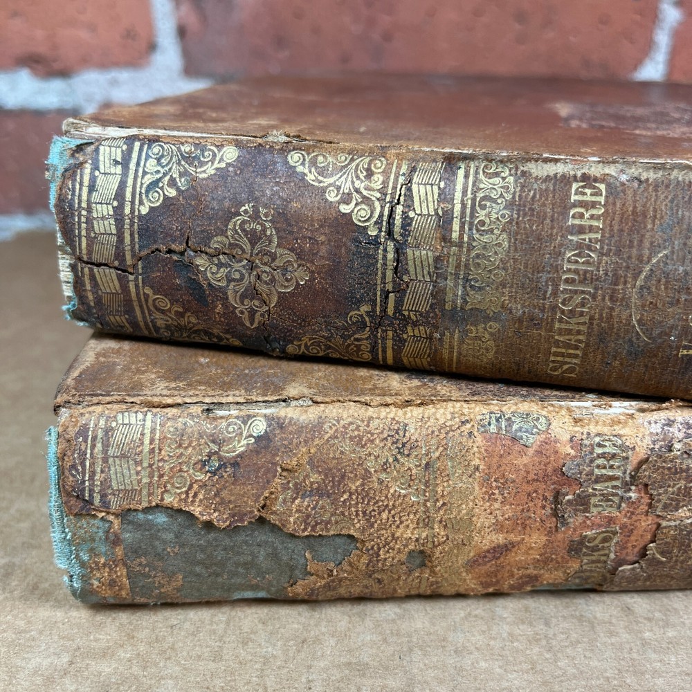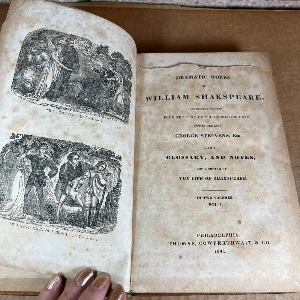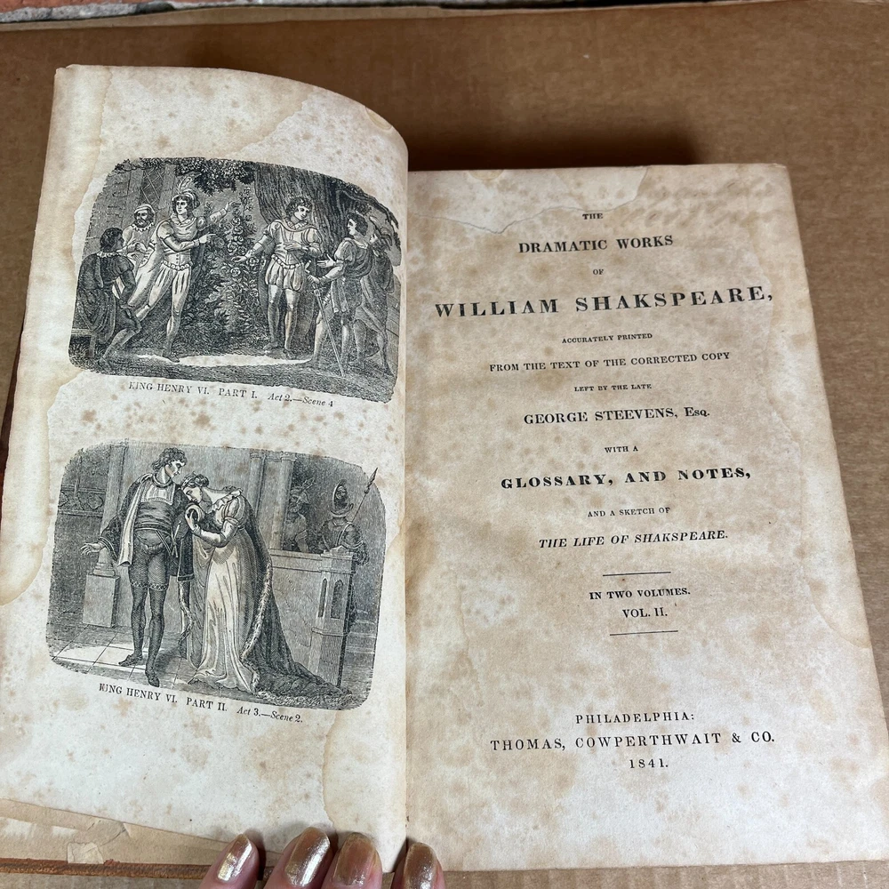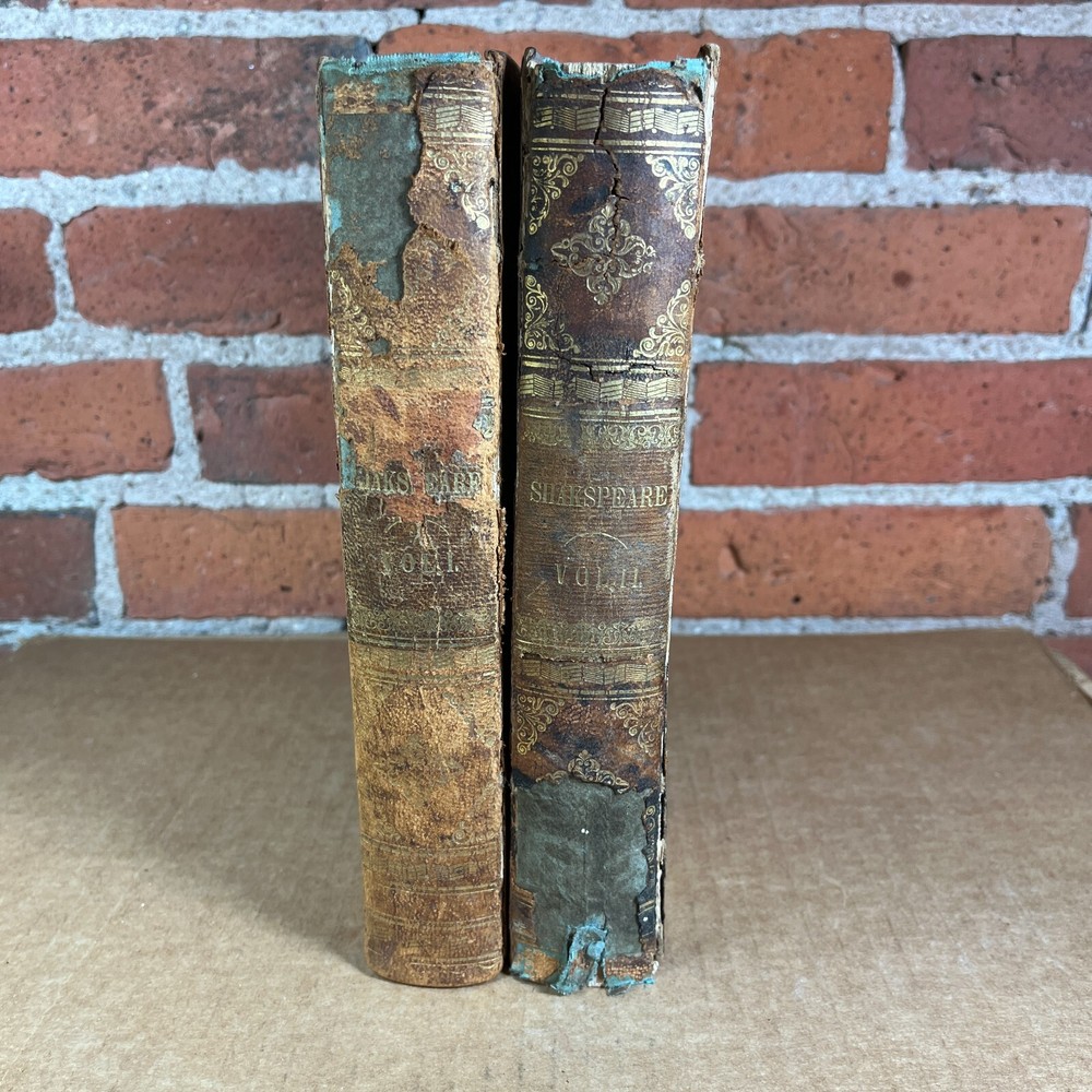 The Dramatic Works of Shakespeare - Two-Volume Set - Leather Bound - 1841 This rare two-volume set of The Dramatic Works of Shakespeare, published in 1841 by Thomas Cowperthwait & Co., is a timeless piece of literary history. Bound in leather, these volumes showcase the classic works of William Shakespeare, preserving his timeless plays in a beautiful antique format. Features: Title: The Dramatic Works of Shakespeare Volumes: Two-volume set Publisher: Thomas Cowperthwait & Co. Publication Year: 1841 Format: Leather bound Condition: Significant wear on leather cover Moderate foxing throughout Boards and endpapers cracked Binding is tight with no loose or missing pages See photos for details A Literary Treasure: These volumes are a wonderful addition for collectors of antique books, Shakespeare enthusiasts, or anyone who appreciates the rich history of 19th-century bookbinding and publication. Despite the wear, the bindings are secure, and the pages remain intact, making this set both a display piece and a readable classic. Carefully Packaged for Safe Delivery: We take pride in securely packaging every item to ensure it arrives in excellent condition. Thank you for looking! Feel free to reach out with any questions or inquiries.