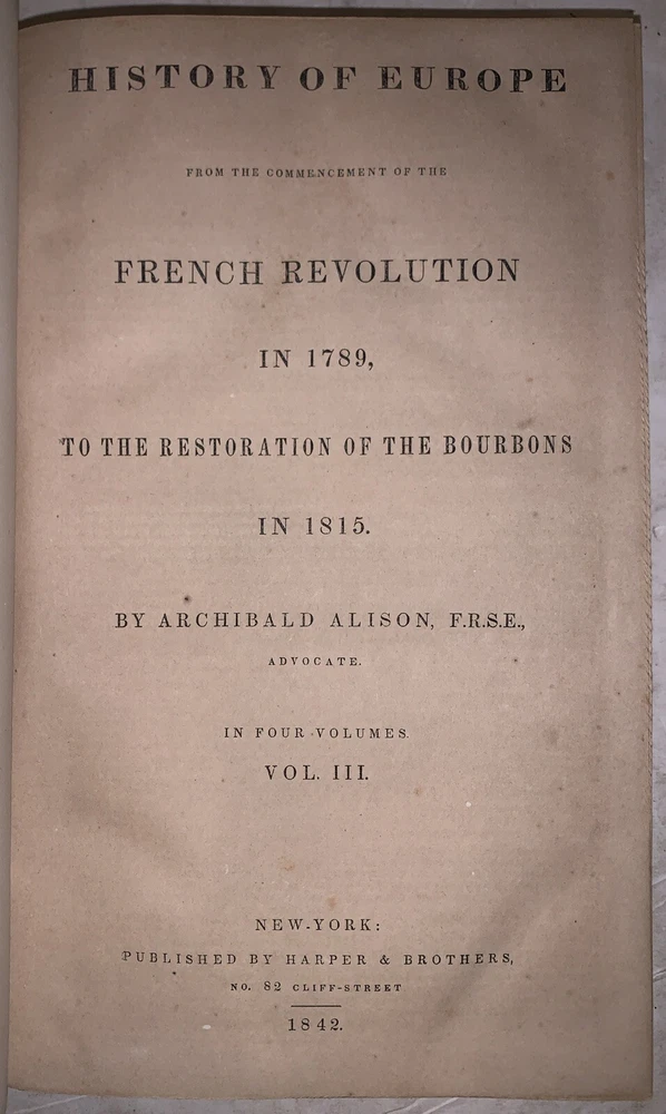 History of Europe from the Commencement of the French Revolution in 1789 to the Restoration of the Bourbons in 1815 by Archibald Alison, F.R.S.E. In Four Volumes New York: Harper & Brothers 1843 Four octavos, 583p; 600p; 612p; 631 pages, bound in period black leather over paper covered boards. Spines with small raised and gilt bands and lettering. Marbled endpapers and edges. The previous owner was Pratt Roberts (1805–1882), whose neat bookplate appears in each volume. Roberts was a resident of East Goshen, Chester County, Pennsylvania. Some rubbing and wear, a few scuffs, some foxing and discoloration, else in very good condition. If you have any questions, feel free to ask, and don't forget to check out my other listings.