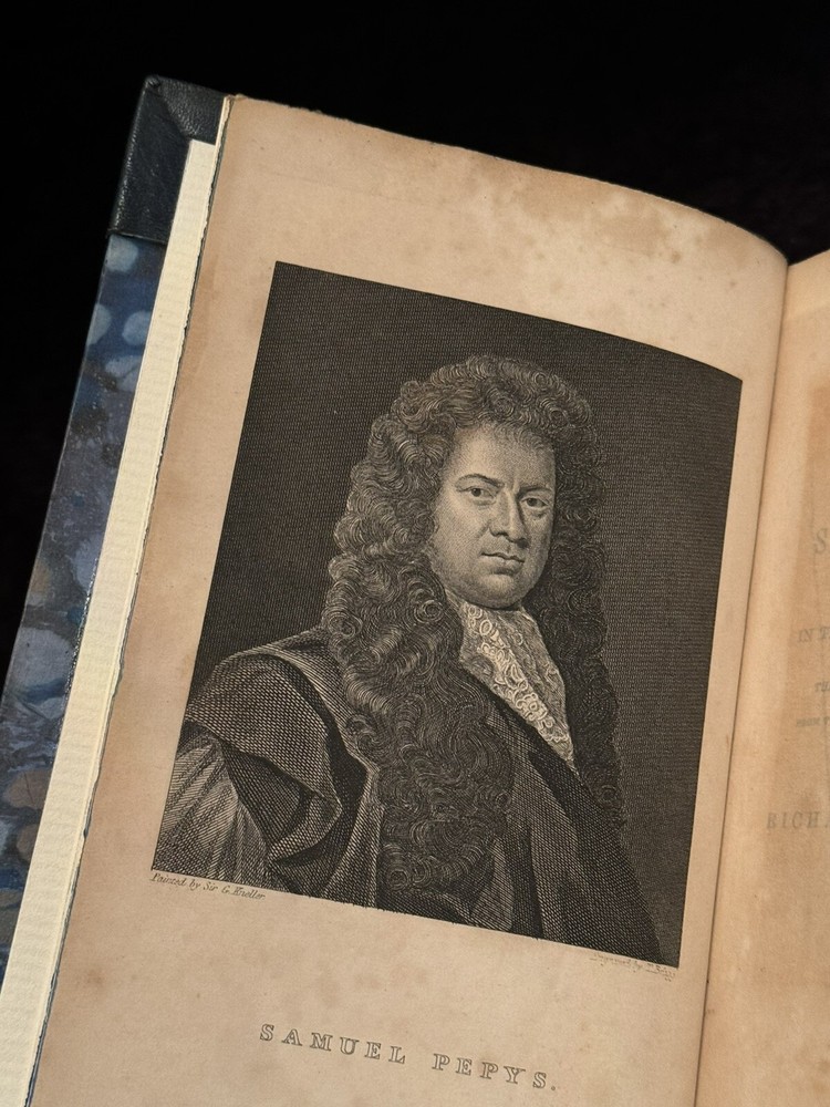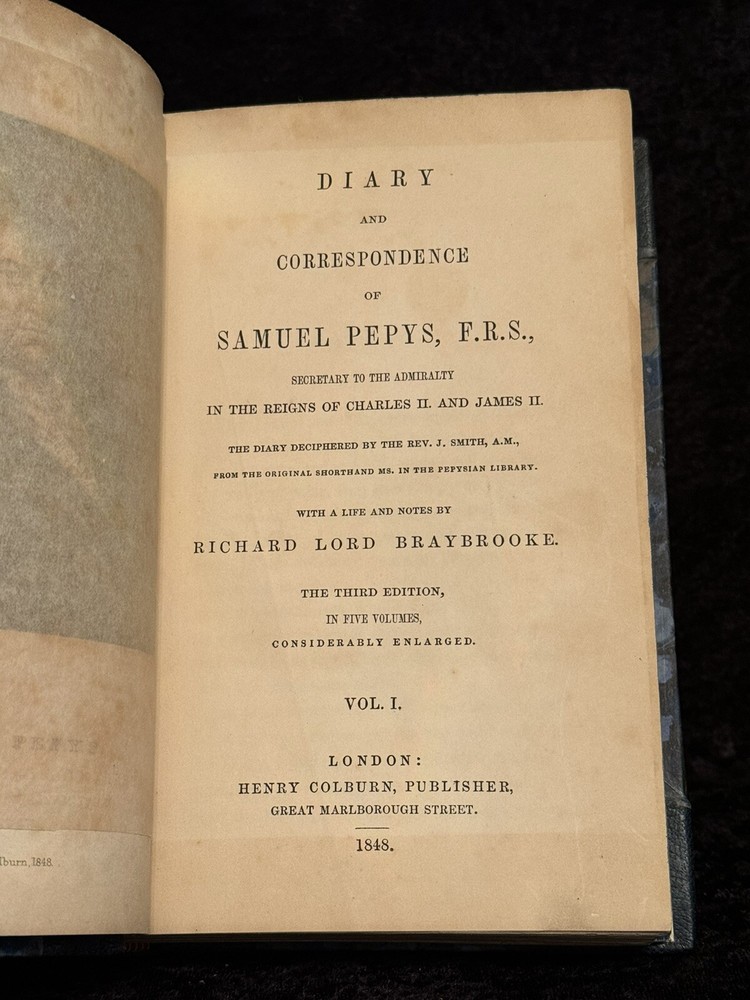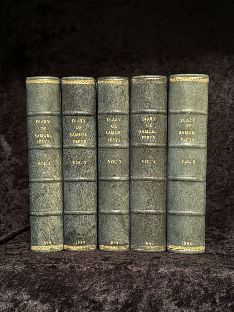 THE DIARY OF SAMUEL PEPYS Secretary to the Admiralty in the Reigns of King Charles II & King James II Five Volume Set London 1848 Diary and Correspondence of Samuel Pepys, F.R.S. Secretary to the Admiralty in the Reigns of Charles II and James II with a Life and Notes by Richard Lord Braybrooke. Considerably Enlarged. London: Henry Colburn, 1848-49. Five Volumes. [App. 8 x 5.25 in] Large Octavo. Bound in three quarter leather with hand marbled boards and gilt to spines. Four raised bands. I llustrated with engraved plates and a folding map. A work of significant importance to period historical research. Nice set. _____________________________________ Items listed on eBay are merely representative of our broader inventory. We specialize in early printed Bibles in English, with a particular focus on first editions and other significant printings. Our stock includes a wide range of Tyndale New Testaments, as well as first editions of the Coverdale Bible (1535), the Matthews Bible (1537), the Great Bible (1539), the Geneva Bible (1560), the Bishops Bible (1568) and the King James Bible (1611). Please do not hesitate to enquire regarding other early printed books and manuscript s.