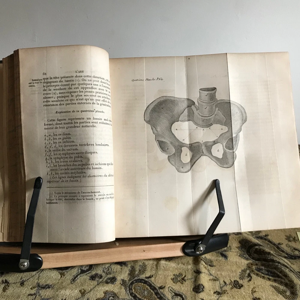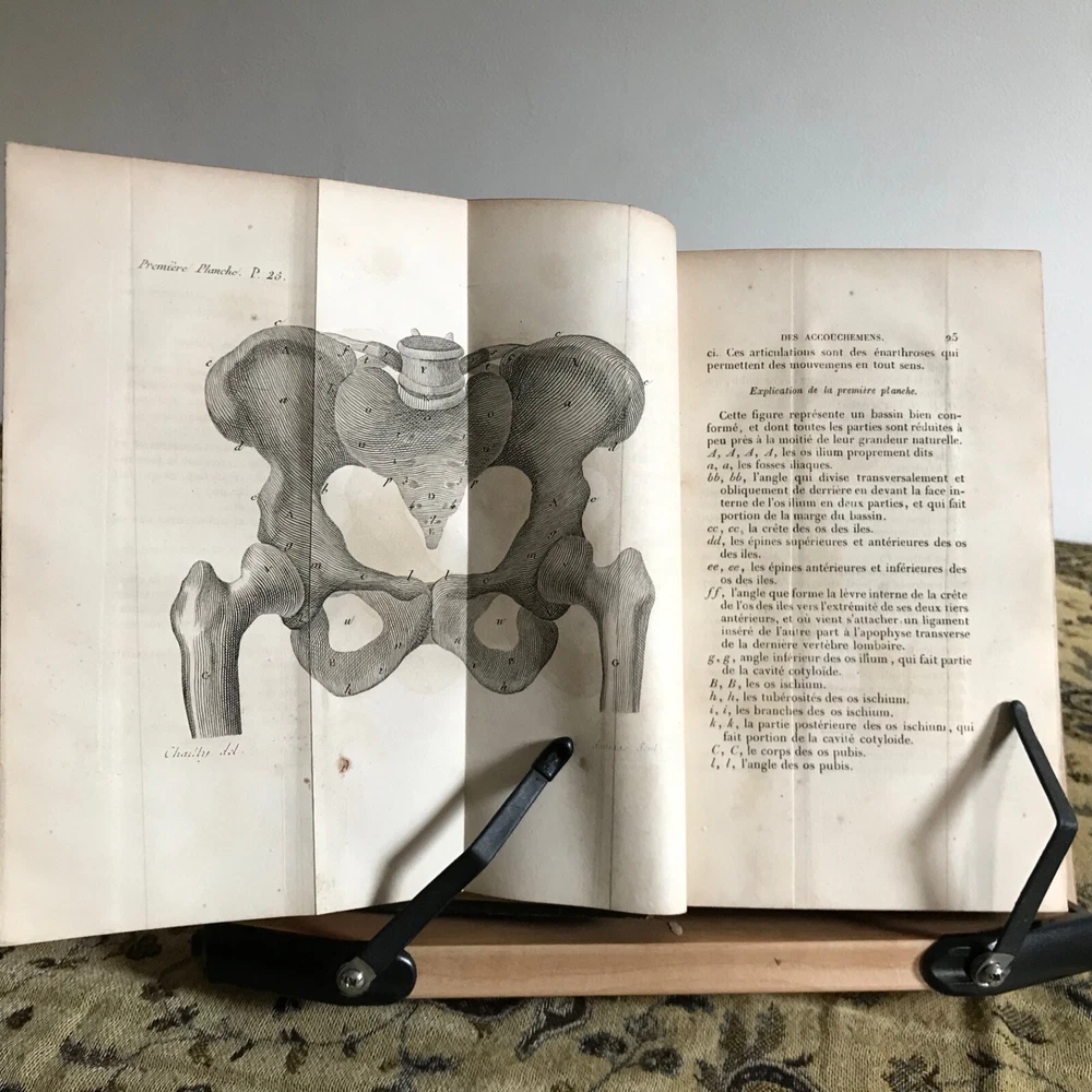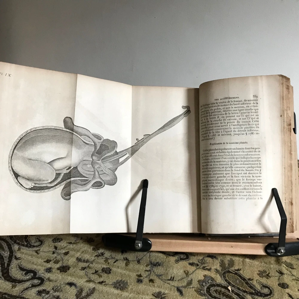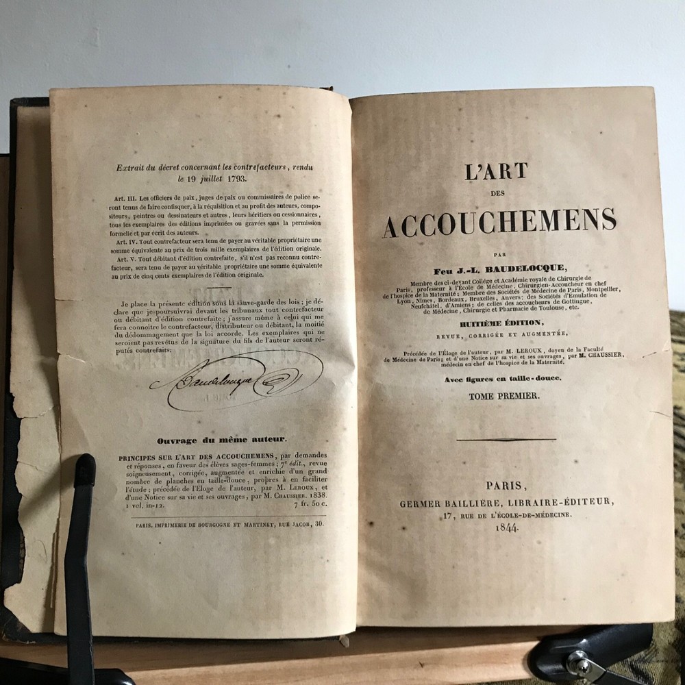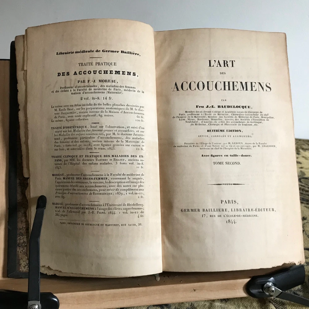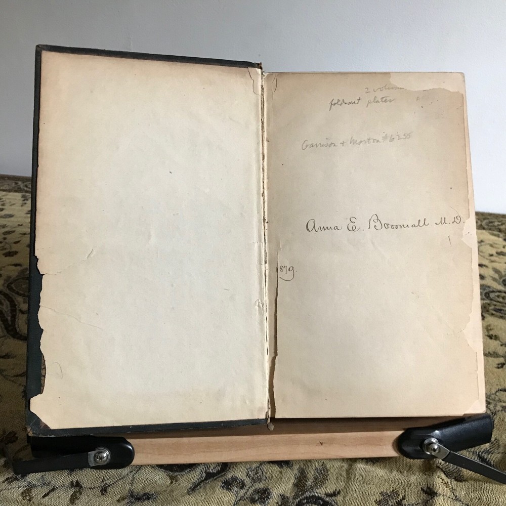 L’Art Des Accouchemens Par Feu J.-L. Baudelocque, Germer Bailliere, Libraire-Editeur, Paris, 1844, Complete in Two Volumes, 8.5 x 5.5”, fold-out plates, full prize binding green dyed leather, 8vo. In fair condition. Prize bindings for Emeline Horton Cleveland’s work in obstetrics and gynecology at the Woman’s Medical College of Philadelphia. Boards are worn with moderate wear to hinges and corners. Typical edge wear.. dated 1861 front board. Gilt finishing remains present. Marbled fore edge is toned, but intact. Interiors are appropriately age-toned. Leaves are brittle and chipping along edges, particularly to first few pages of texts. Volume one flyleaf is torn away from binding, but intact. Anna E. Broomall M.D., 1879 on front flyleaf. Anna’s signature is also on front flyleaf in second volume. Old hand signature on rear of title page in volume one. Bindings intact. Free of known marginalia. Folding plates in good, worker order. Fragile leaves, but able to be read. Please see photos. Fascinating provenance of this important French obstetrics set! Our book was owned by Emeline Horton Cleveland M.D. (1829-1878) when it was gifted to her during her studies in Paris. She was awarded the Medal-Ecole d’acchouchment de Paris. Cleveland was one of the first women to perform major abdominal and gynecological surgery in the United States. She became one of the first woman physicians associated with a large public hospital in the United States, as well. She established one of the first nursing assistant training programs in the country! A graduate of Oberlin and the Women’s Medical College of Pennsylvania, Cleveland received postgraduate training in Philadelphia, Paris and London and was focused on obstetrics and gynecology and hospital administration. She was made dean of the Woman’s Medical College by 1872. She returned to Philadelphia in 1862 (these texts are dated 1861, proving that she was indeed in Paris when she was gifted these) and was made chief resident at the Woman’s Hospital in Philadelphia. The goal of the hospital was to provide patient care experience for medical students at the Woman’s Medical College in Philadelphia. Cleveland’s work was evidence that women could make good surgeons. After Cleveland’s death in 1878, Dr. Anna Elizabeth Broomall M.D. (1847-1931) was chief resident physician at the Woman’s Hospital of the Woman’s Medical College of Pennsylvania from 1875 to 1883. Born into a Quaker family, she was fortunate to have parents who supported equality and higher education for women. In 1879 she took over as chair of obstetrics after the death of Emeline. To improve training of her students and to provide much-needed patient care she established one of the first clinics of out-practice maternity care in the country. Her clinic was located in South Philadelphia— a community whose poor residents were particularly at risk of fatal complications during pregnancy and delivery. Dr. Broomall paid particular attention to to the use of antiseptics and state-of-the-art procedures such as Caesarean section and other methods of delivery of the fetus. By the end of her tenure, the College could point to its low mortality rate (less than twenty per two thousand) compared to that of other institutions, as evidence that women physicians could practice medicine successfully, applying the highest of standards. RAREF1844HXYK
