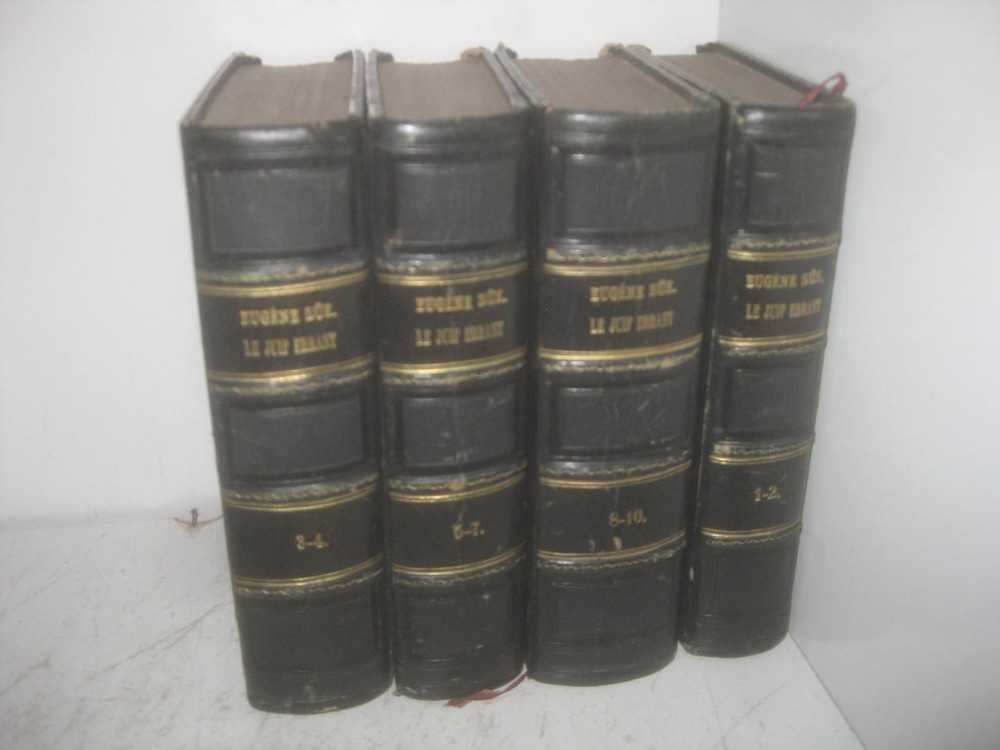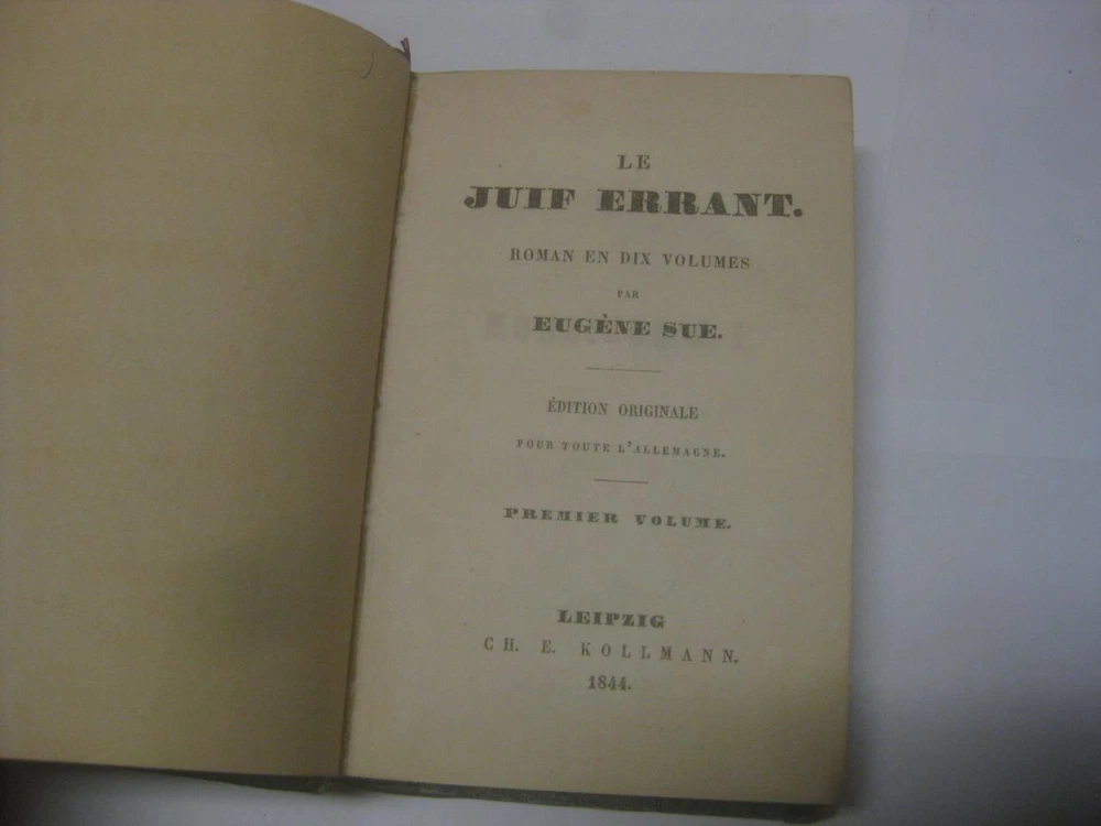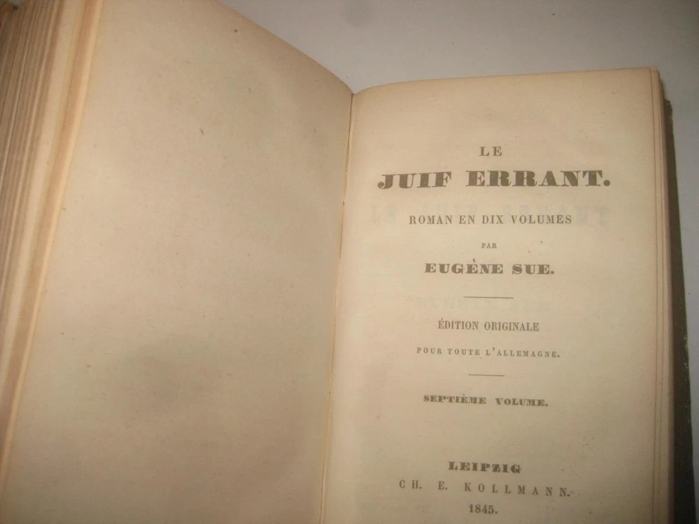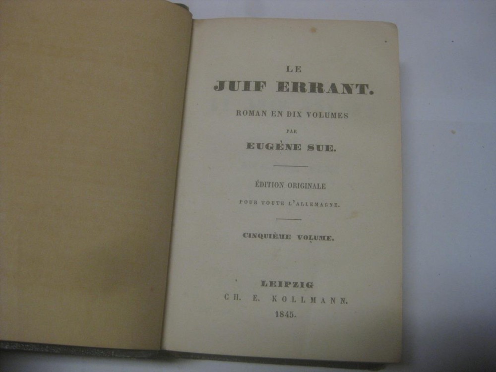 Le juif errant. Roman en dix volumes. Édition originale. Author: Eug'ene Sue Publisher: Leipzig : Ch. E. Kollmann, 1844-1845. LANGUAGE: French VG CONDITION, FINE COPIES, BOUND IN 4 HALF LEATHER BINDINGS ATTRACTIVE SET. FIRST EDITION IN BOOK FORM The Wandering Jew (French: Le Juif errant) is an 1844 novel by the French writer Eugène Sue. The story is entitled The Wandering Jew, but the figure of the Wandering Jew himself plays a minimal role. The prologue of the text describes two figures who cry out to each other across the Bering Straits. One is the Wandering Jew, the other his sister, Hérodiade. The Wandering Jew also represents the cholera epidemic— wherever he goes, cholera follows in his wake.[1] The Wandering Jew and Hérodiade are condemned to wander the earth until the entire Rennepont family has disappeared from the earth. The connection is that the descendants of the sister are also the descendants of Marius de Rennepont, Huguenots persecuted under Louis XIV by the Jesuits. Sue never explains how a Huguenot family came to be descended from an immortal Jewish woman who never married or had children. The brother and sister are compelled to protect this very family from all harm. After this first introduction, the two appear only very rarely. The Rennepont family is unaware that these protective éminences grises exist, but they benefit from their protection in various ways, be it by being saved from scalping by the Native Americans, or from languishing in prison. The Rennepont family lost its position and most of its wealth during the French persecution of the Protestants (after the Revocation of the Edict of Nantes in 1685). A small fortune was given to a Jewish banker immediately before the Renneponts dispersed all over Europe and Asia, and this fortune has grown into a huge sum, through the miracle of compound interest. In 1682, the Rennepont family members each got a bronze medal telling them to meet back in Paris 150 years later, at which time the fortune will be divided among the surviving members. So much time has passed, however, that almost none of the still-living Renneponts have any idea why they need to come to Paris. They nevertheless set out from India, Siberia, America, France, and elsewhere to make their way to rue Saint-François No. 3 in Paris by 13 February 1832. The members of the family are not only dispersed all over the world, but also all over the social ladder, as laborers, factory owners, princes (in India!) and the independently wealthy. The Jesuits have heard of this huge fortune and want to get it for themselves. Two Jesuits (Rodin and Père d'Aigrigny) and their many recruited accomplices are in charge of obtaining the money for the Society of Jesus and dispossessing the Rennepont family. Their plan is to have only the unwitting Gabriel, the Jesuit missionary, show up to claim the fortune. Since he is a monk and can have no possessions of his own, the fortune will go to the wily Jesuits. Gabriel's entry into the order is not accidental – it is his pious mother, manipulated by the Jesuits, who persuaded him to become a Jesuit. The Jesuits have spies and henchmen all over the world, from the remote Americas to Siberia, and they use them to put obstacles in the paths of the Renneponts as they make their way back to Paris. Moreover, they also spy on each other, demonstrating that they don't even trust each other. The principal obstacles are as follows: Gabriel, Jesuit missionary in America, Rennepont. No obstacles, because he is supposed to collect the fortune. Dagobert, friend of the Rennepont family and guardian of the orphans Rose and Blanche (see below). Has his papers and the medal stolen by Morok, an animal tamer and accomplice of the Jesuits. Also has his horse, Jovial, killed by Morok's panther. Forced to travel on foot without papers and arrested for vagrancy. Freed by Hérodiade. Lured to a false meeting with a notary pretending to have messages from Général Simon (see below). Rose and Blanche, twin Rennepont orphans coming from Siberia. Since they are under Dagobert's protection, they are also arrested and put in jail for vagrancy. Also, they are put in a convent by Dagobert's wife while Dagobert is at the notary meeting. She is made to swear by the Jesuits that she will not tell Dagobert where they are. Général Simon, father of Rose and Blanche, is a Rennepont, unknown to his daughters. Général Simon has been so long exiled from France and his family that he doesn't even know he has daughters. He thinks he has one son. He does not arrive for the meeting, either, although his situation is less clear than that of the others. Djalma, Indian prince Rennepont, coming from the Far East. In Java, Djalma is accused of belonging to a murderous sect called the “Etrangleurs,” who closely resemble the Thuggee. One of the Jesuit henchmen tattoos Djalma with the Etrangleur tattoo on the inside of his arm while he is asleep. Djalma tries to prove that he is not an Etrangleur, but because of the tattoo is thrown in jail. This causes him to miss the boat to Paris. After finally arriving in Paris, he is poisoned by Farighea (whom he had thought was his friend), so that he goes into a prolonged sleep. The Jesuits then kidnap him. Jacques Rennepont, Parisian workman. He was given papers by his father that explain his fortune, but since he doesn't know how to read or write, he is unable to use them. The Jesuits send a money lender to him; when he cannot repay the loan, he is thrown into debtors' prison. François Hardy, progressive factory owner, Paris. He is betrayed by his best friend who, under the influence of Père d'Aigrigny, lures Hardy to central France, ensuring that he will not arrive on 13 February. Adrienne de Cardoville, independently wealthy, Paris. Lives with her aunt, who is a former mistress of father d'Aigrigny. The aunt, the abbot Aigrigny, and a Jesuit doctor Baleinier connive to put Adrienne in an insane asylum that happens t