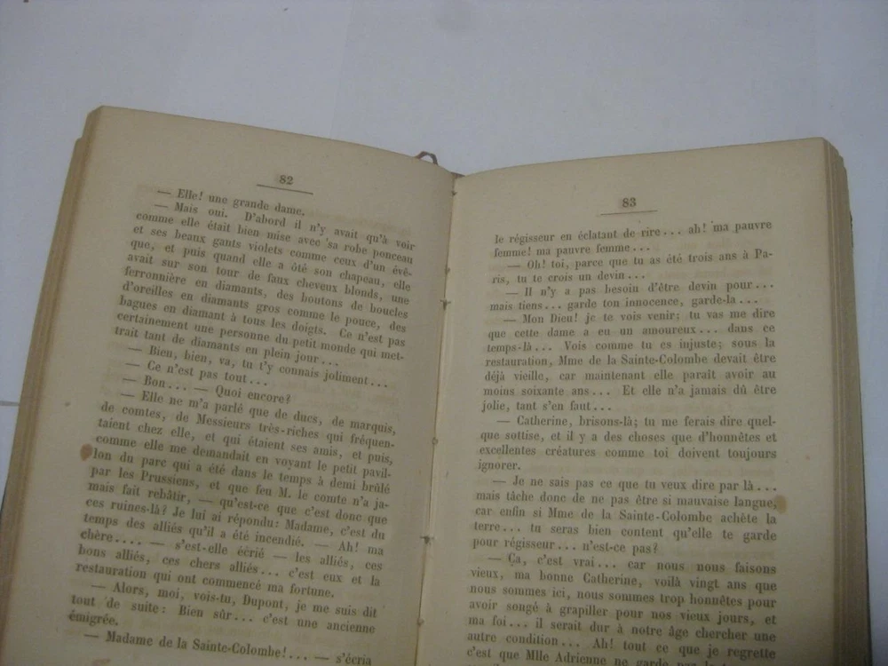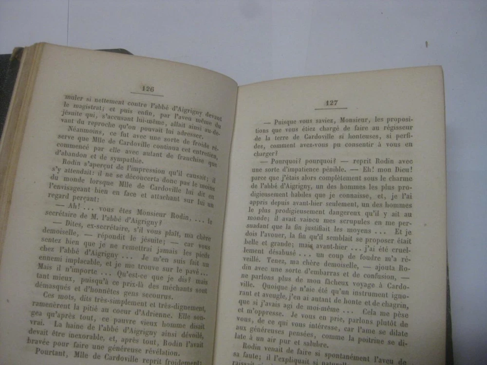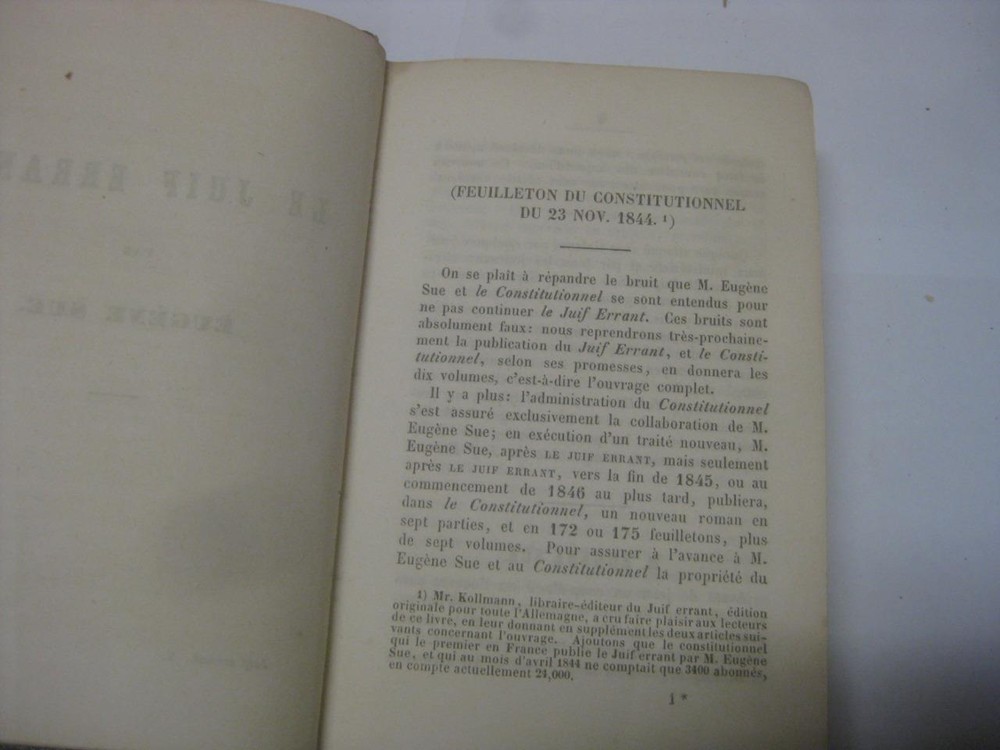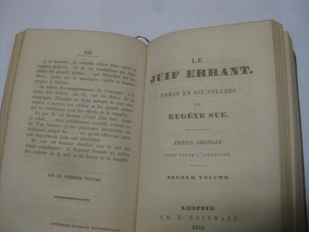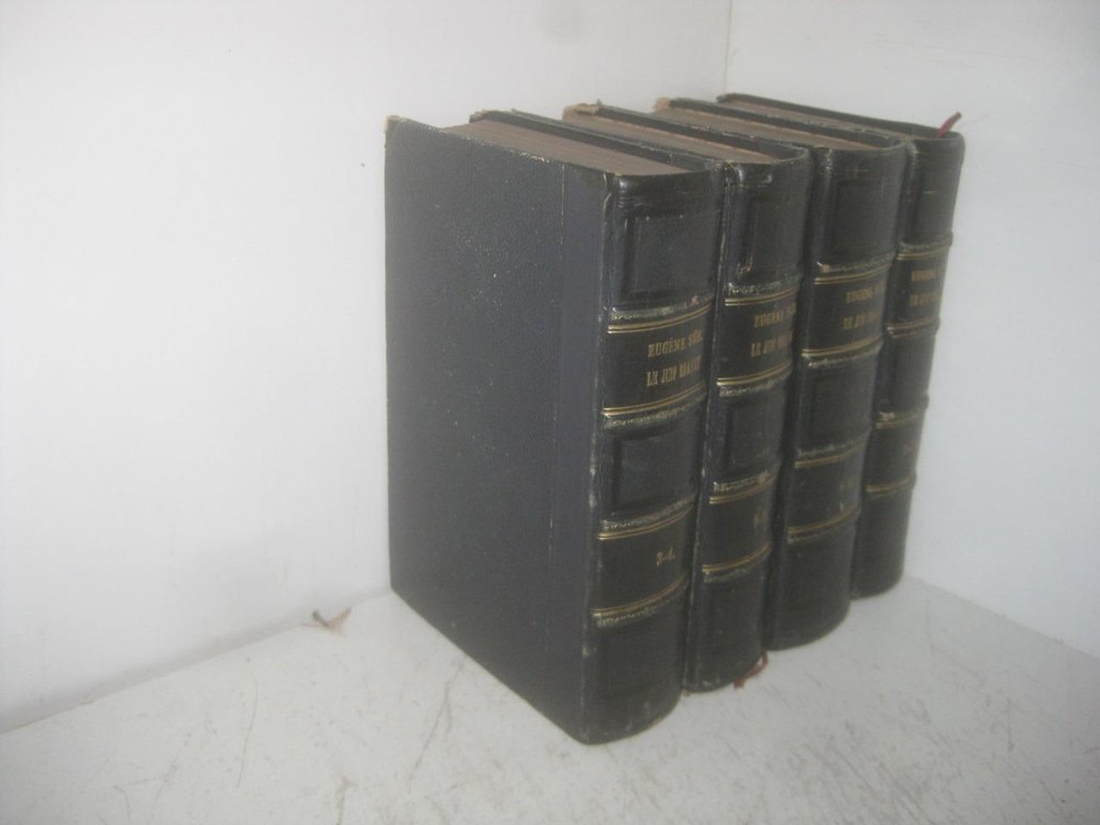 Le juif errant. Roman en dix volumes. Édition originale. Author: Eug'ene Sue Publisher: Leipzig : Ch. E. Kollmann, 1844-1845. LANGUAGE: French VG CONDITION, FINE COPIES, BOUND IN 4 HALF LEATHER BINDINGS ATTRACTIVE SET. FIRST EDITION IN BOOK FORM The Wandering Jew (French: Le Juif errant) is an 1844 novel by the French writer Eugène Sue. The story is entitled The Wandering Jew, but the figure of the Wandering Jew himself plays a minimal role. The prologue of the text describes two figures who cry out to each other across the Bering Straits. One is the Wandering Jew, the other his sister, Hérodiade. The Wandering Jew also represents the cholera epidemic— wherever he goes, cholera follows in his wake.[1] The Wandering Jew and Hérodiade are condemned to wander the earth until the entire Rennepont family has disappeared from the earth. The connection is that the descendants of the sister are also the descendants of Marius de Rennepont, Huguenots persecuted under Louis XIV by the Jesuits. Sue never explains how a Huguenot family came to be descended from an immortal Jewish woman who never married or had children. The brother and sister are compelled to protect this very family from all harm. After this first introduction, the two appear only very rarely. The Rennepont family is unaware that these protective éminences grises exist, but they benefit from their protection in various ways, be it by being saved from scalping by the Native Americans, or from languishing in prison. The Rennepont family lost its position and most of its wealth during the French persecution of the Protestants (after the Revocation of the Edict of Nantes in 1685). A small fortune was given to a Jewish banker immediately before the Renneponts dispersed all over Europe and Asia, and this fortune has grown into a huge sum, through the miracle of compound interest. In 1682, the Rennepont family members each got a bronze medal telling them to meet back in Paris 150 years later, at which time the fortune will be divided among the surviving members. So much time has passed, however, that almost none of the still-living Renneponts have any idea why they need to come to Paris. They nevertheless set out from India, Siberia, America, France, and elsewhere to make their way to rue Saint-François No. 3 in Paris by 13 February 1832. The members of the family are not only dispersed all over the world, but also all over the social ladder, as laborers, factory owners, princes (in India!) and the independently wealthy. The Jesuits have heard of this huge fortune and want to get it for themselves. Two Jesuits (Rodin and Père d'Aigrigny) and their many recruited accomplices are in charge of obtaining the money for the Society of Jesus and dispossessing the Rennepont family. Their plan is to have only the unwitting Gabriel, the Jesuit missionary, show up to claim the fortune. Since he is a monk and can have no possessions of his own, the fortune will go to the wily Jesuits. Gabriel's entry into the order is not accidental – it is his pious mother, manipulated by the Jesuits, who persuaded him to become a Jesuit. The Jesuits have spies and henchmen all over the world, from the remote Americas to Siberia, and they use them to put obstacles in the paths of the Renneponts as they make their way back to Paris. Moreover, they also spy on each other, demonstrating that they don't even trust each other. The principal obstacles are as follows: Gabriel, Jesuit missionary in America, Rennepont. No obstacles, because he is supposed to collect the fortune. Dagobert, friend of the Rennepont family and guardian of the orphans Rose and Blanche (see below). Has his papers and the medal stolen by Morok, an animal tamer and accomplice of the Jesuits. Also has his horse, Jovial, killed by Morok's panther. Forced to travel on foot without papers and arrested for vagrancy. Freed by Hérodiade. Lured to a false meeting with a notary pretending to have messages from Général Simon (see below). Rose and Blanche, twin Rennepont orphans coming from Siberia. Since they are under Dagobert's protection, they are also arrested and put in jail for vagrancy. Also, they are put in a convent by Dagobert's wife while Dagobert is at the notary meeting. She is made to swear by the Jesuits that she will not tell Dagobert where they are. Général Simon, father of Rose and Blanche, is a Rennepont, unknown to his daughters. Général Simon has been so long exiled from France and his family that he doesn't even know he has daughters. He thinks he has one son. He does not arrive for the meeting, either, although his situation is less clear than that of the others. Djalma, Indian prince Rennepont, coming from the Far East. In Java, Djalma is accused of belonging to a murderous sect called the “Etrangleurs,” who closely resemble the Thuggee. One of the Jesuit henchmen tattoos Djalma with the Etrangleur tattoo on the inside of his arm while he is asleep. Djalma tries to prove that he is not an Etrangleur, but because of the tattoo is thrown in jail. This causes him to miss the boat to Paris. After finally arriving in Paris, he is poisoned by Farighea (whom he had thought was his friend), so that he goes into a prolonged sleep. The Jesuits then kidnap him. Jacques Rennepont, Parisian workman. He was given papers by his father that explain his fortune, but since he doesn't know how to read or write, he is unable to use them. The Jesuits send a money lender to him; when he cannot repay the loan, he is thrown into debtors' prison. François Hardy, progressive factory owner, Paris. He is betrayed by his best friend who, under the influence of Père d'Aigrigny, lures Hardy to central France, ensuring that he will not arrive on 13 February. Adrienne de Cardoville, independently wealthy, Paris. Lives with her aunt, who is a former mistress of father d'Aigrigny. The aunt, the abbot Aigrigny, and a Jesuit doctor Baleinier connive to put Adrienne in an insane asylum that happens t