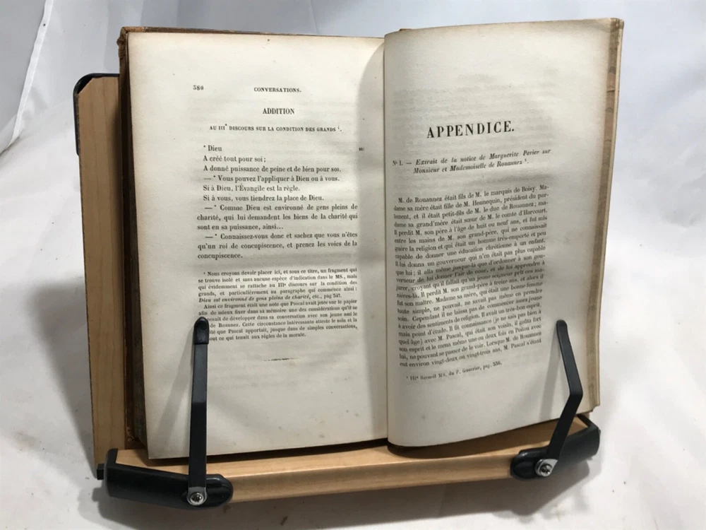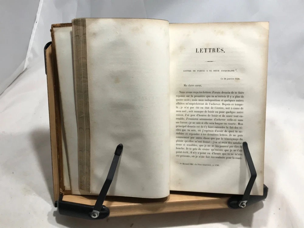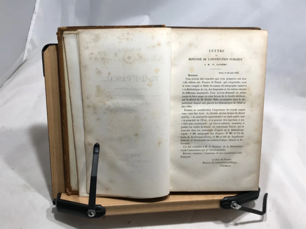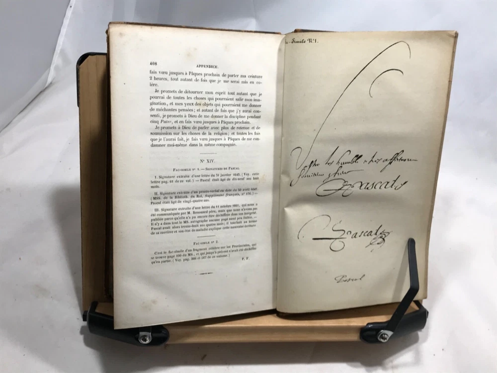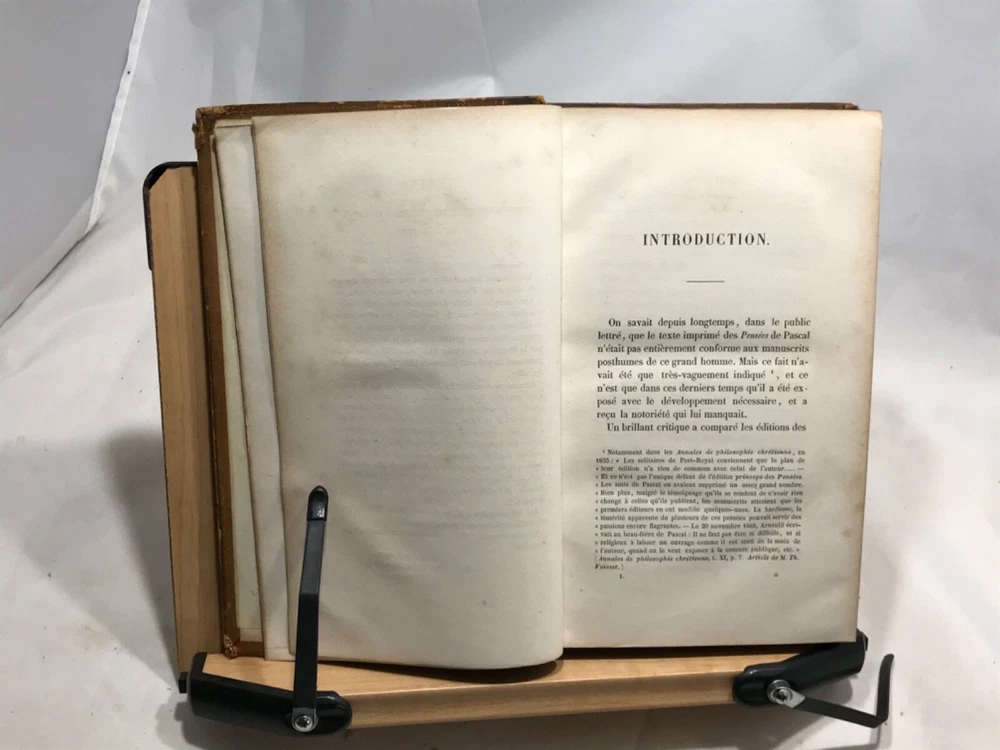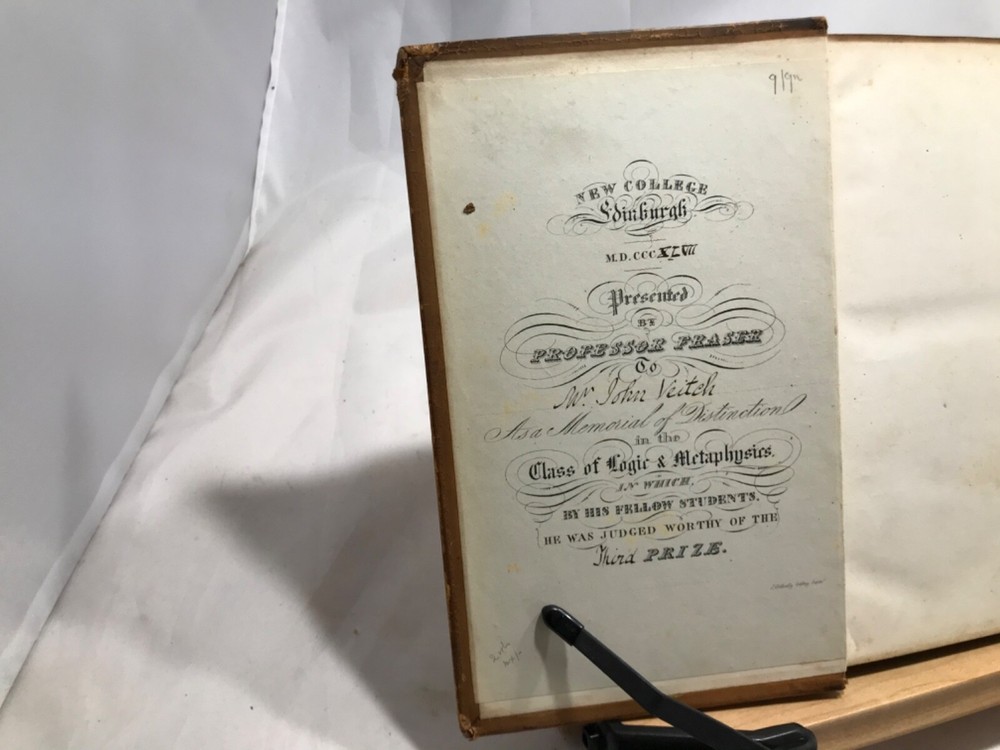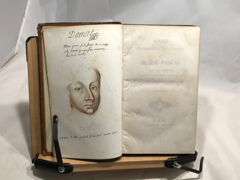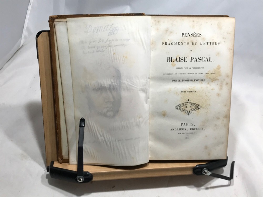 Pensees Fragments et Lettres de Blaise Pascal, Publies Pour La Premiere Fois, Par M. Prosper Faugere, Andrieux, Editeurs, Paris, 1844, two volume set, full leather, 8vo. In good condition, nicely bound. Bookplate of famous poet John Veitch (more information below). Tome I spine has damage to top, missing segment. Boards corners are rubbed from typical shelf wear. Textblock is typically tanned and has minor foxing. Minor pencil marks throughout. Please see photos. Blaise Pascal was a French mathematician, physicist, inventor, writer and Catholic theologian. Our copy of his musings was once owned by John Veitch, Scottish poet, philosopher, historian & son of a Peninsular War veteran. Veitch was assistant lecturer successively to Sir William Hamilton and Alexander Campbell Fraser (1856-1860). Alexander Campbell Fraser was a Scottish theologian, professor and fellow of Royal Society of Edinburgh. He was presented to Queen Victoria during her diamond jubilee(1897) tour of Scotland. In 1860 Veitch was appointed to the chair of logic, metaphysics and rhetoric at the Univeristy of St. Andrews. In philosophy an intuitionist, he dismissed the idealist arguments with some abruptness, and thereby lost much of the influence gained by the force of his personal character. COLH1845AGJA