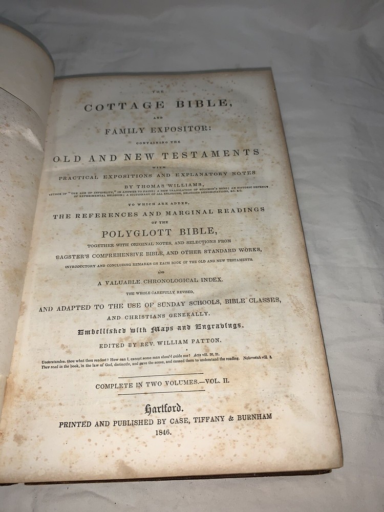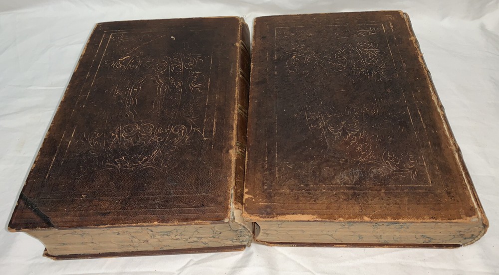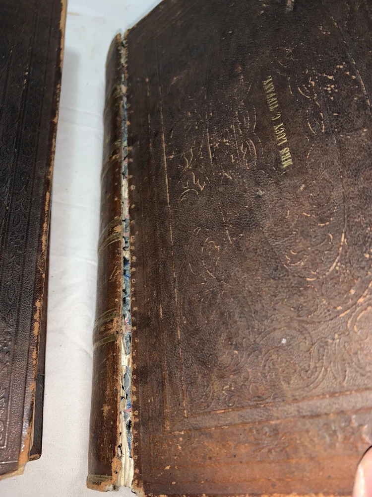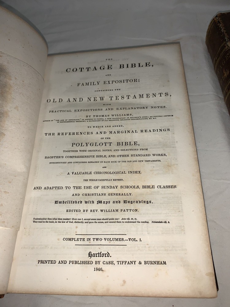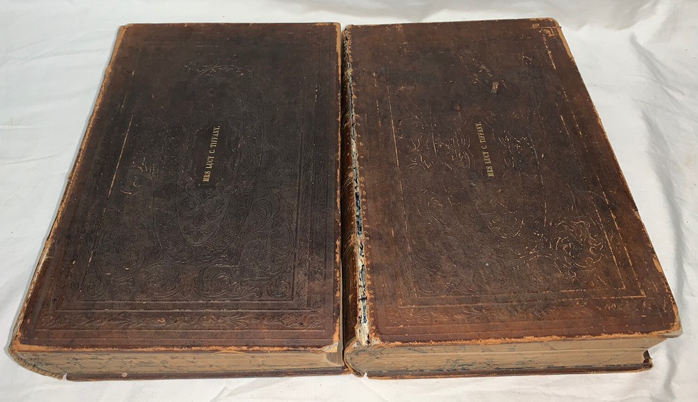 1846 “The Cottage Bible and Family Expositor” complete in 2 volumes. Published by Case, Tiffany & Burnham for Mrs. Lucy C. Tiffany, family member of the publisher. Research shows a Lucy Conklin Frazier, born 1817 in Connecticut, who later married Oliver Tiffany. The Bible’s feature extensive period ephemera, as well as Lucy’s handwritten notes, including extensive Tiffany/Frazier family genealogy inked on the personal expository pages. The books are in good condition, but both volumes have loose front boards. The second volume had been seen at one time to try to stabilize the binding. Lovely, rare Bible set. Sold as is!