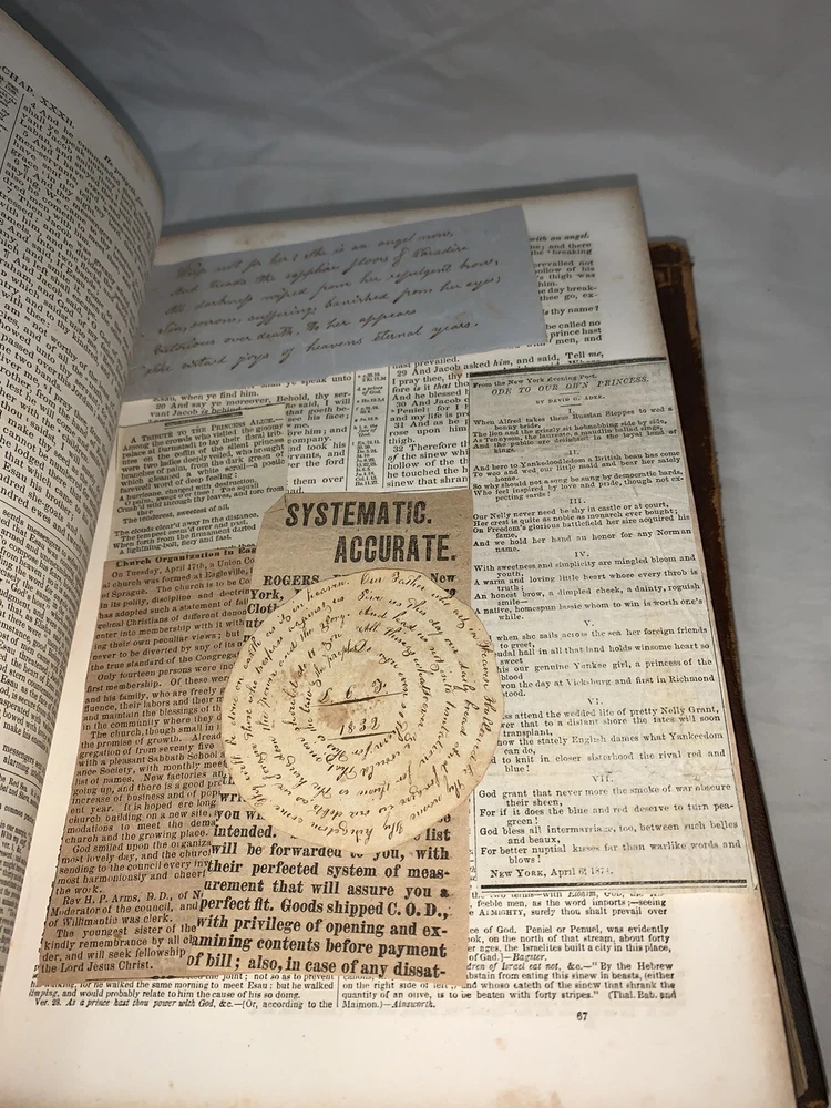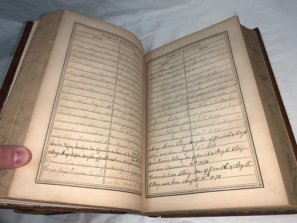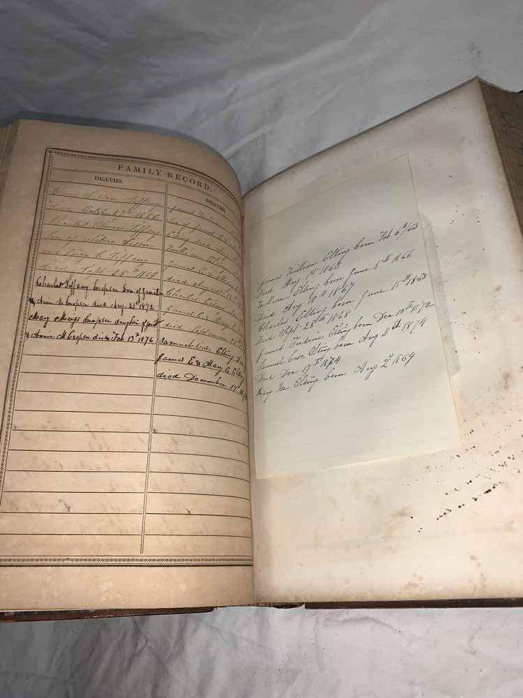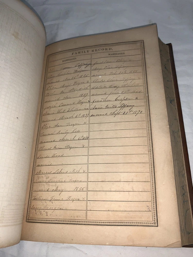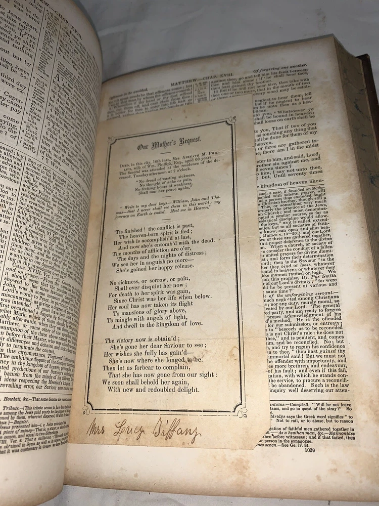 1846 “The Cottage Bible and Family Expositor” complete in 2 volumes. Published by Case, Tiffany & Burnham for Mrs. Lucy C. Tiffany, family member of the publisher. Research shows a Lucy Conklin Frazier, born 1817 in Connecticut, who later married Oliver Tiffany. The Bible’s feature extensive period ephemera, as well as Lucy’s handwritten notes, including extensive Tiffany/Frazier family genealogy inked on the personal expository pages. The books are in good condition, but both volumes have loose front boards. The second volume had been seen at one time to try to stabilize the binding. Lovely, rare Bible set. Sold as is!