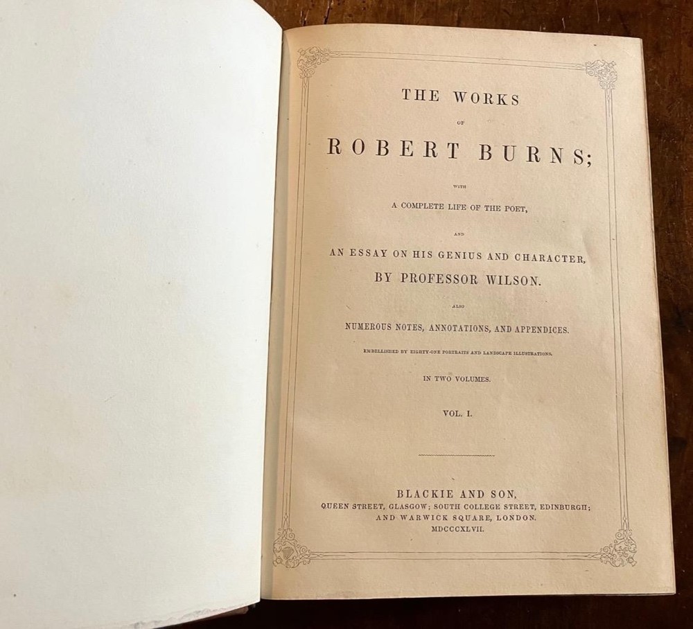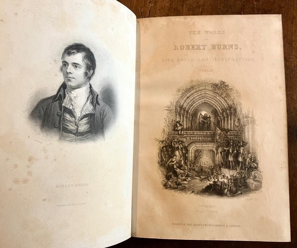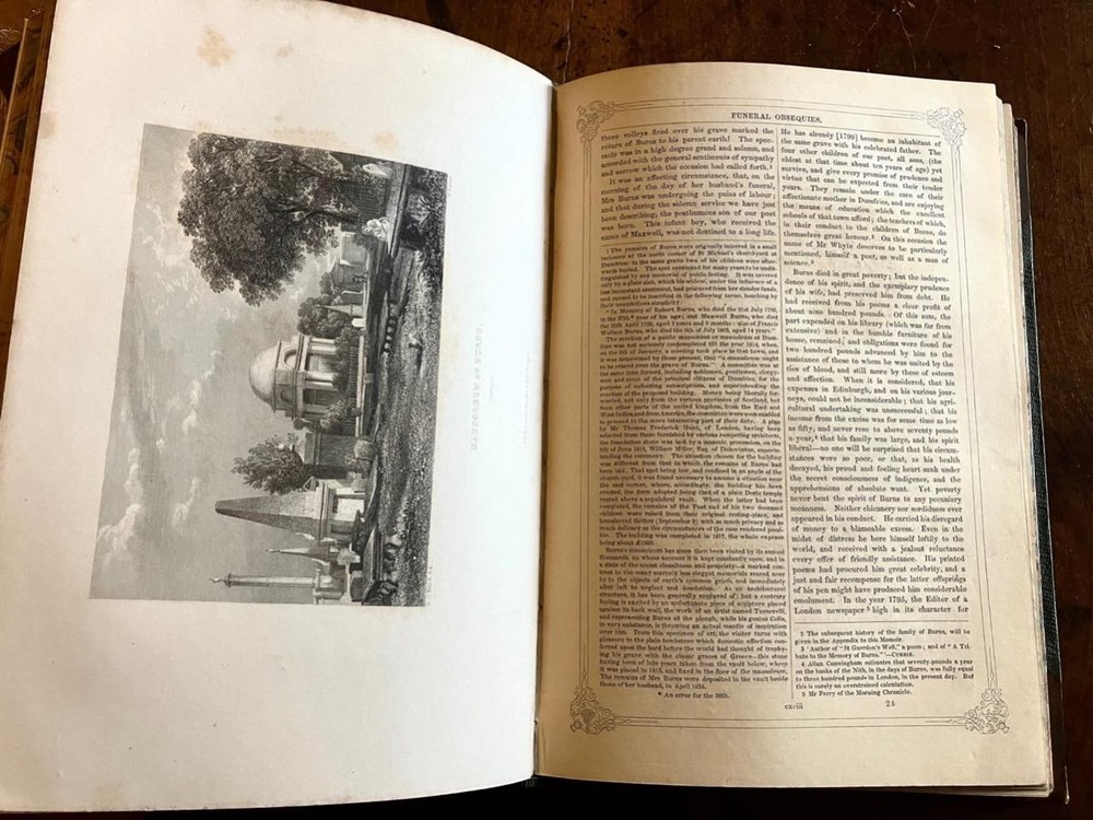 Please scroll down for images & condition report 1847 WORKS OF ROBERT BURNS Leather Bound Set NUMEROUS ENGRAVINGS 2 x Volumes 1847 WORKS OF ROBERT BURNS Leather Bound Set NUMEROUS ENGRAVINGS 2 x Volumes Click images to enlarge Description THE WORKS OF ROBERT BURNS WITH A COMPLETE LIFE OF THE POET & AN ESSAY ON HIS GENIUS & CHARACTER BY PROFESSOR WILSON PUBLISHED BY BLACKIE & SON, GLASGOW 1847 COMPLETE SET IN TWO VOLUMES HARDBACKS BOUND IN 19TH CENTURY HALF LEATHER BINDINGS WITH MARBLED ENDPAPERS & PAGES EDGES, FRONTIS & AN EXTRA ILLUSTRATED TITLE PAGE TO EACH VOLUME, NUMEROUS FULL PAGE STEEL ENGRAVINGS TO EACH VOLUME, EACH MEASURES APPROX 10 x 7 INCHES MINOR RUBBING OR MINOR MARKS TO LEATHER COVERS, MINOR BUMPS TO CORNERS, OCCASIONAL LIGHT - MODERATE FOXING MOSTLY TO MARGINS OF ENGRAVINGS & ENDPAPERS, OCCASIONAL MINOR CREASES TO PAGES AT INNER MARGINS, NAME OF JAMES HARVEY TO BASE OF SPINES [POSSIBLE OWNER OR BINDER] OVERALL IN VERY GOOD CONDITION WITH GILT TO SPINES BRIGHT & BOARDS FIRMLY ATTACHED, PLEASE CHECK MY E-BAY SHOP FOR RARE & ANTIQUARIAN BOOKS,MAPS & PRINTS Add me to your Favourite Seller Visit My eBay Store Images sell! Get Supersized Images & Free Image Hosting Create your brand with Auctiva's Customizable Templates. Attention Sellers - Get Templates Image Hosting, Scheduling at Auctiva.com. Track Page Views With Auctiva's Counter
